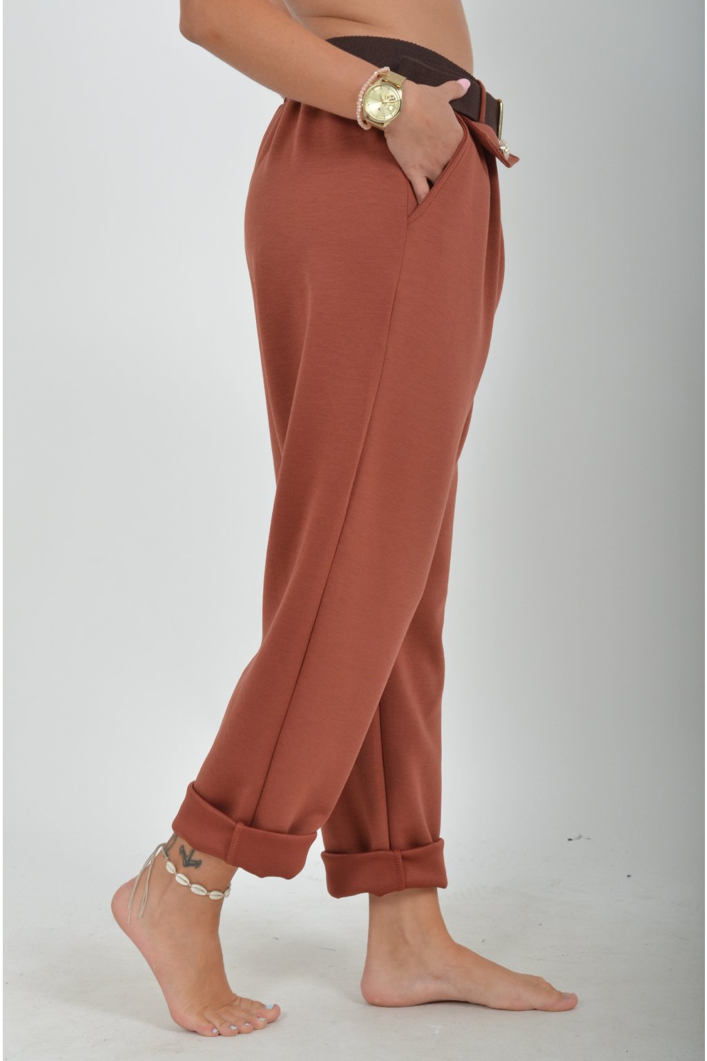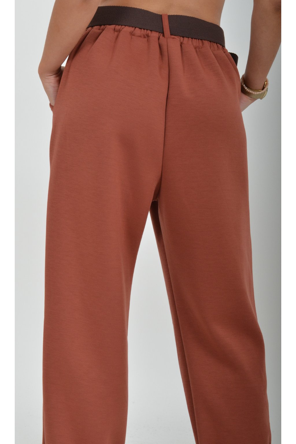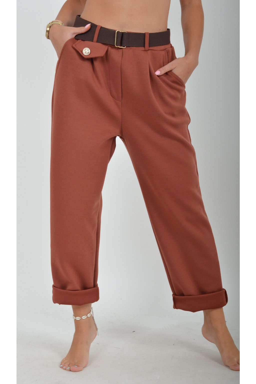 Elegantní kalhoty teplákového stylu s kapsami na bocích. V pase je zapracovaná guma a součástí kalhot je pásek pro libovolné stažení. Kalhoty jsou z velice příjemného materiálu a jsou vhodné pro každodenní nošení.
