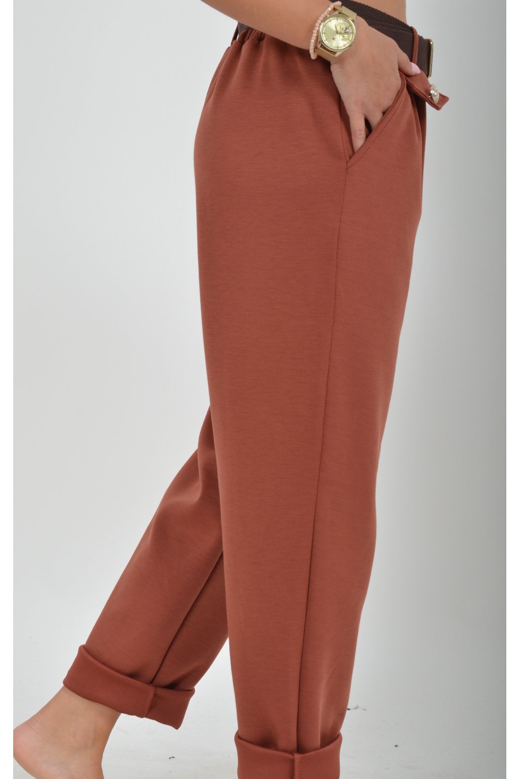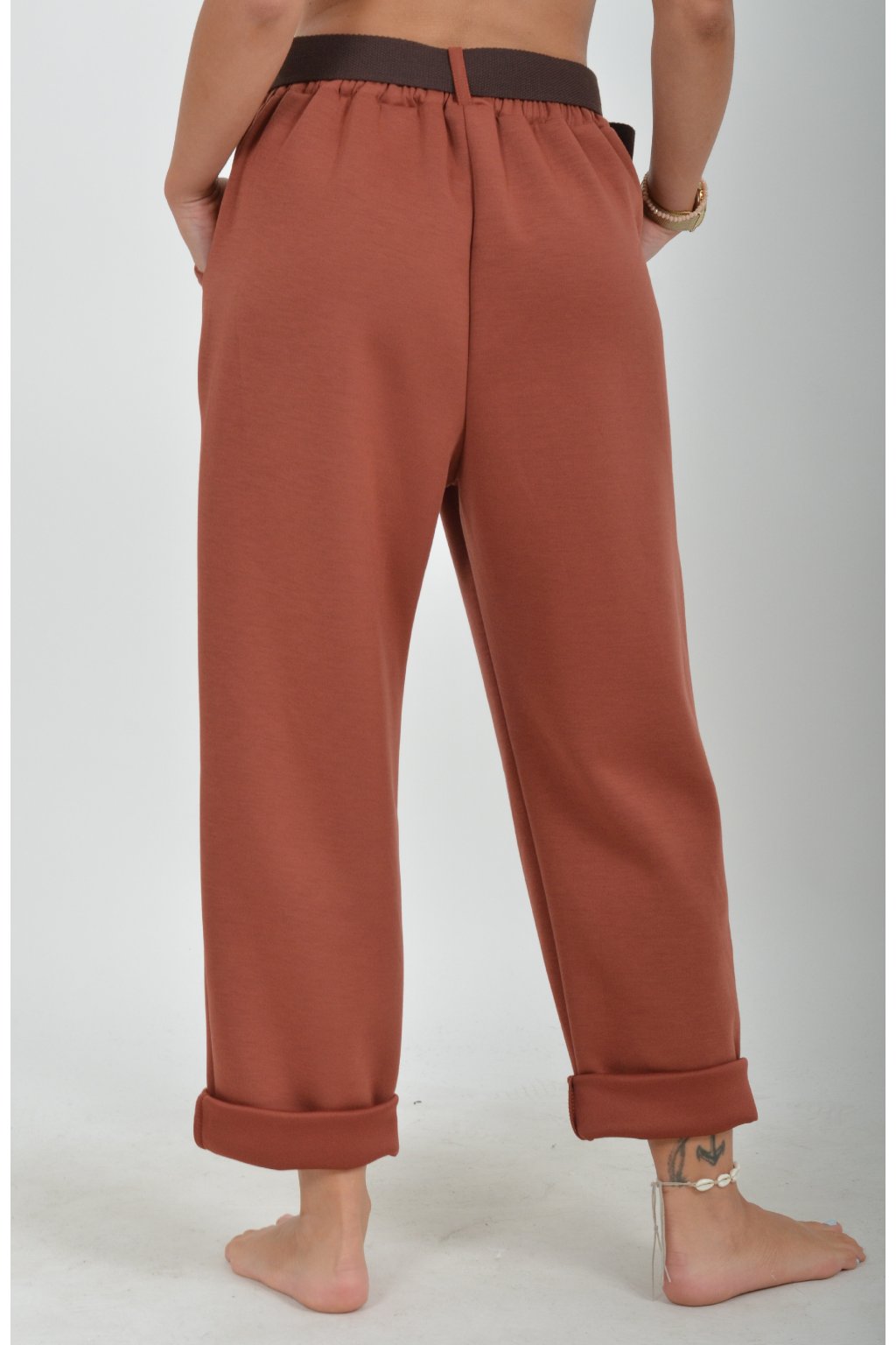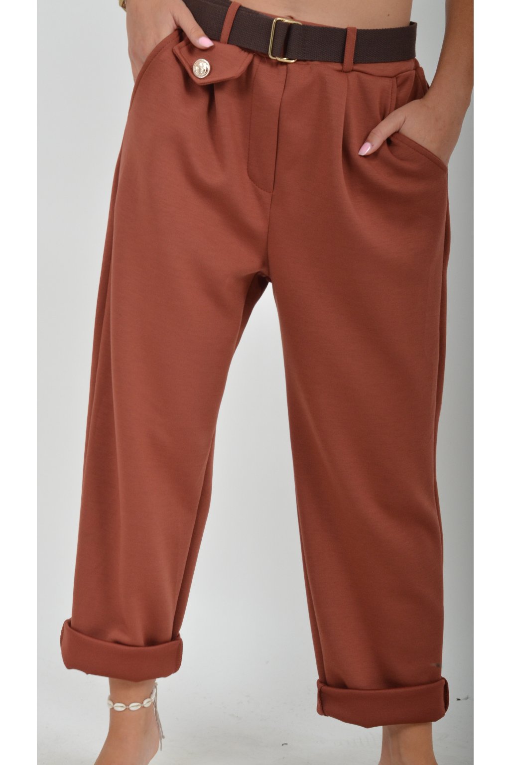 Elegantní kalhoty teplákového stylu s kapsami na bocích. V pase je zapracovaná guma a součástí kalhot je pásek pro libovolné stažení. Kalhoty jsou z velice příjemného materiálu a jsou vhodné pro každodenní nošení.
