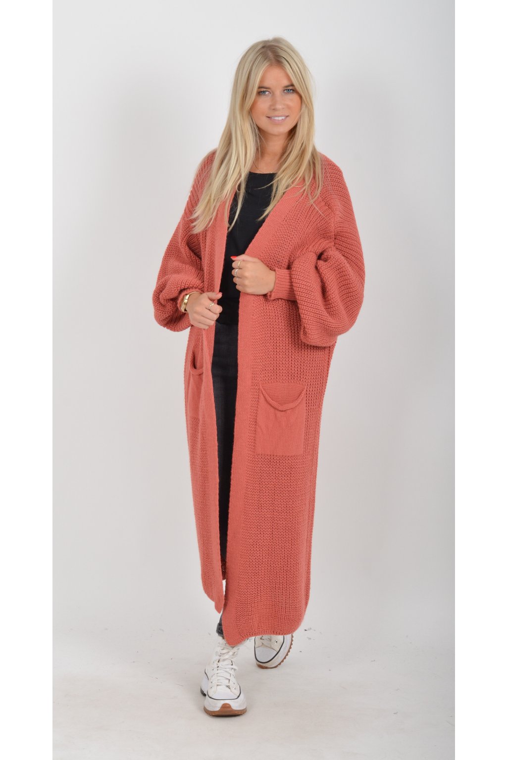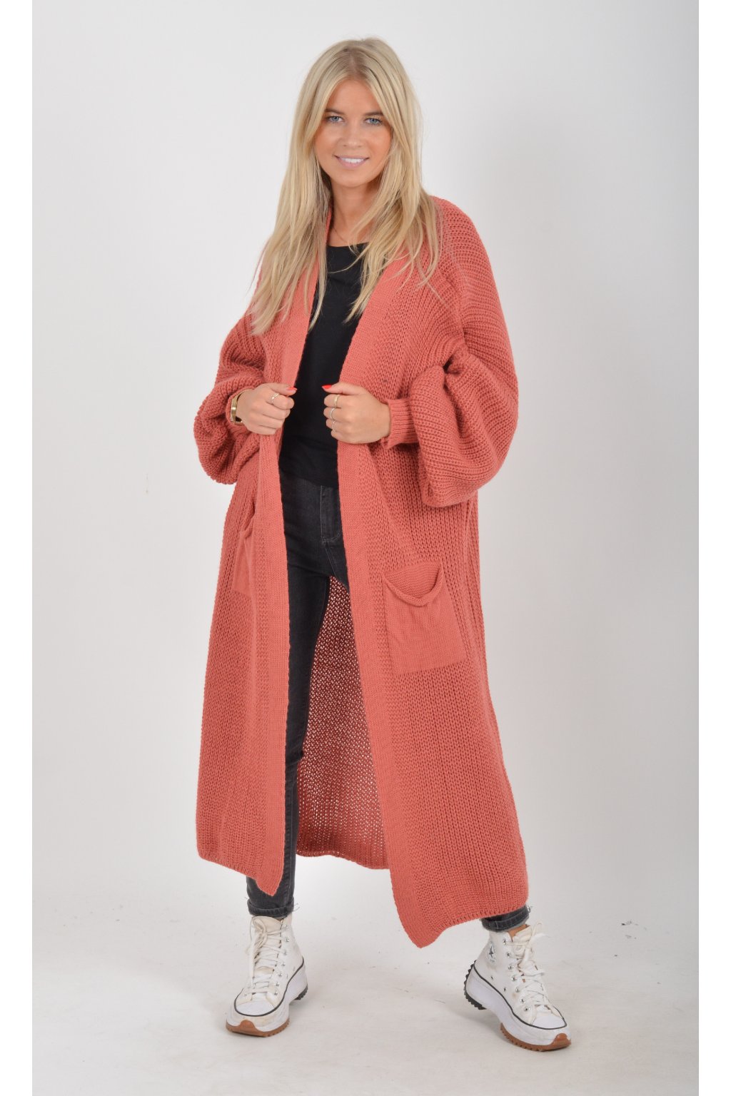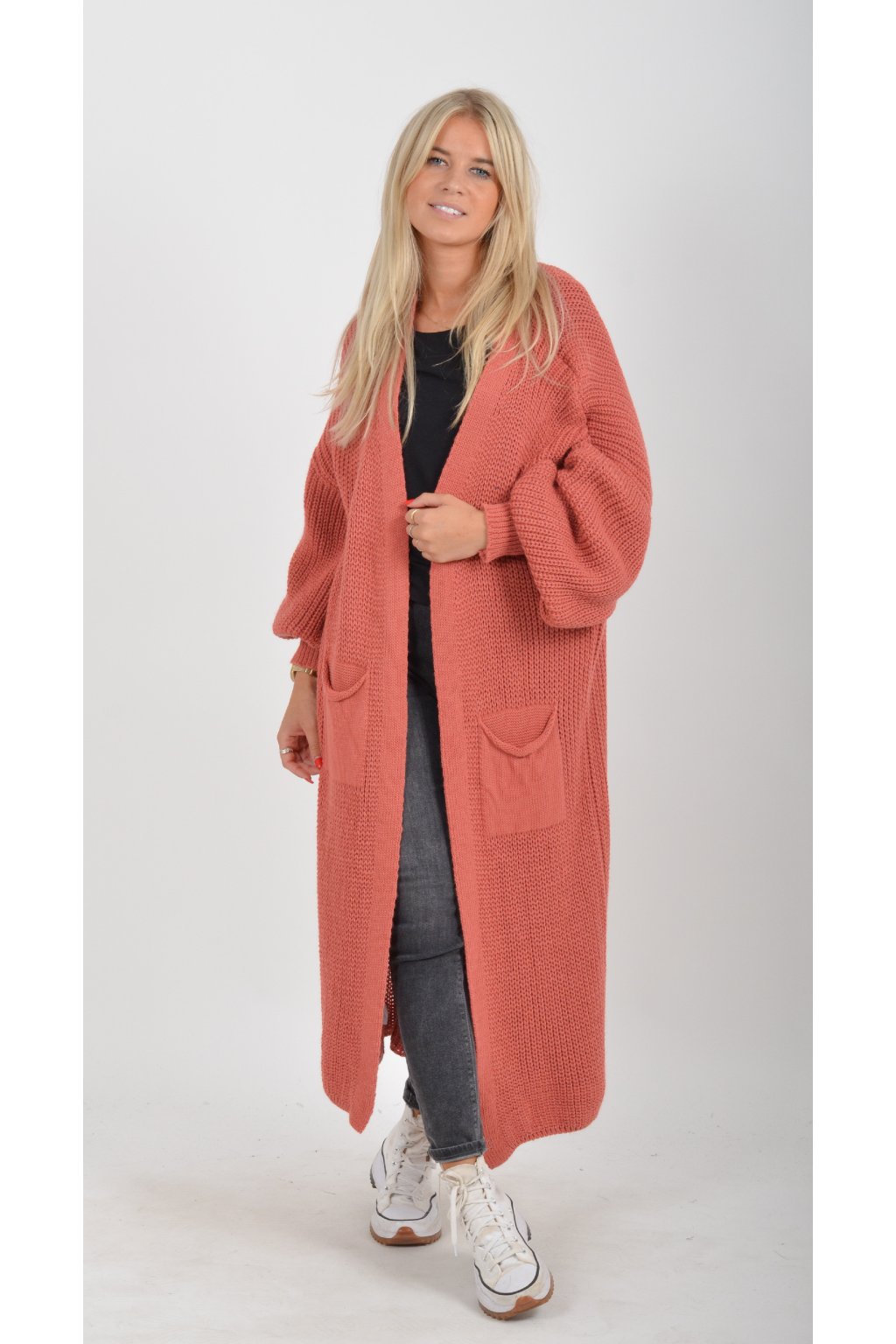 Dlouhý svetrový kardigan z velice jemného , příjemného a nekousavého materiálu. V přadní části má kapsy. rukávy má do nápletu.