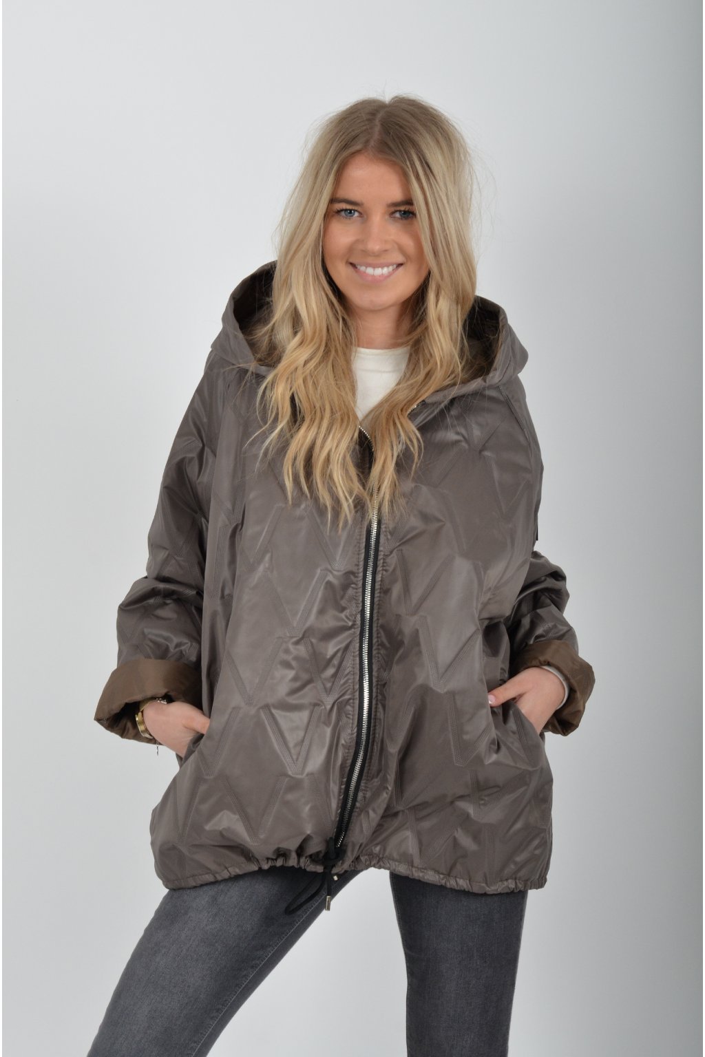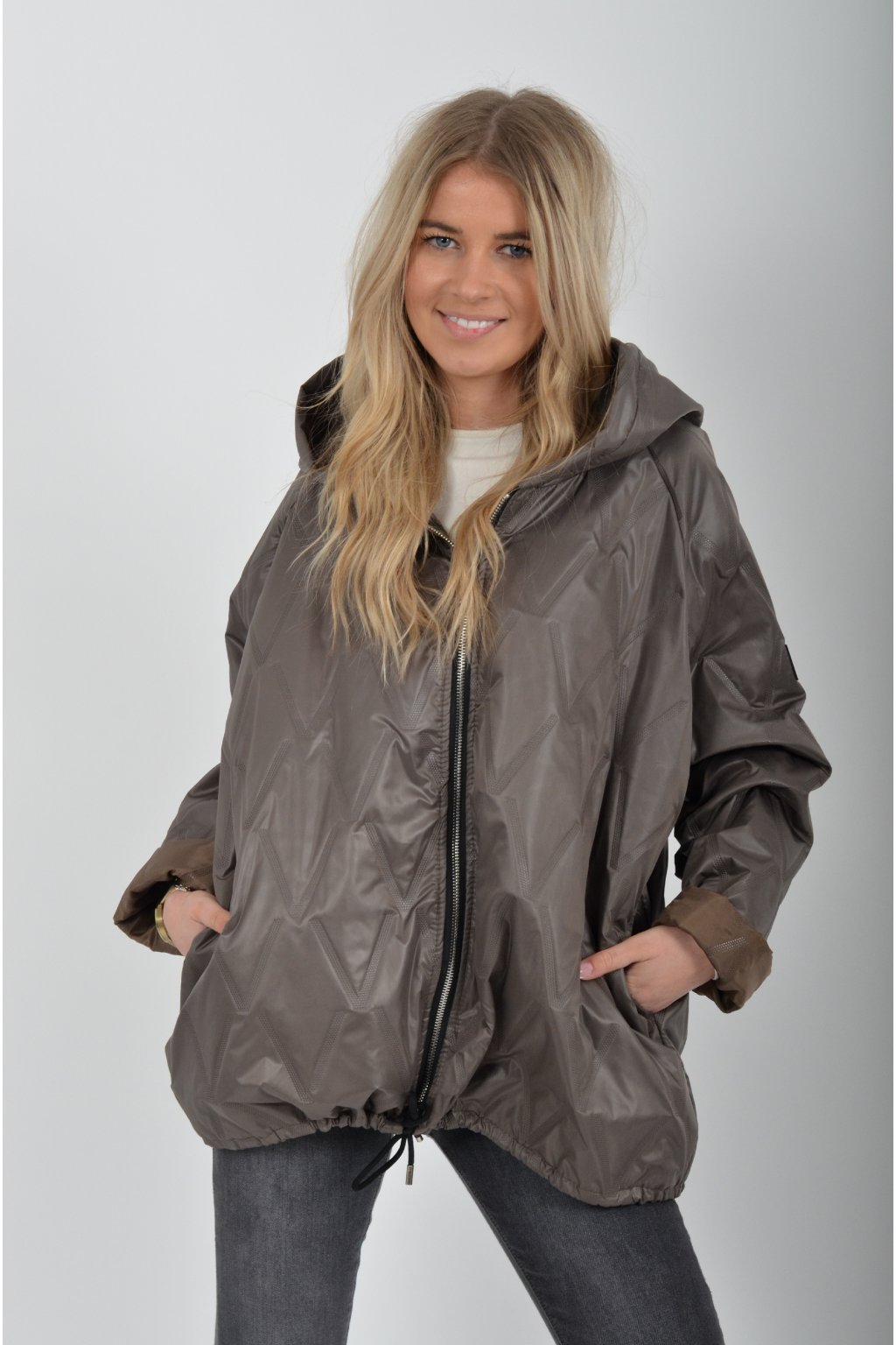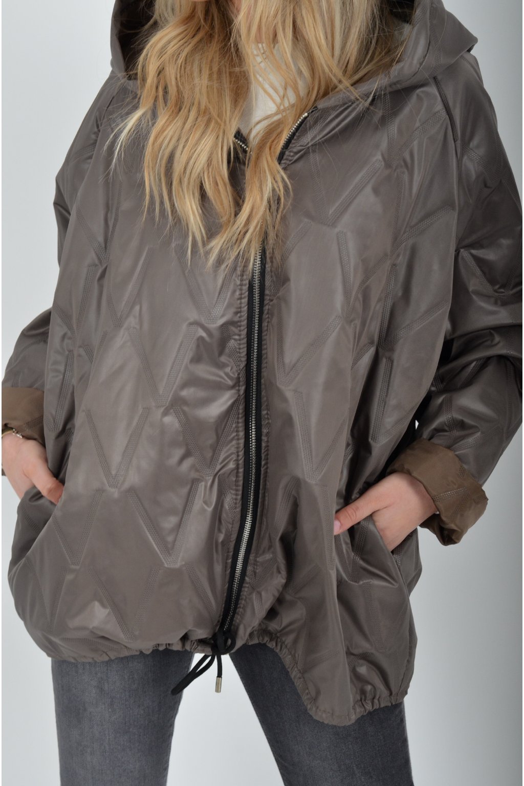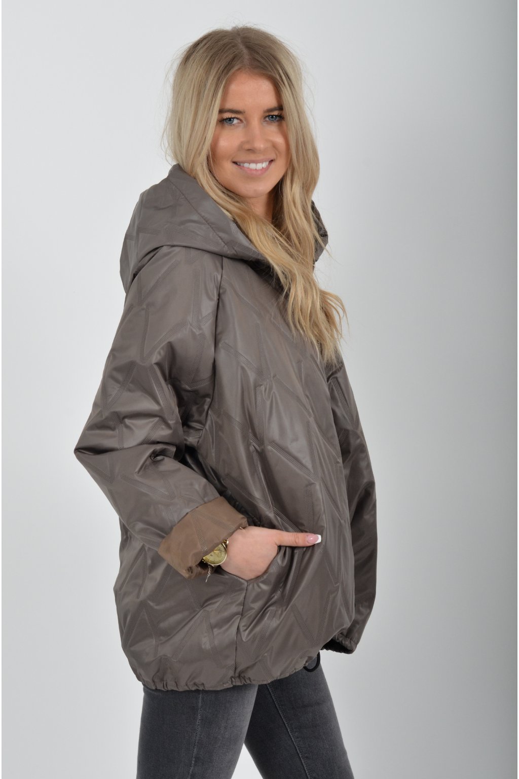 Přechodová bunda s kapuci a kapsami na bocích volnějšího střihu. Bunda je vyrobena z odlehčeného materiálu, tedy je ideální pro jarní nošení. Ve spodní části je zapracovaná tkanice pro libovolné stažení.
