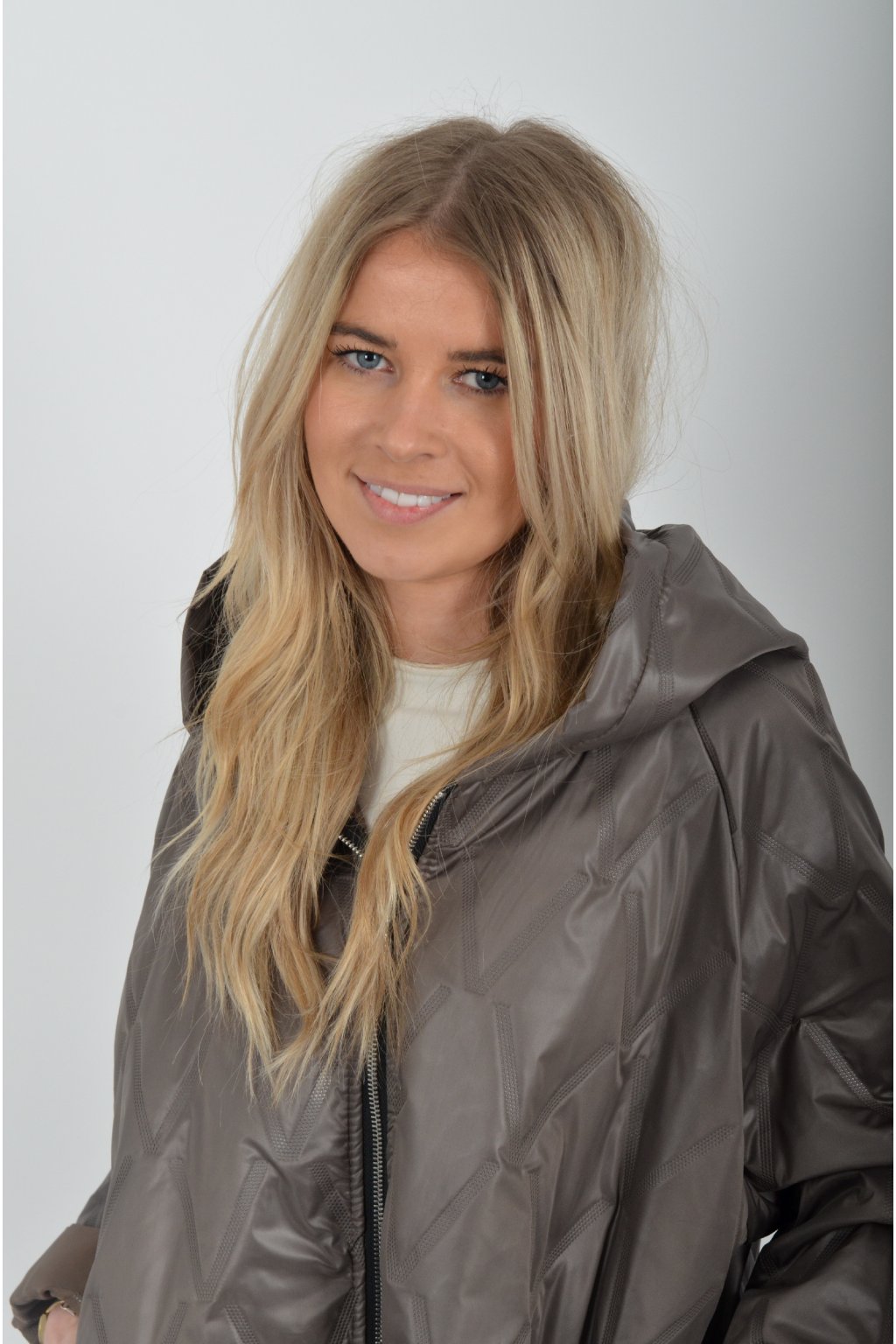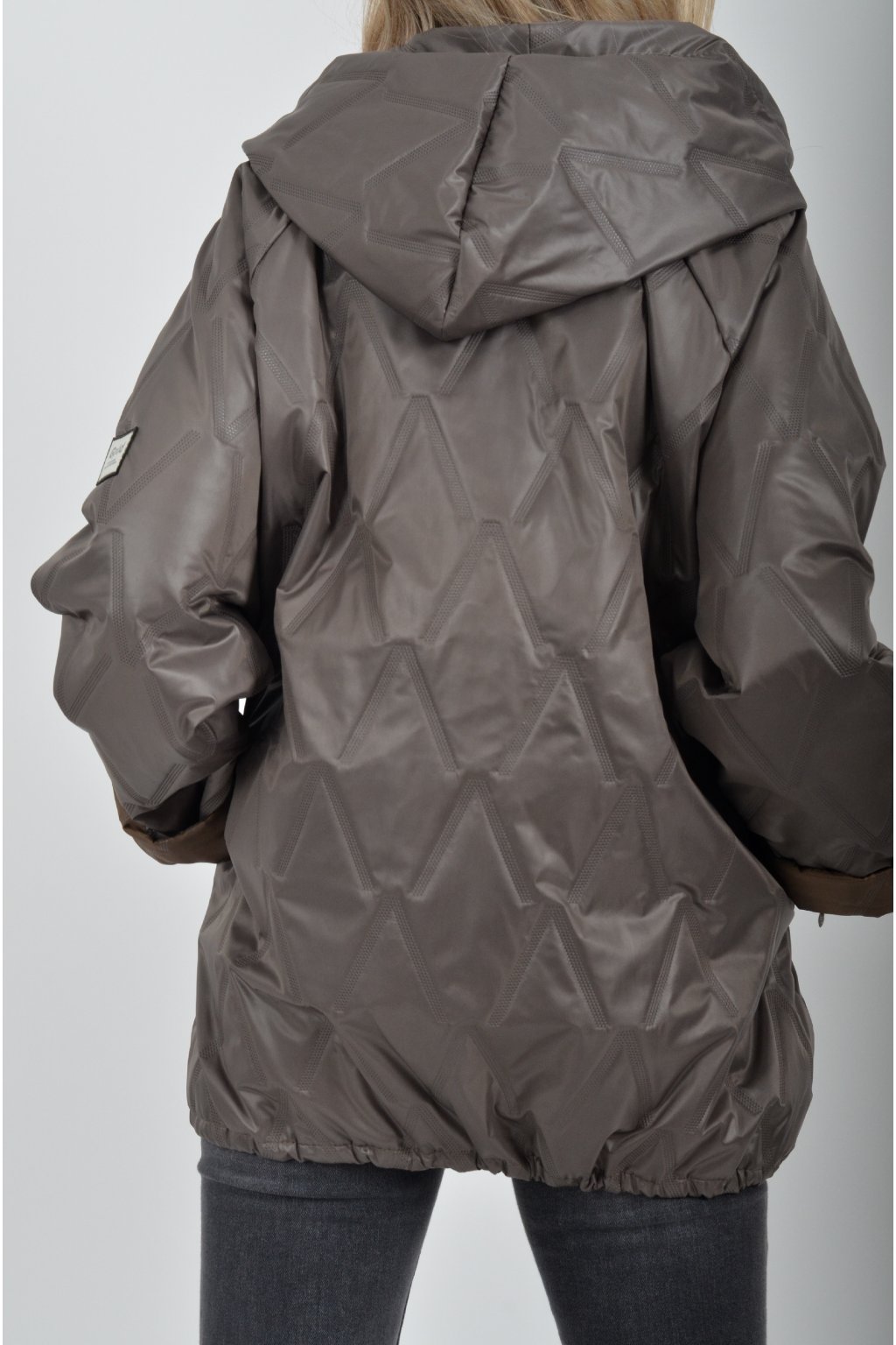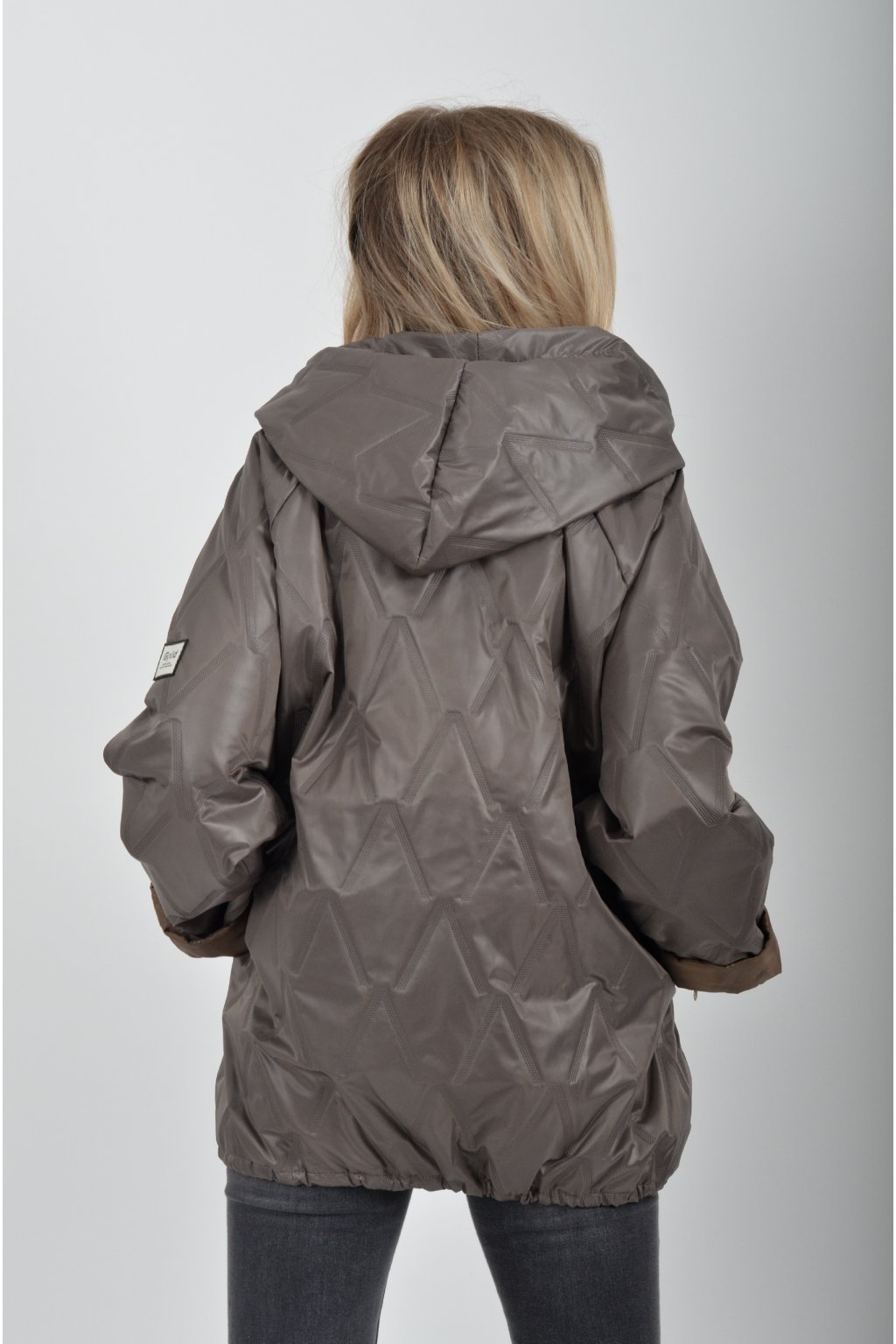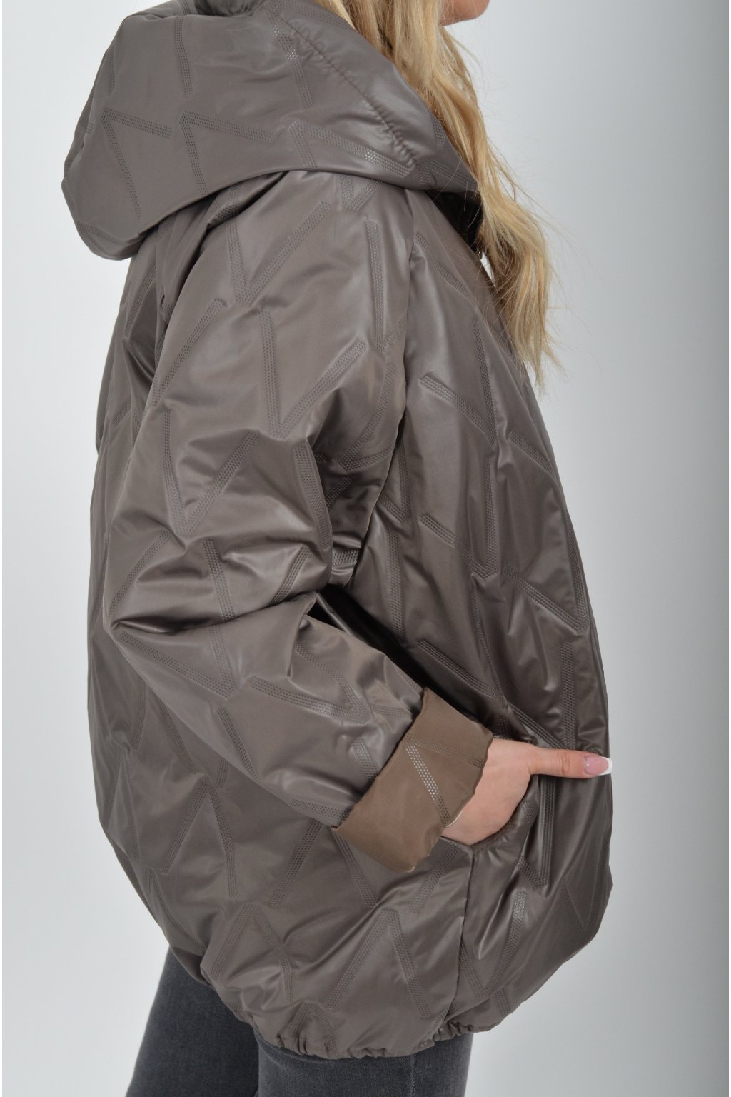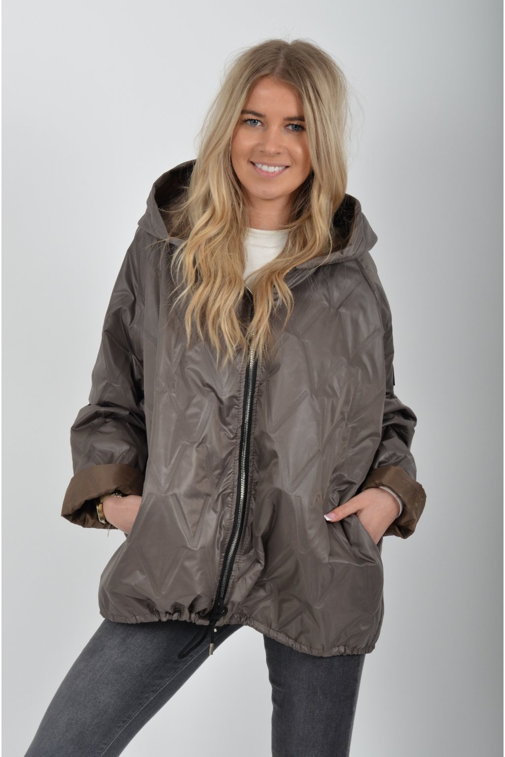 Přechodová bunda s kapuci a kapsami na bocích volnějšího střihu. Bunda je vyrobena z odlehčeného materiálu, tedy je ideální pro jarní nošení. Ve spodní části je zapracovaná tkanice pro libovolné stažení.