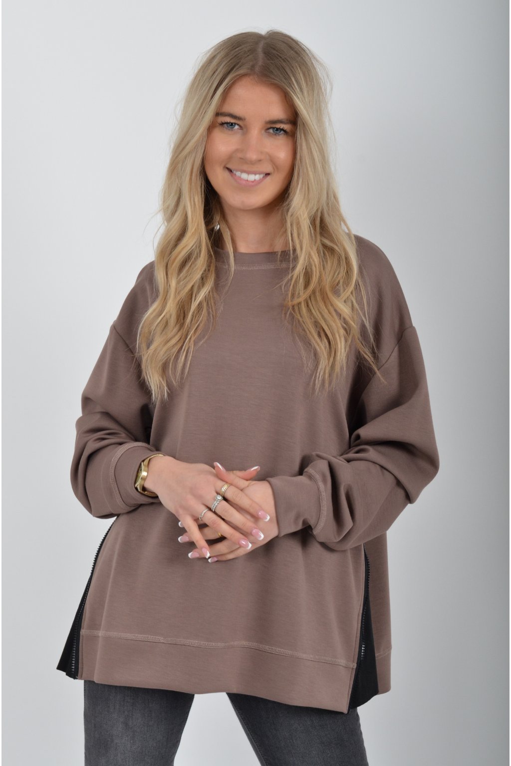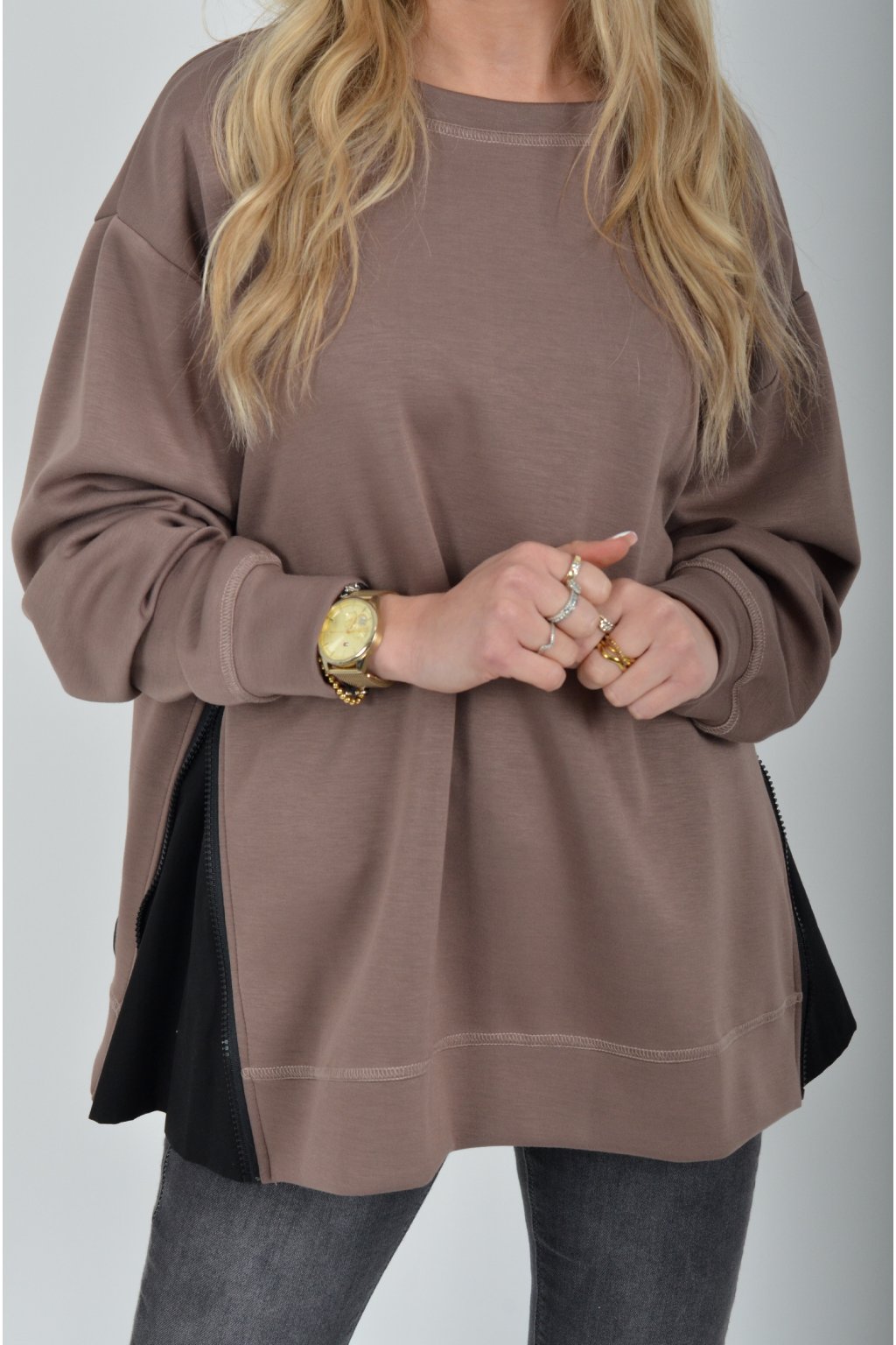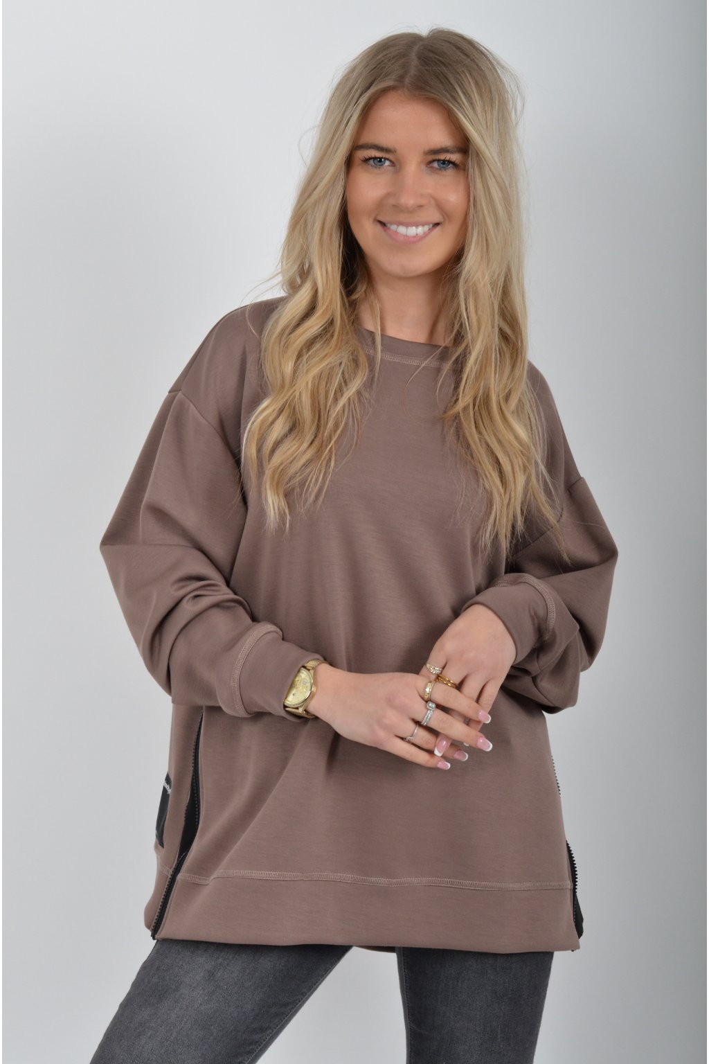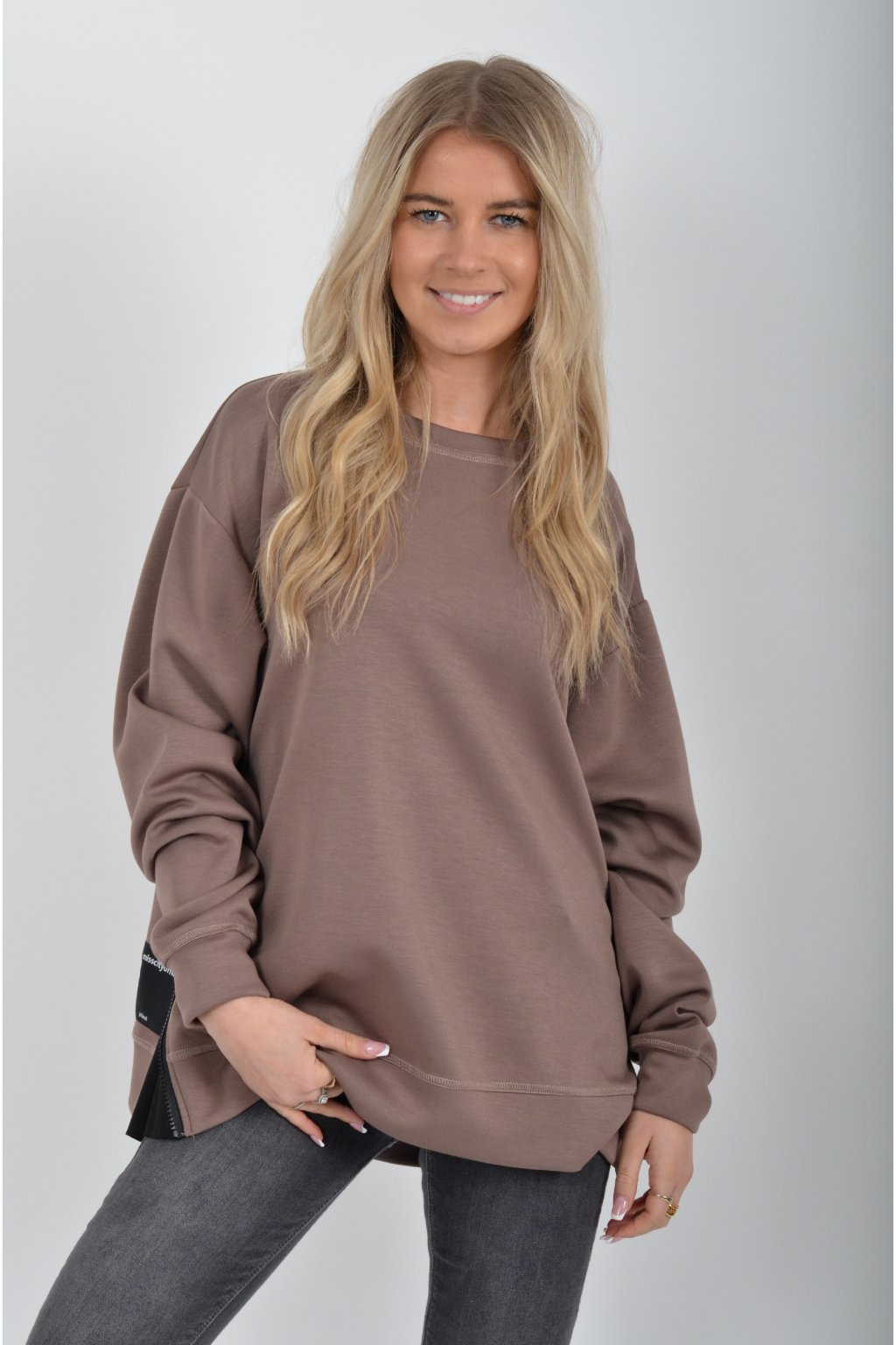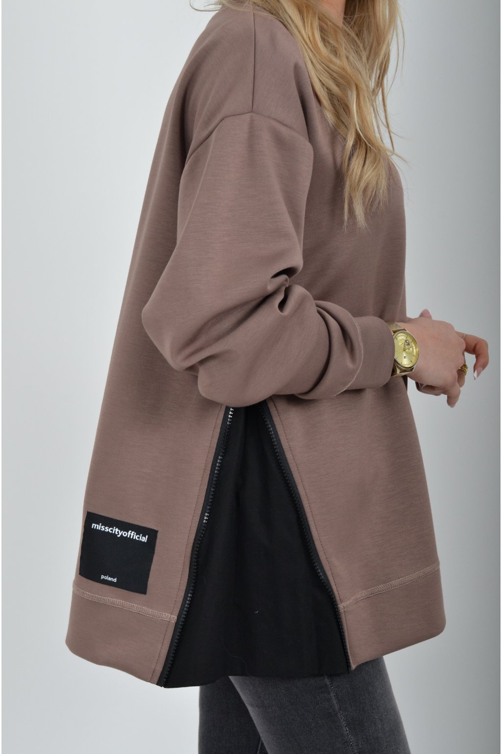 Mikina značky Miss City Official. Je vyrobena z velice příjemného materiálu. Na bocích má zipy, pomocí kterých lze udělat na halence rozparky.
