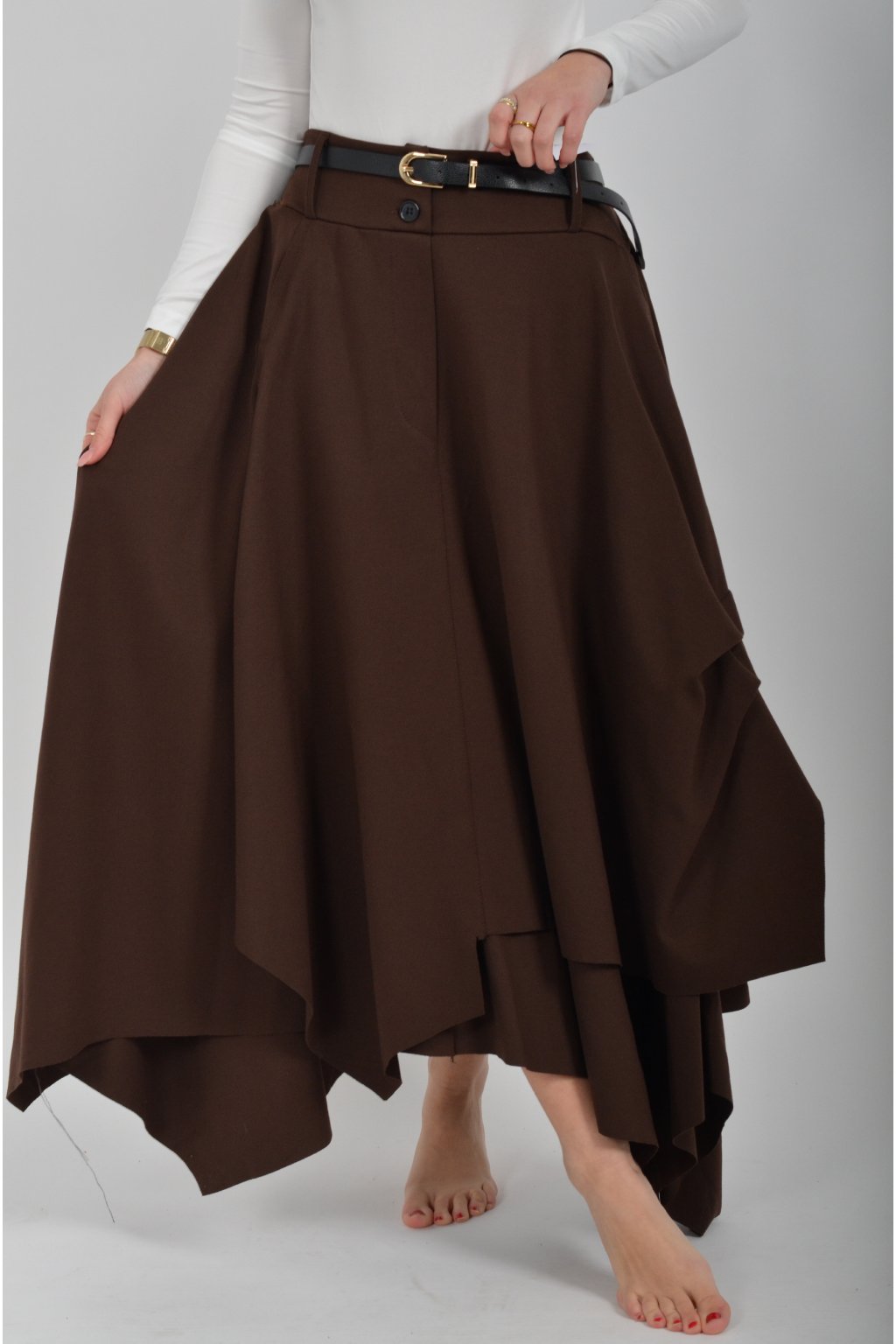 Sukně áčkového střihu s atypickým střihem a dvojitou látkou Sukně má na bocích kapsy a navíc koženkový pásek, který lze odejmut a použit na jiné modely. V pase je zapracovaná guma a zapínání na 2 knoflíky.
