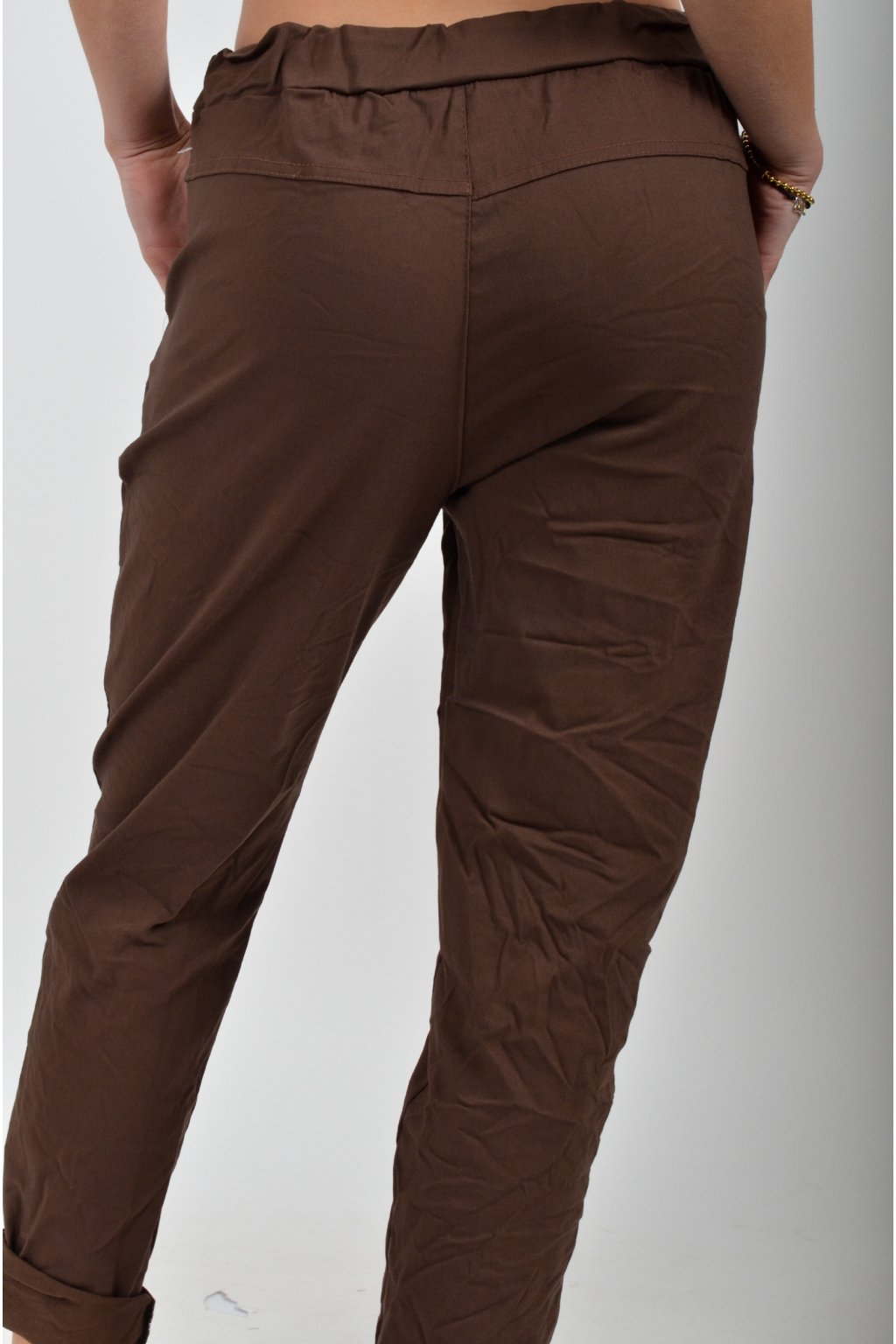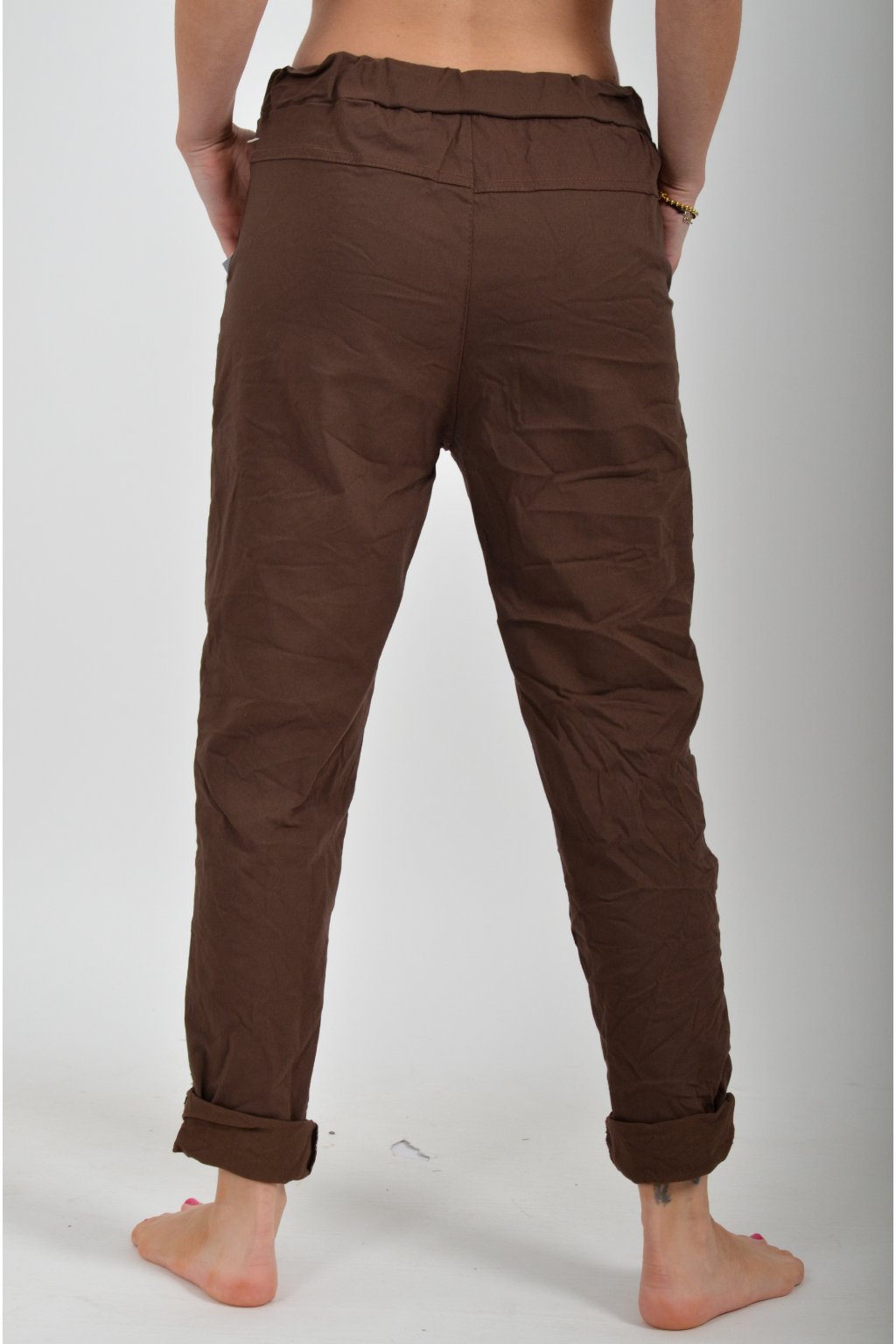Jednobarevné kalhoty s kapsami na bocích, které se krásně přizpůsobí postavě, díky podílu elastanu. Jsou vhodné pro každodenní nošení. V pase je zapracovaná guma a tkanička pro libovolné stažení.