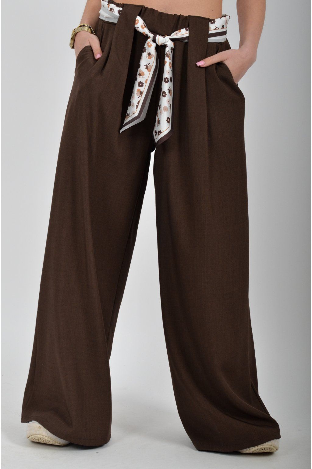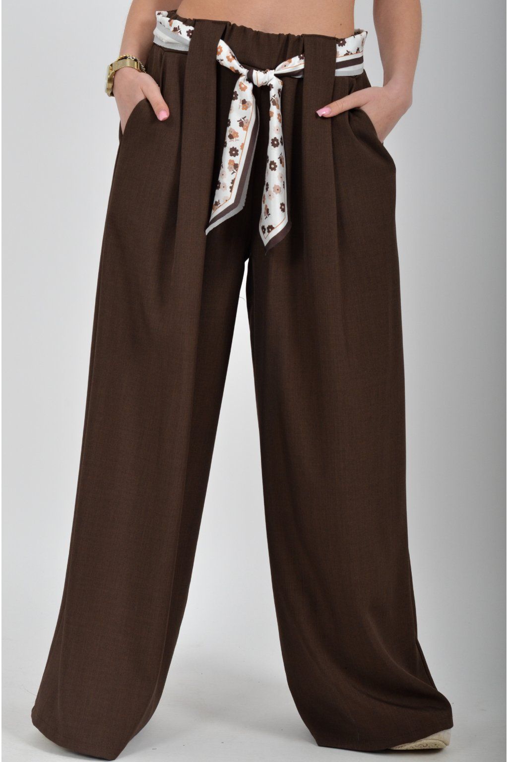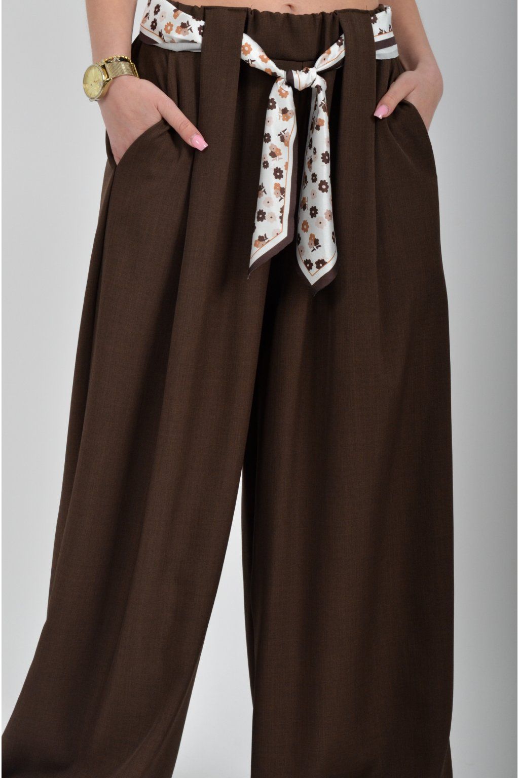 Kalhoty se širokými nohavicemi a kapsami na bocích, které se krásně přizpůsobí postavě, díky podílu elastanu. Jsou vhodné pro každodenní nošení. V pase je zapracovaná guma a pásek ve formě "šátku" pro libovolné stažení.