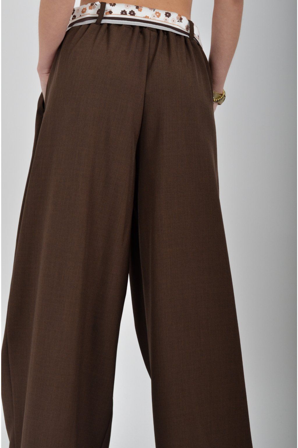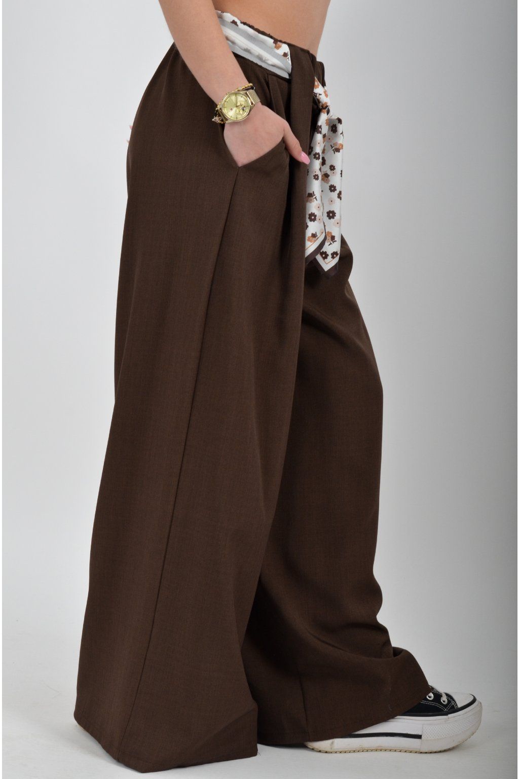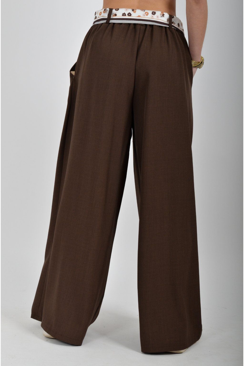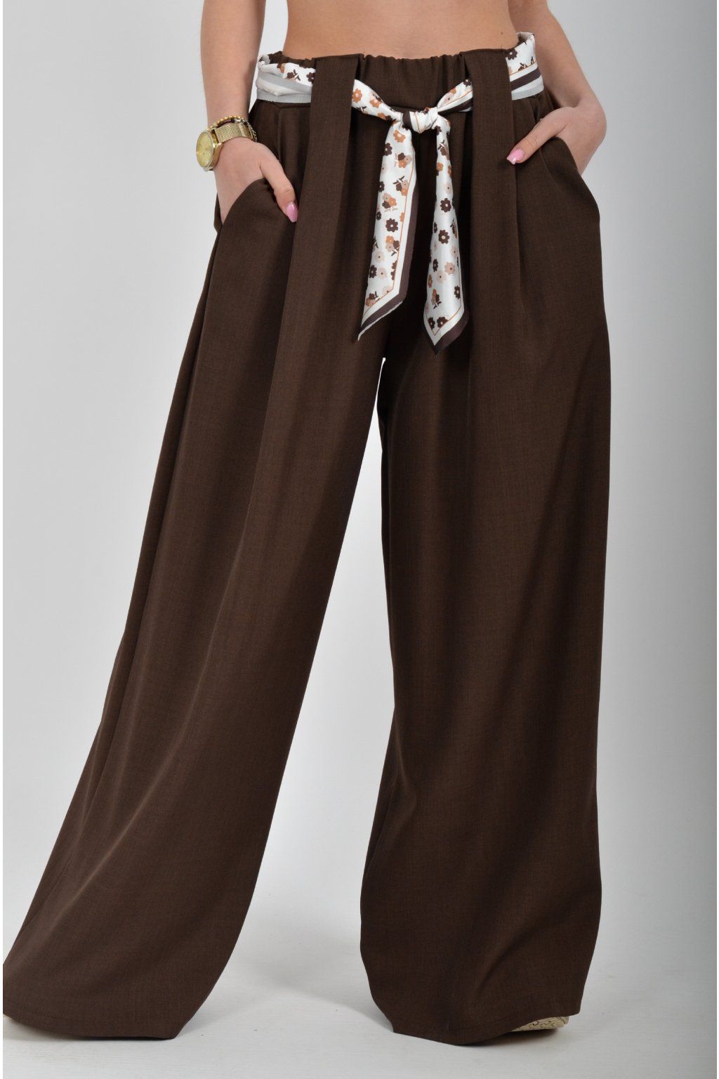 Kalhoty se širokými nohavicemi a kapsami na bocích, které se krásně přizpůsobí postavě, díky podílu elastanu. Jsou vhodné pro každodenní nošení. V pase je zapracovaná guma a pásek ve formě "šátku" pro libovolné stažení.