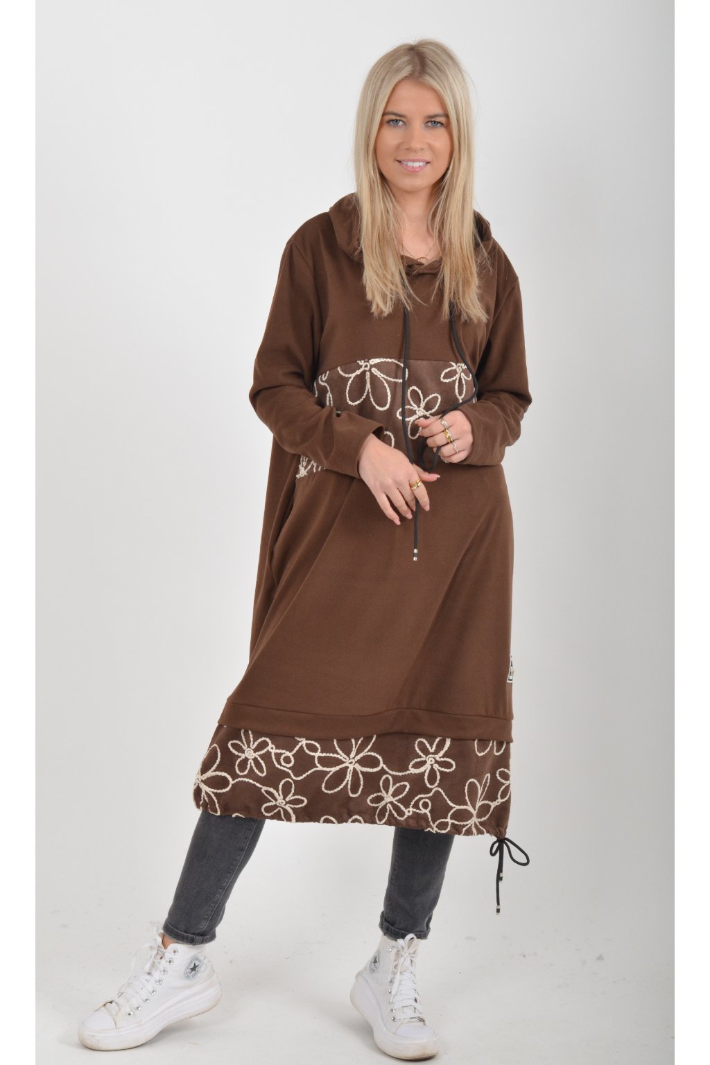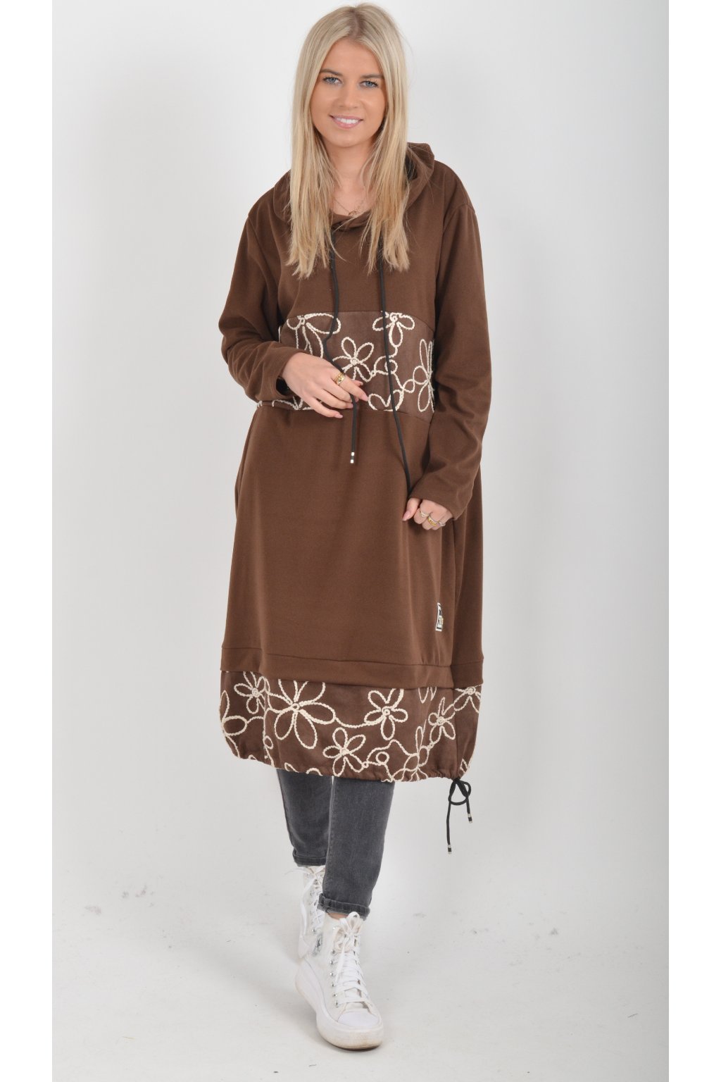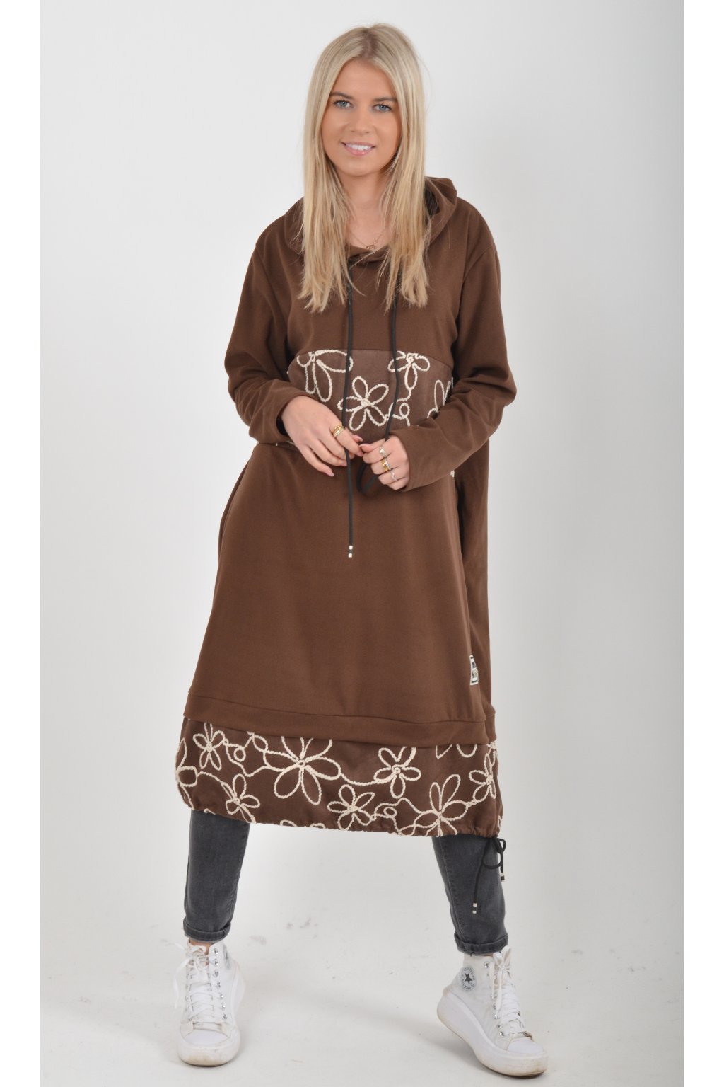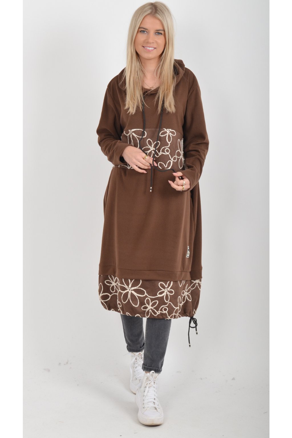 Mikinové šaty s kapucí zdobené vyšívanými kytkami. Mají áčkový střih, dlouhý rukáv a na bocích kapsy. Ve spodní části mají zapracovanou tkaničku pro libovolné stažení. Jsou vyrobené z velice příjemného a lehce zatepleného materiálu.