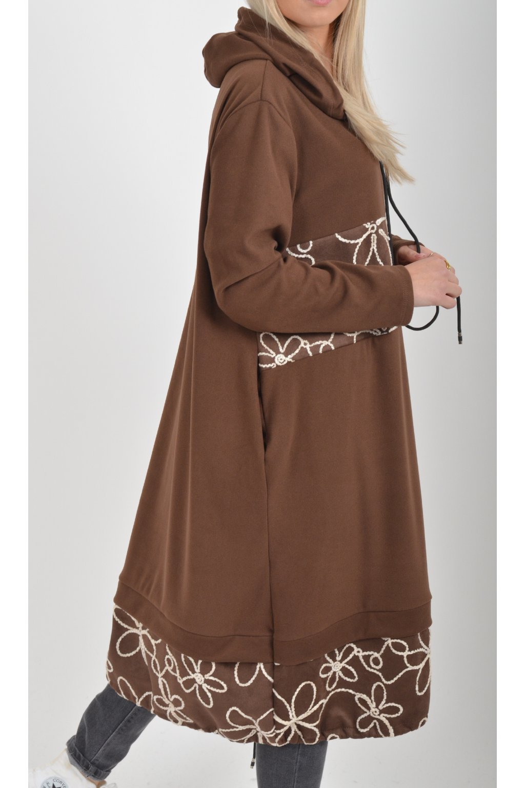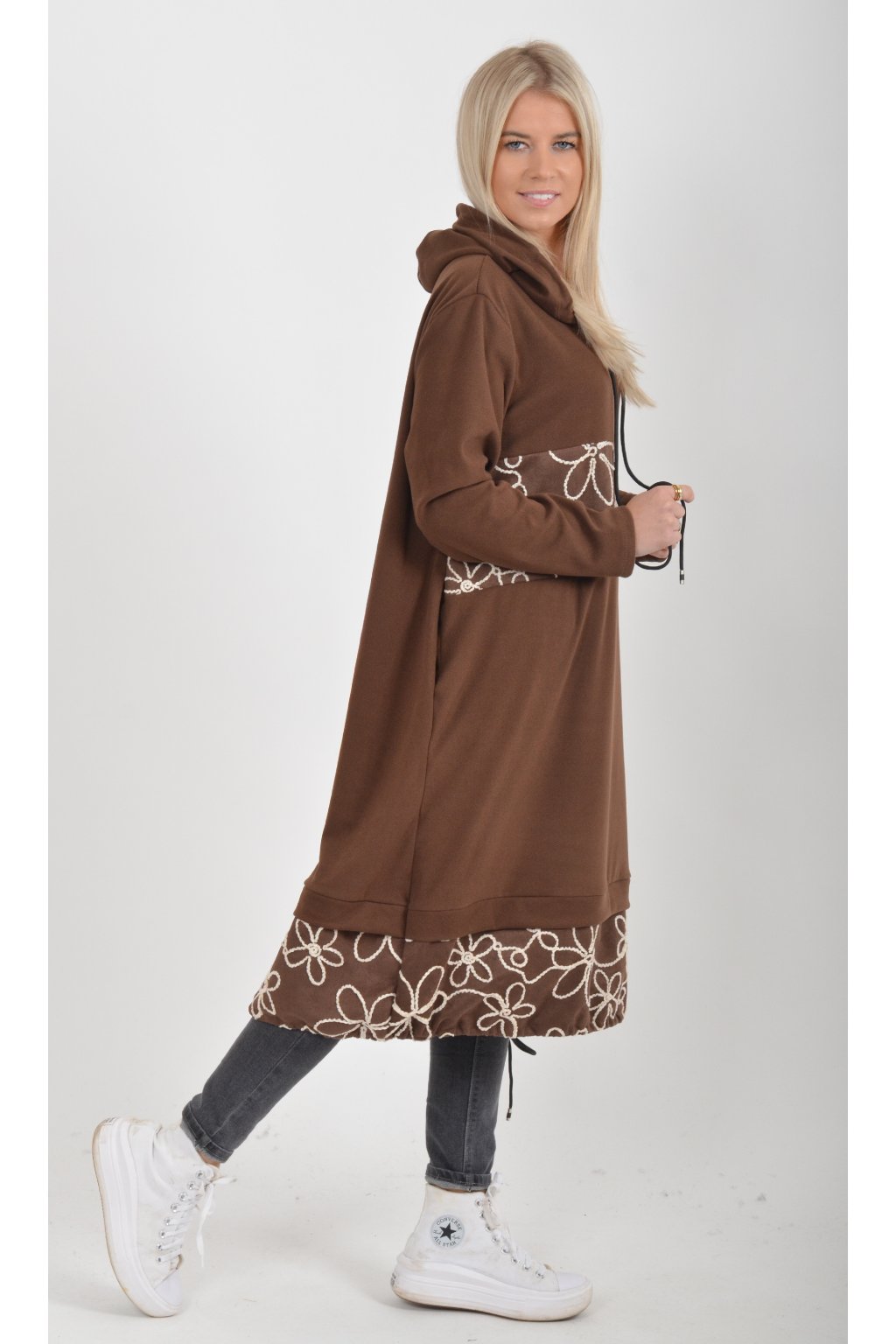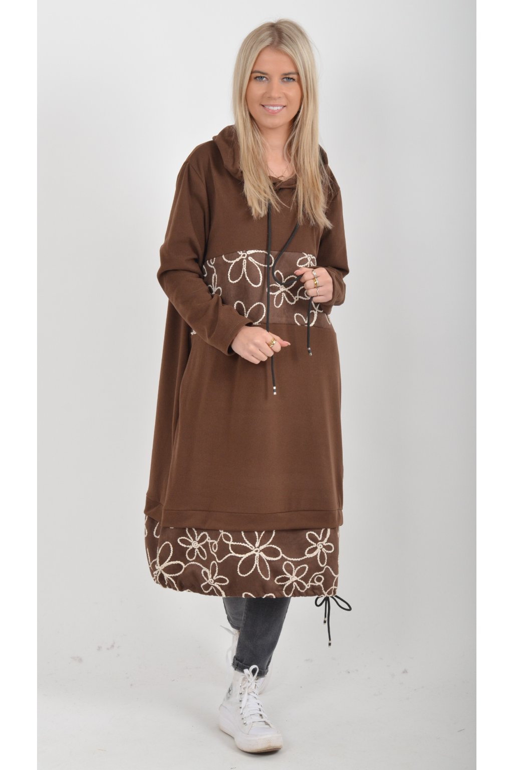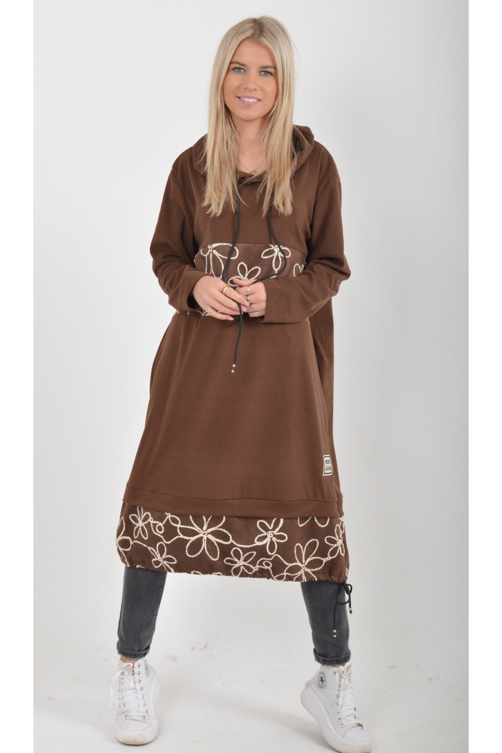 Mikinové šaty s kapucí zdobené vyšívanými kytkami. Mají áčkový střih, dlouhý rukáv a na bocích kapsy. Ve spodní části mají zapracovanou tkaničku pro libovolné stažení. Jsou vyrobené z velice příjemného a lehce zatepleného materiálu.