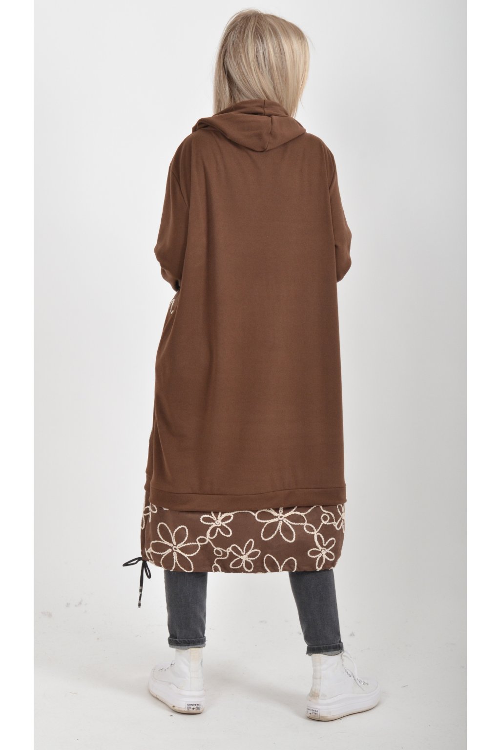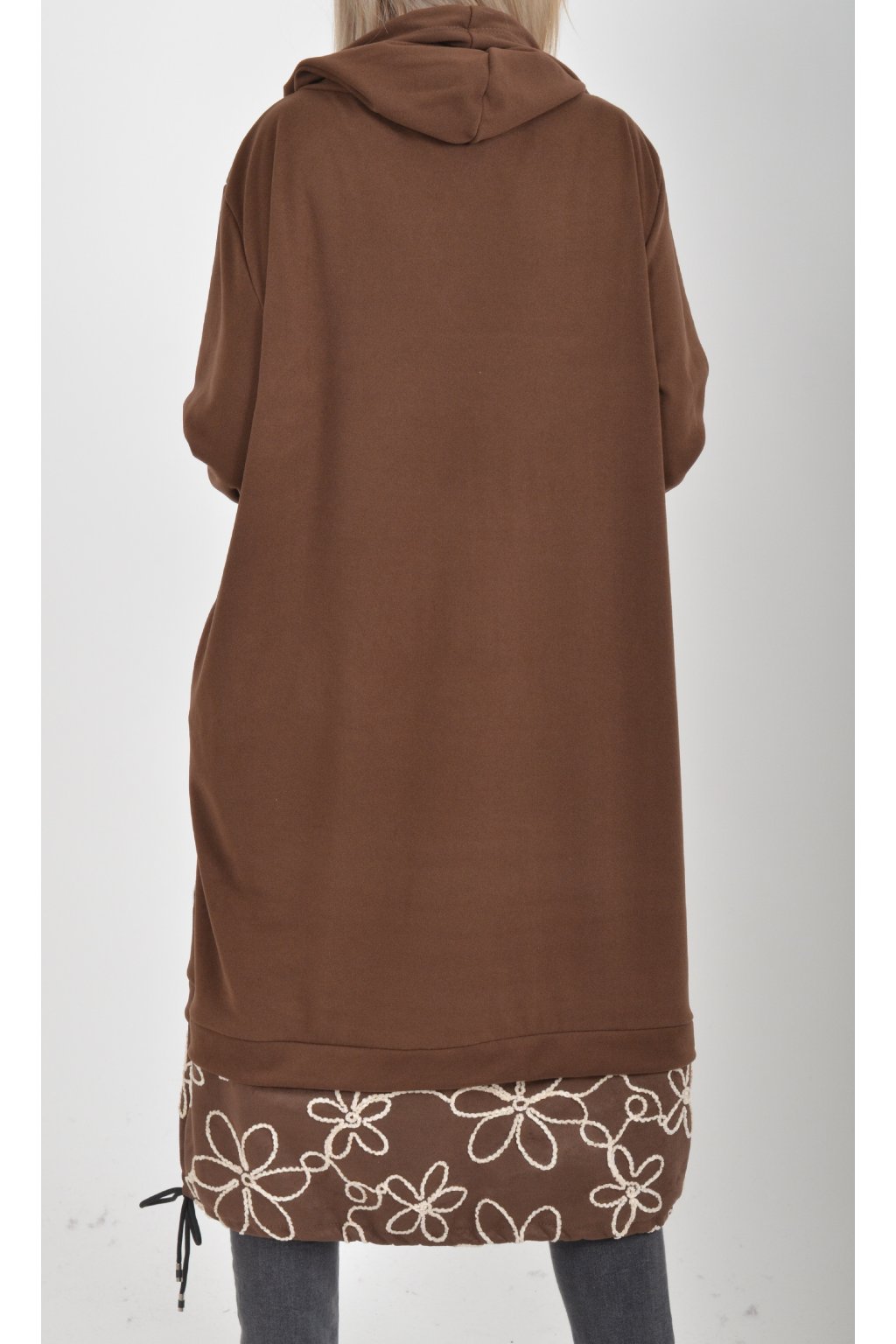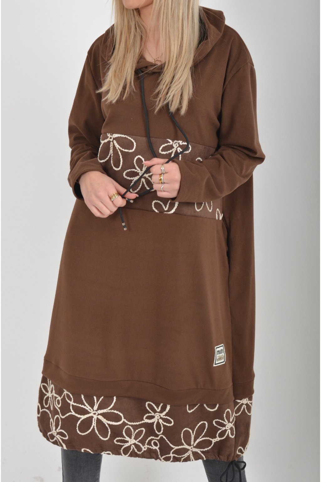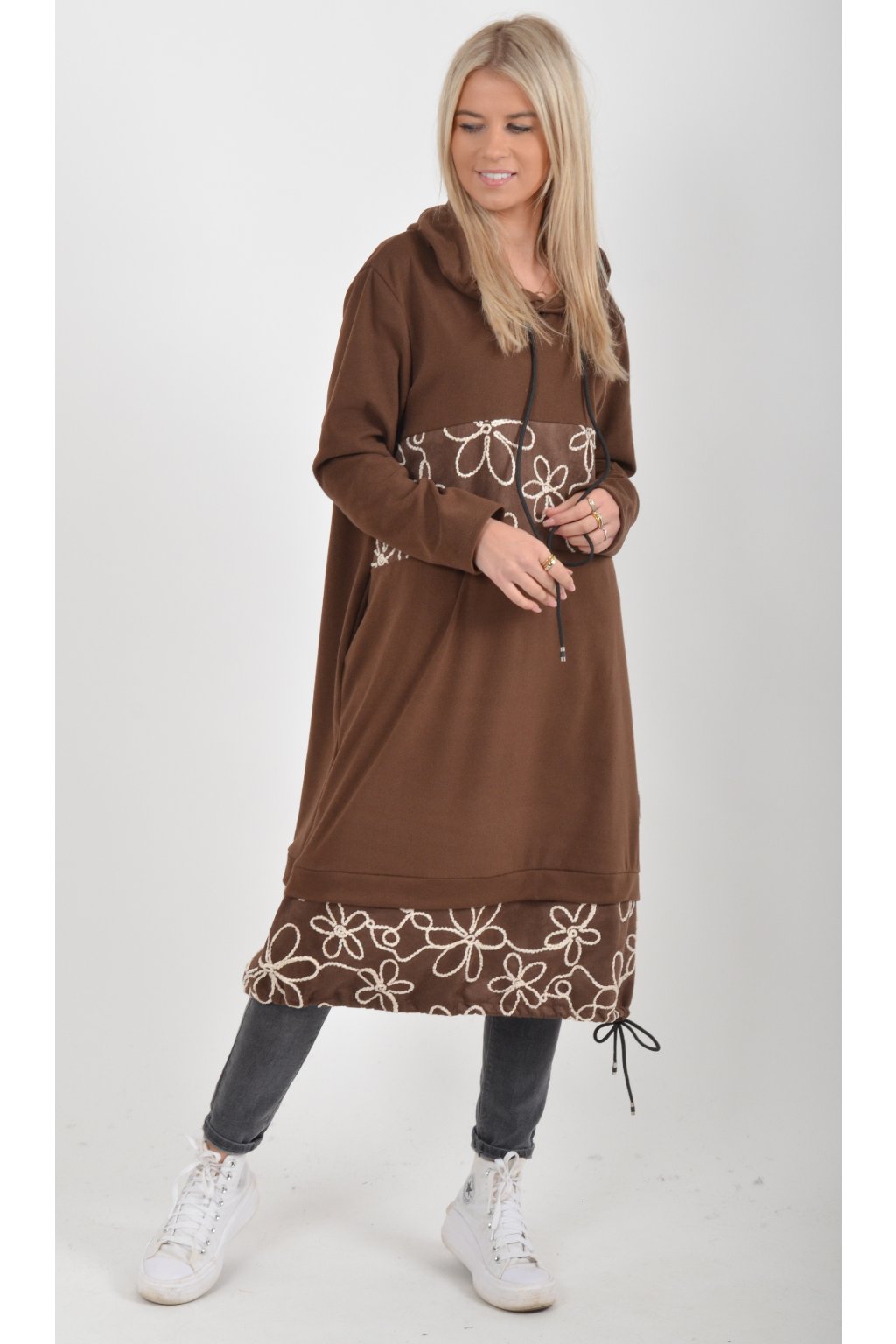 Mikinové šaty s kapucí zdobené vyšívanými kytkami. Mají áčkový střih, dlouhý rukáv a na bocích kapsy. Ve spodní části mají zapracovanou tkaničku pro libovolné stažení. Jsou vyrobené z velice příjemného a lehce zatepleného materiálu.