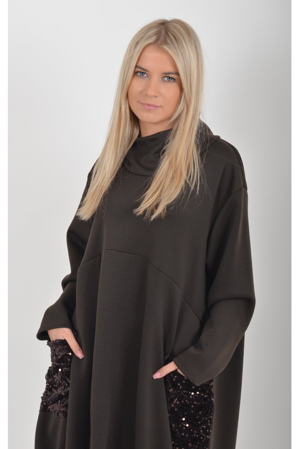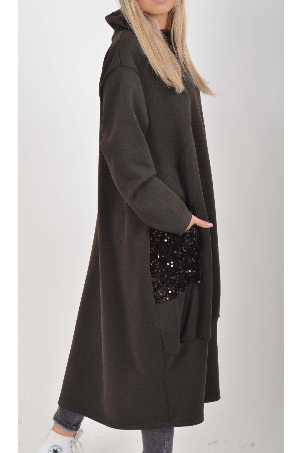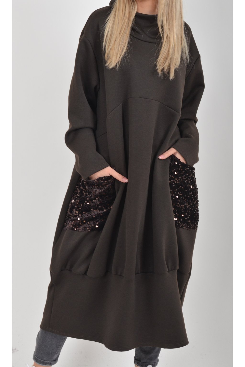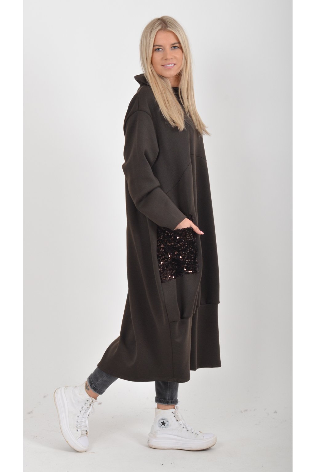 Mikinové šaty zdobené flitry. Mají áčkový střih, dlouhý rukáv a v přední části mají kapsy. Jsou vyrobené z velice příjemného a lehce zatepleného materiálu.