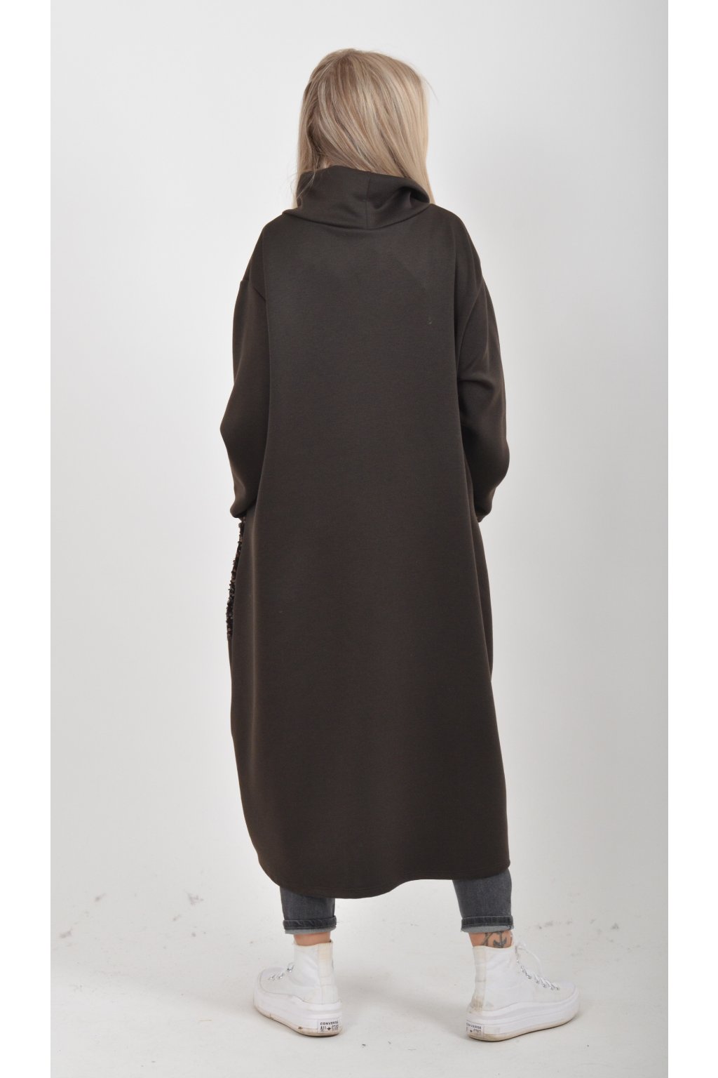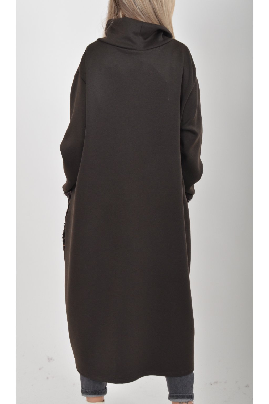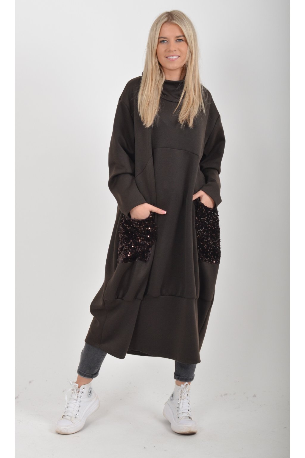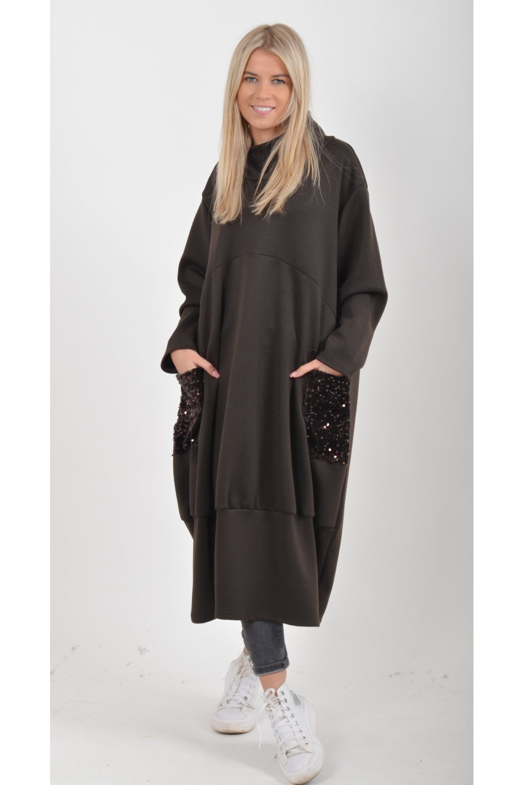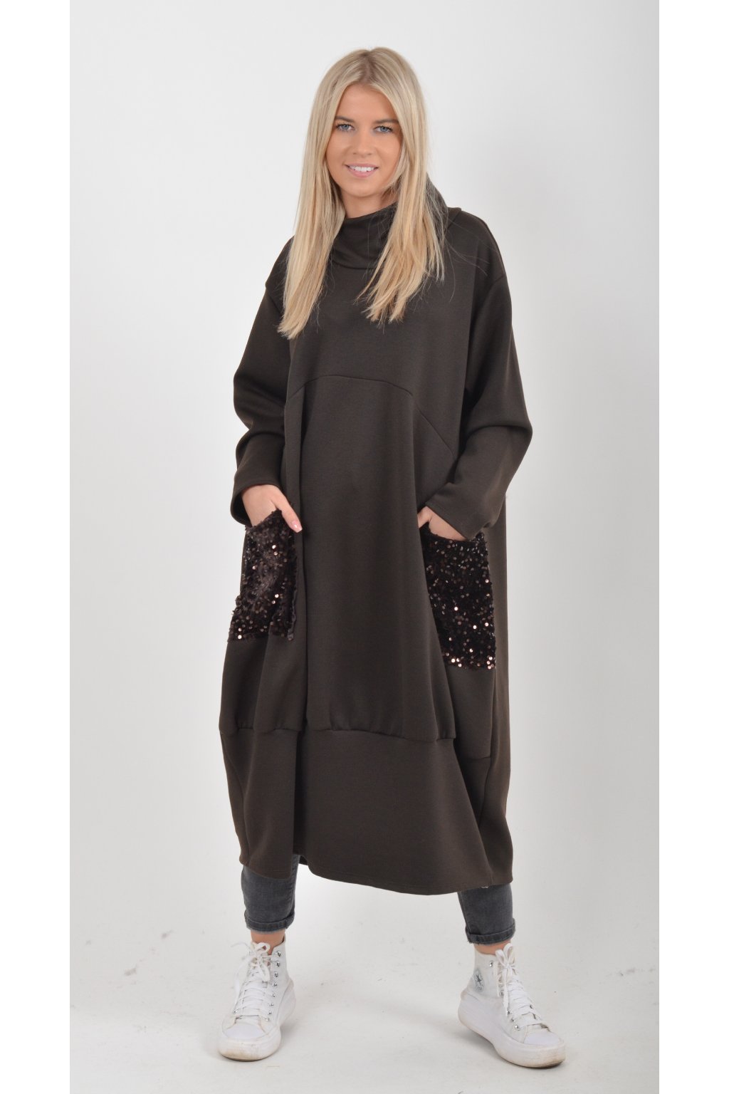 Mikinové šaty zdobené flitry. Mají áčkový střih, dlouhý rukáv a v přední části mají kapsy. Jsou vyrobené z velice příjemného a lehce zatepleného materiálu.