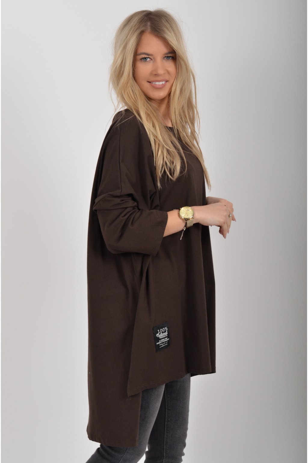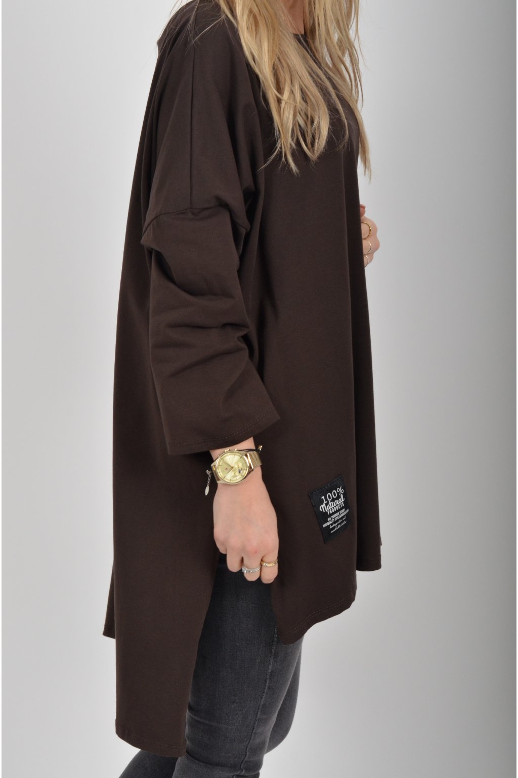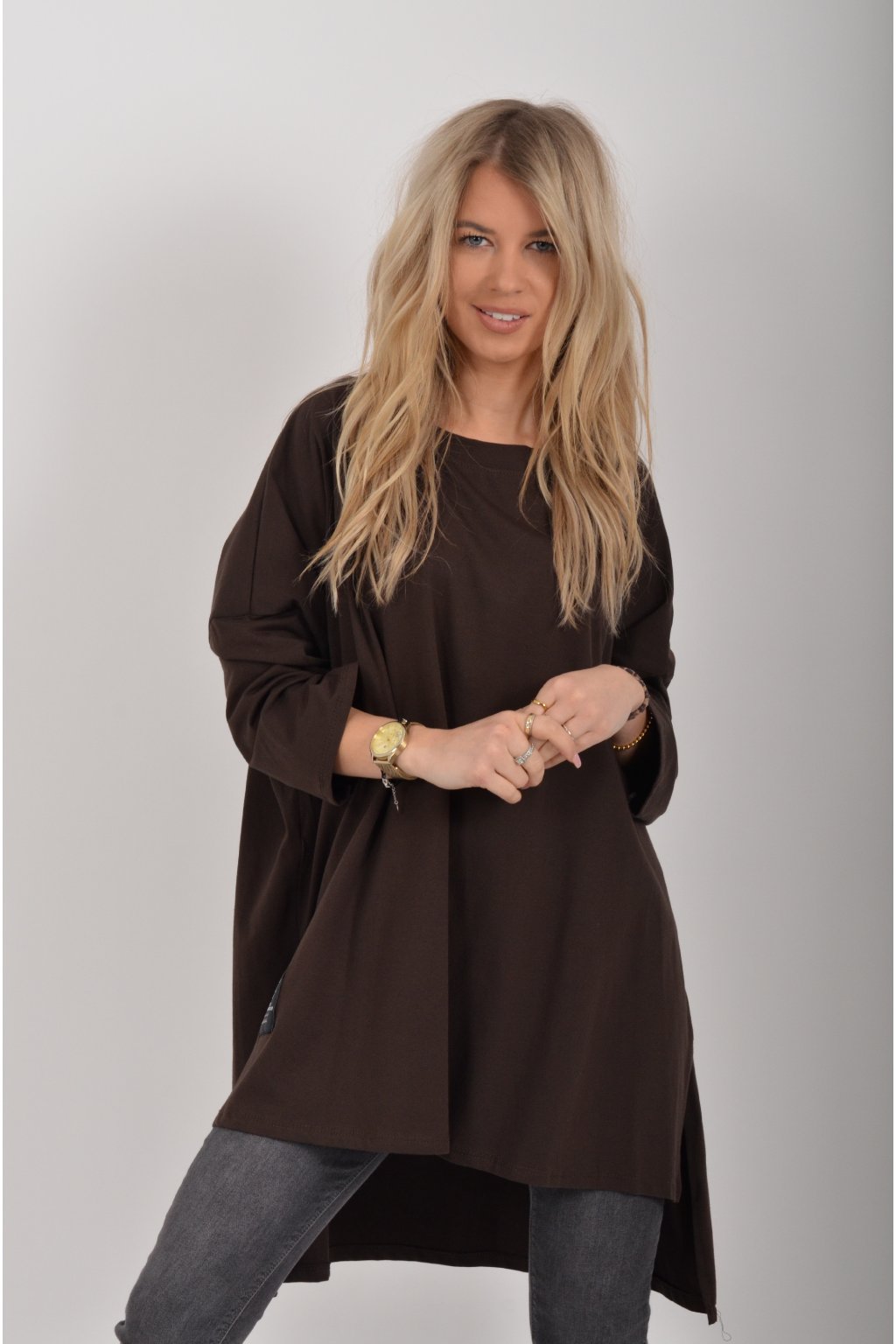 Jednobarevné oversize tričko s 3/4rukávem vyrobené z velice lehké, měkké a příjemné bavlny. Zadní část trička je delší než přední.