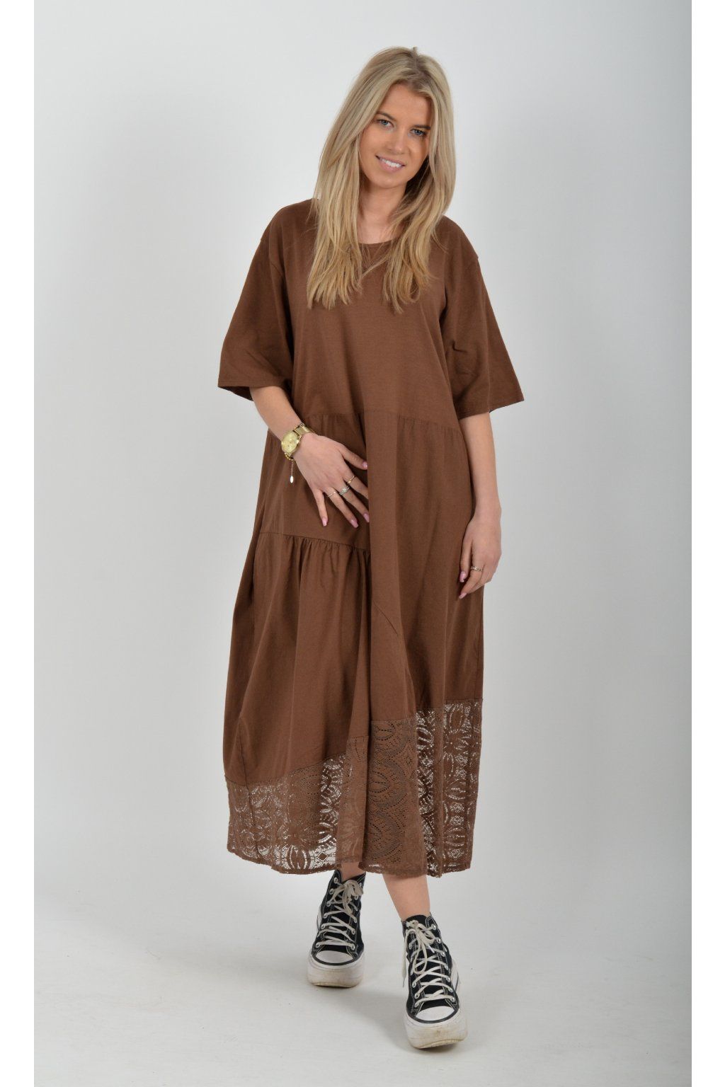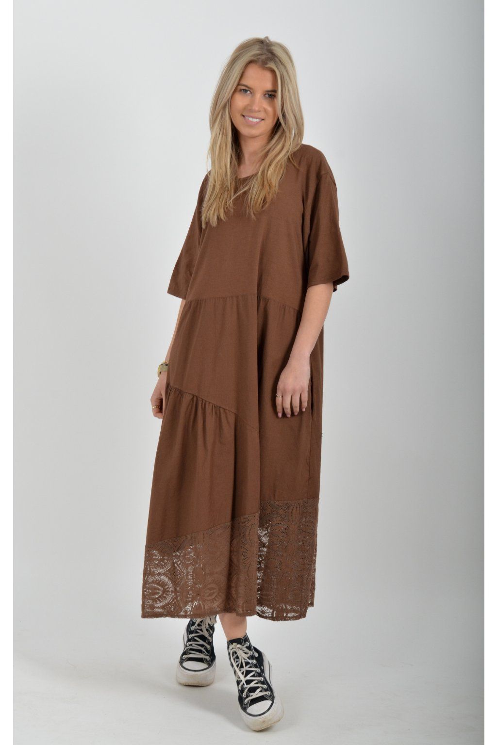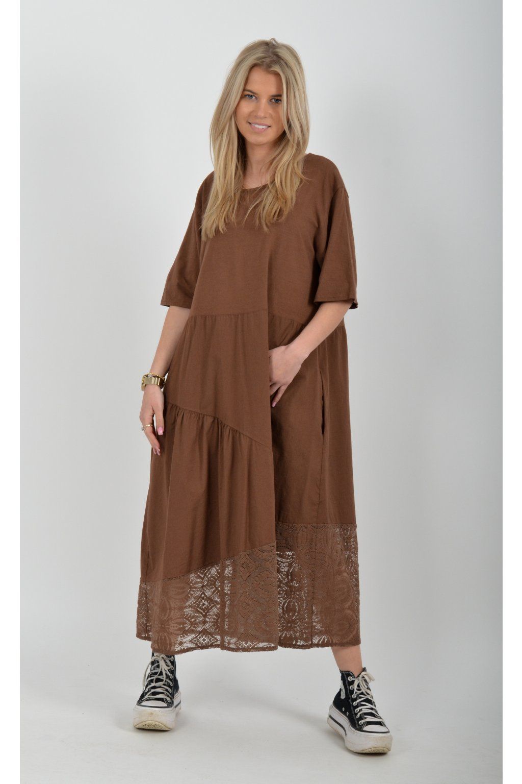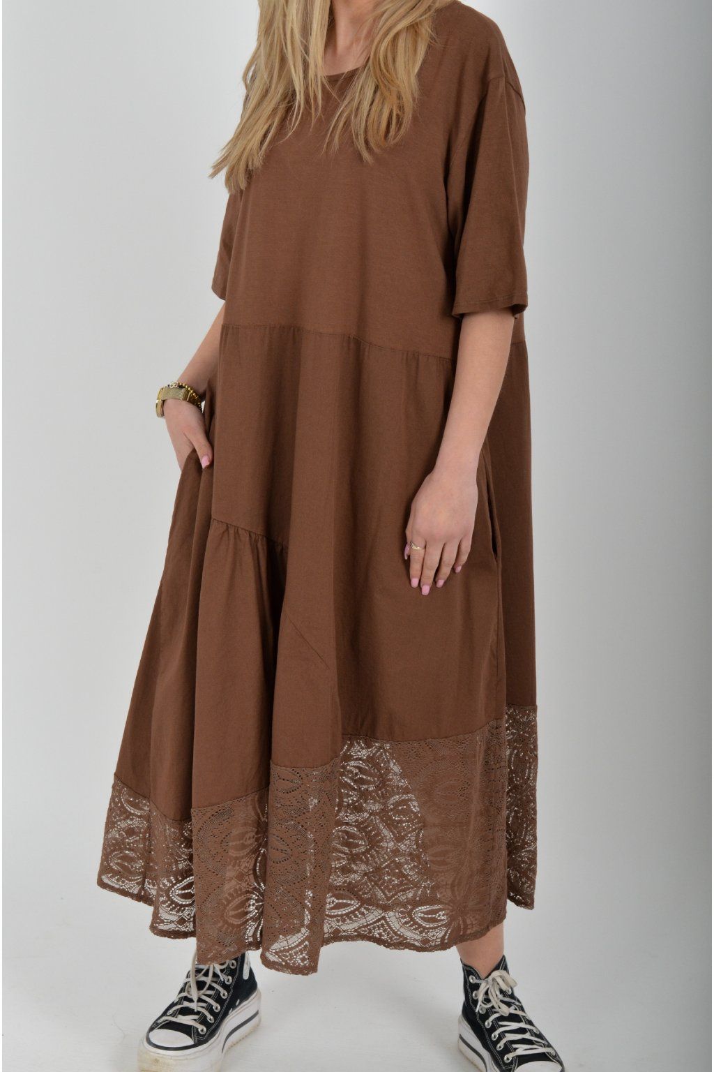 Zajímavé bavlněné šaty s krajkou ve spodní části. Šaty mají áčkový střih, na bocích kapsy a krátké rukávy. Jsou vyrobené z velice příjemného a lehce pružného materiálu.