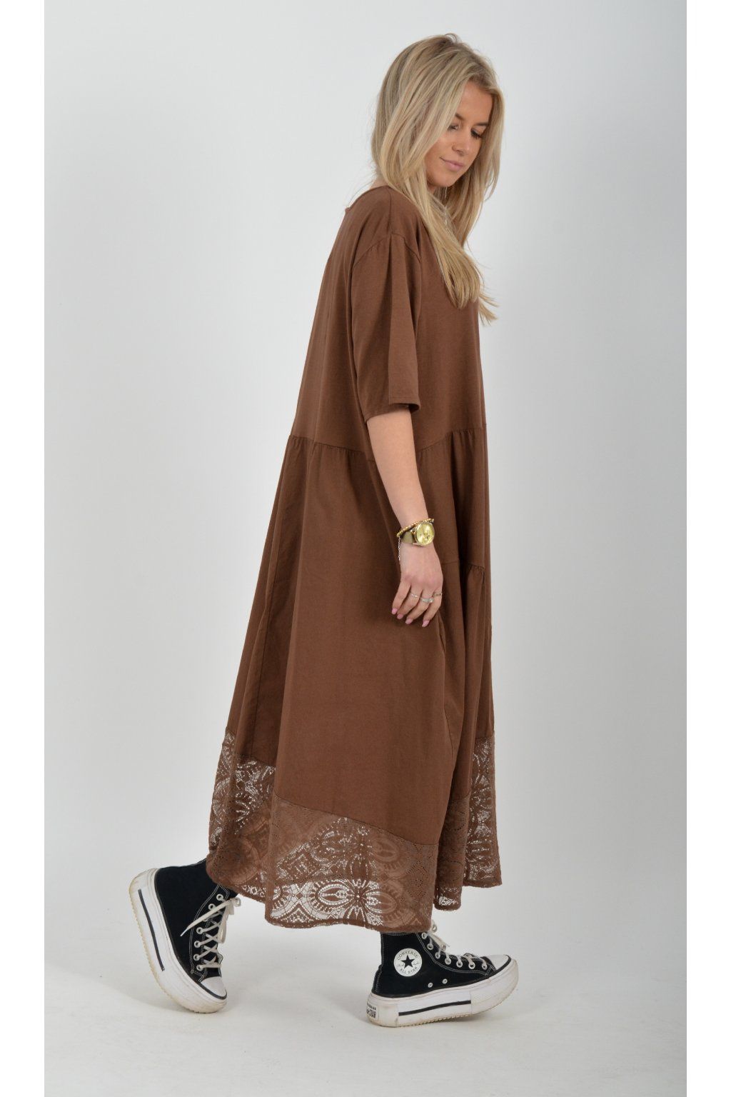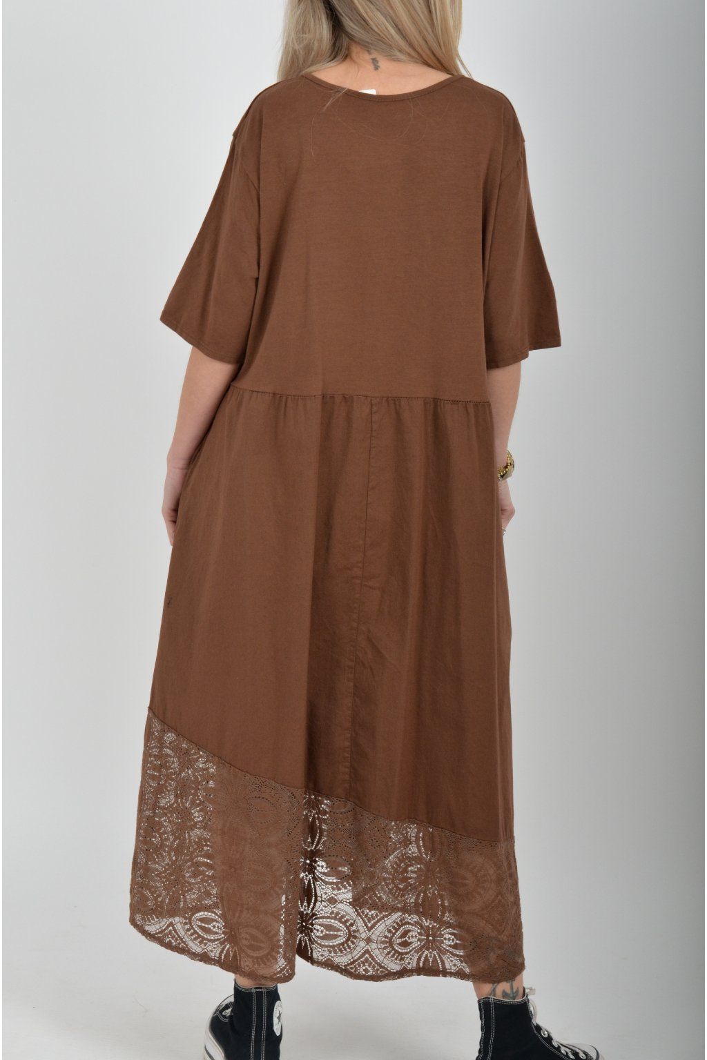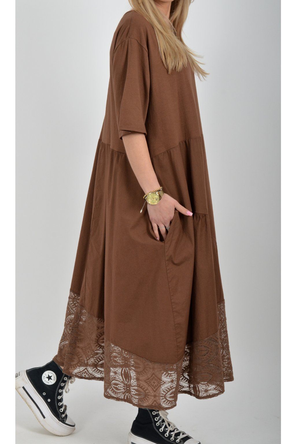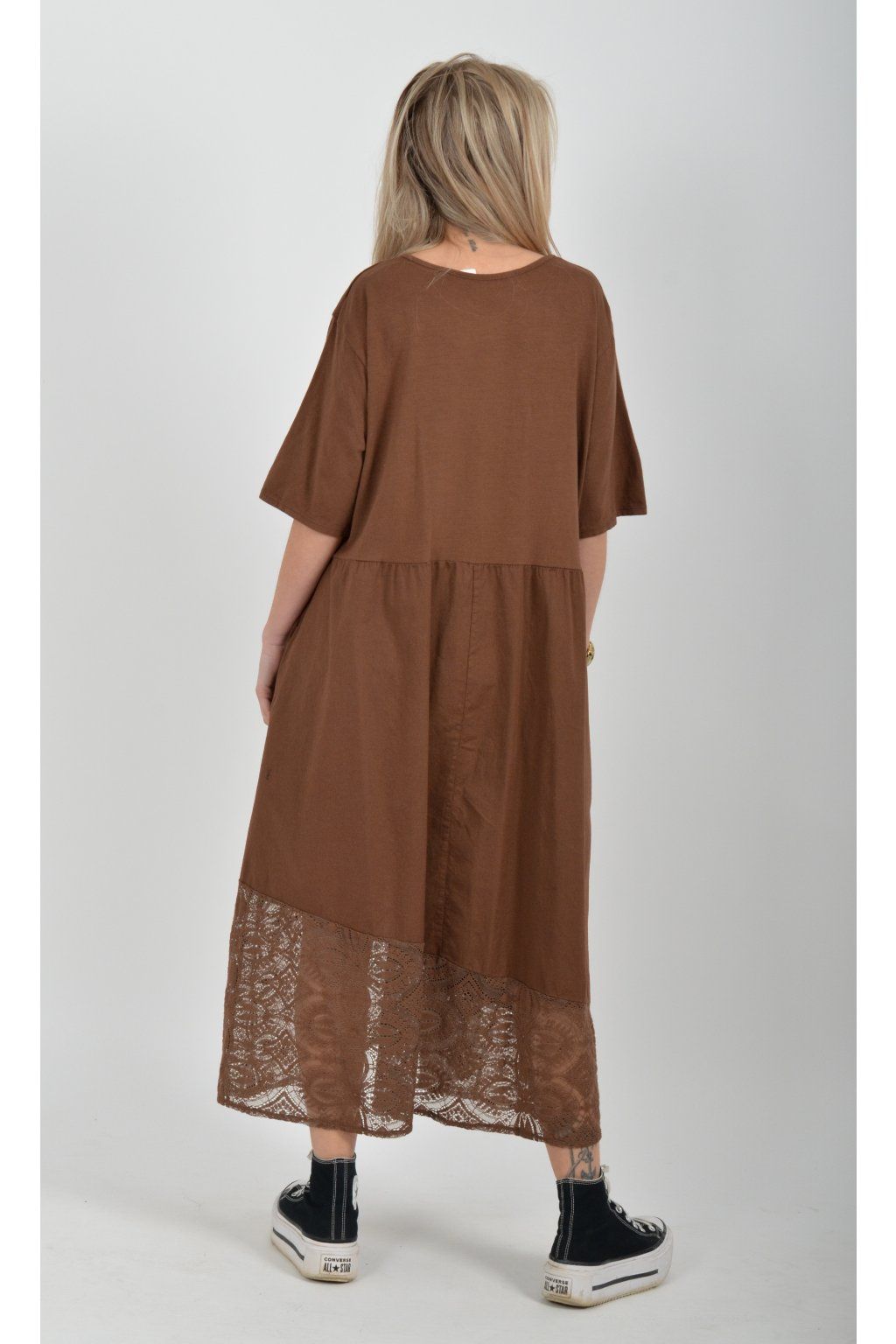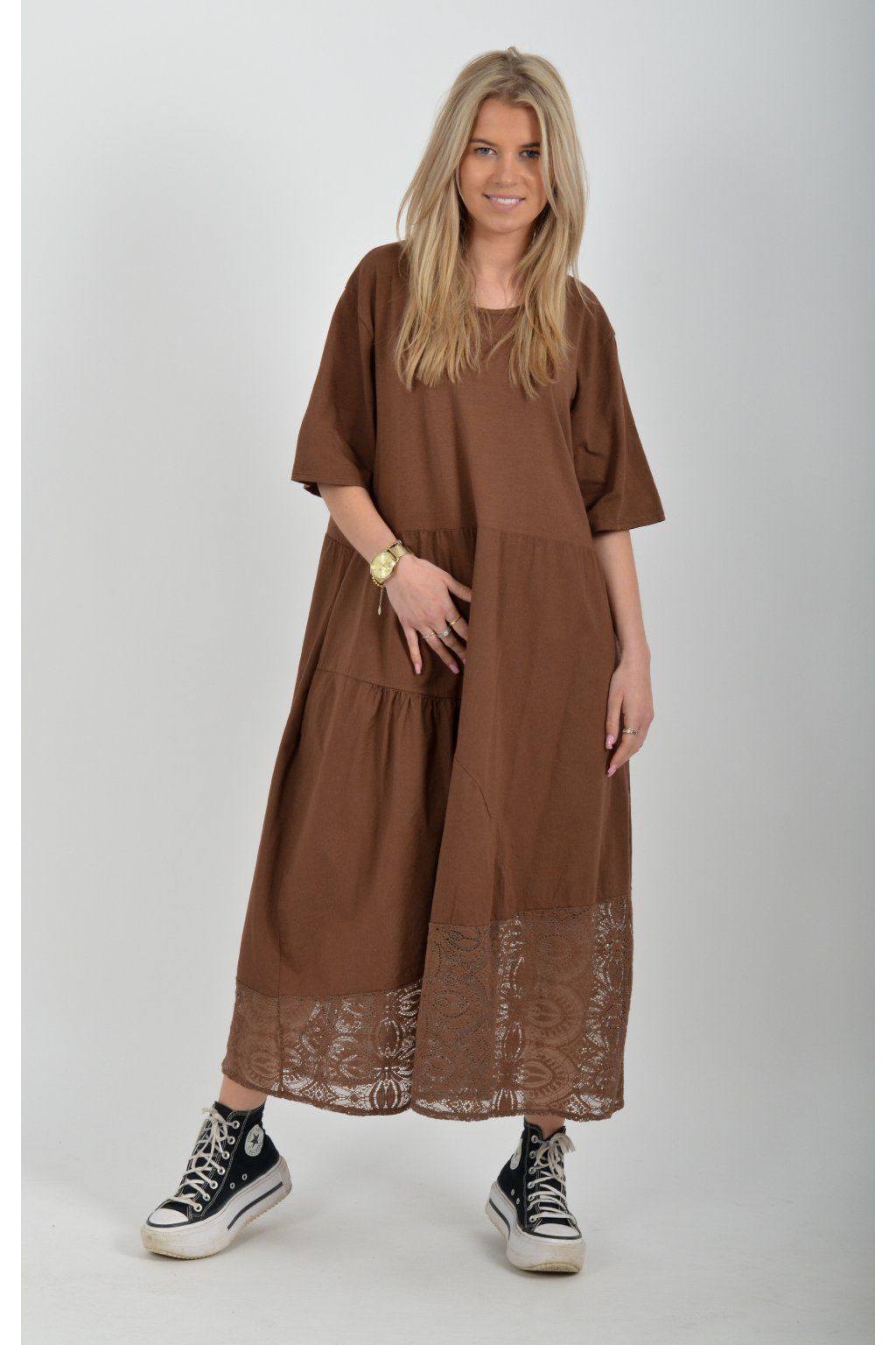 Zajímavé bavlněné šaty s krajkou ve spodní části. Šaty mají áčkový střih, na bocích kapsy a krátké rukávy. Jsou vyrobené z velice příjemného a lehce pružného materiálu.