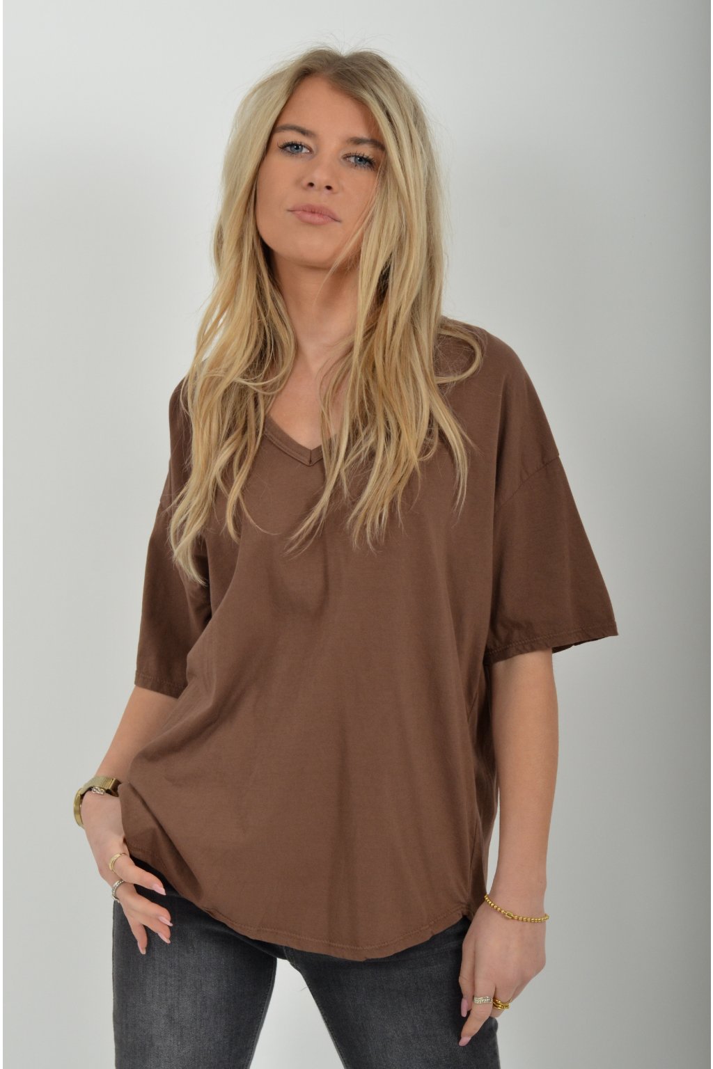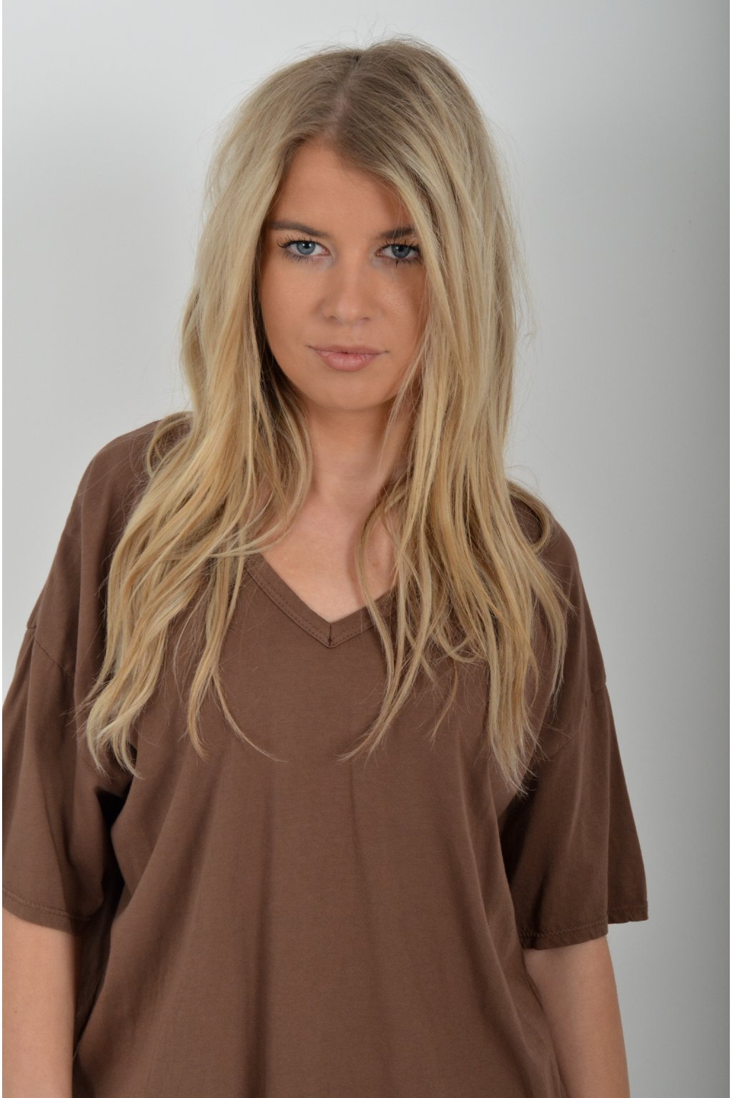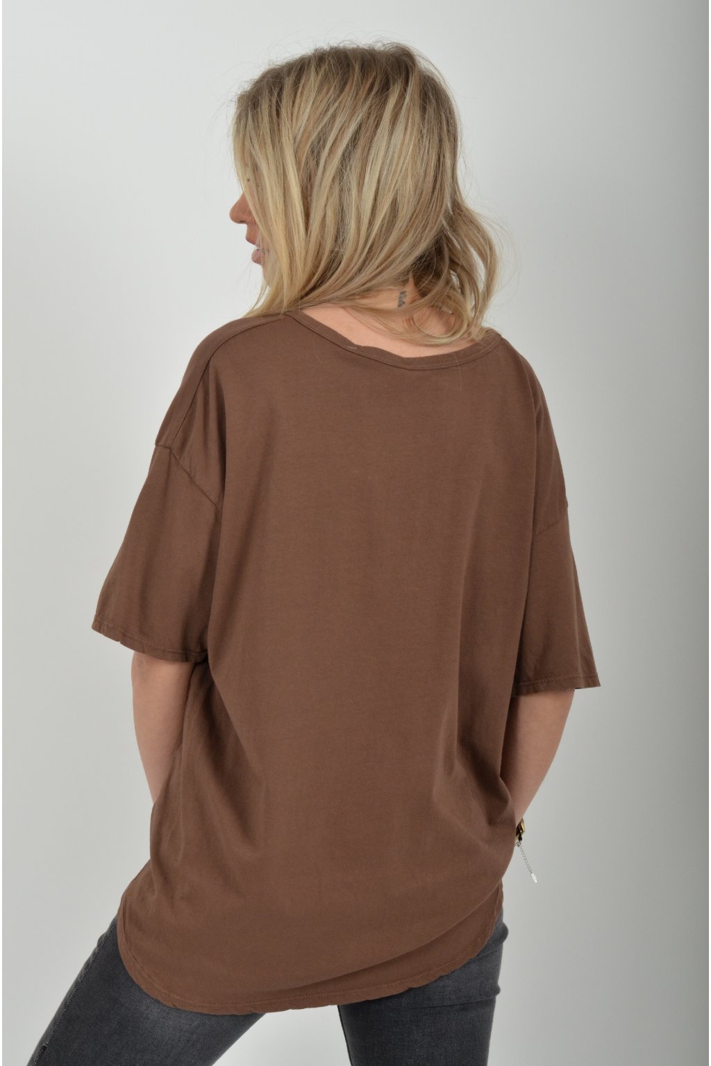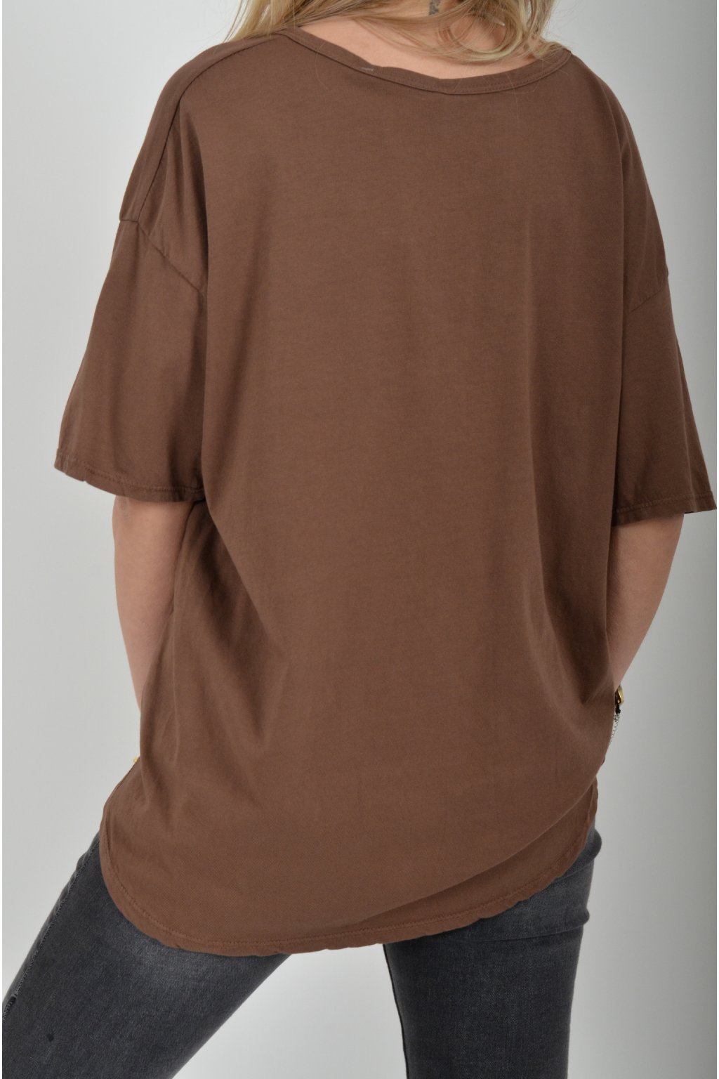Jednobarevné tričko s krátkým rukávem a výstřihem do V. Zadní část trička je delší než přední. Je vyrobené z velice lehké, měkké a příjemné bavlny.