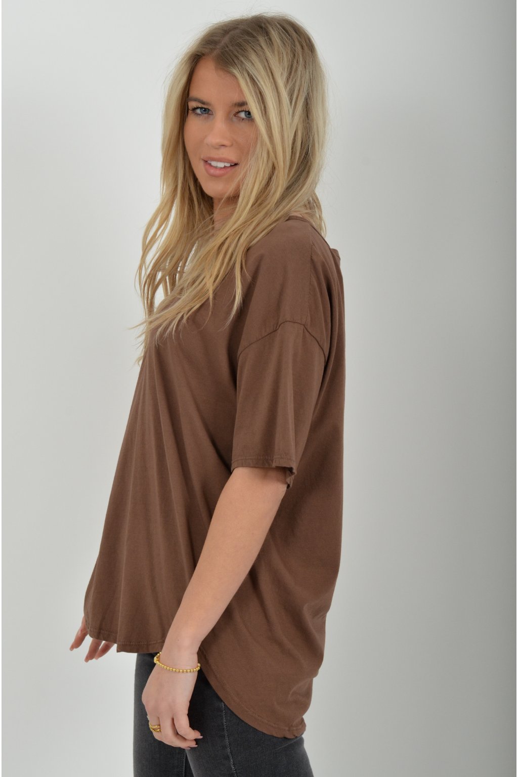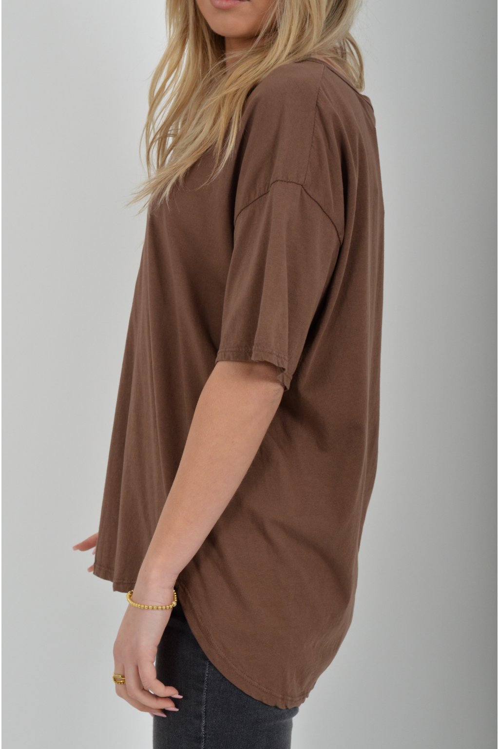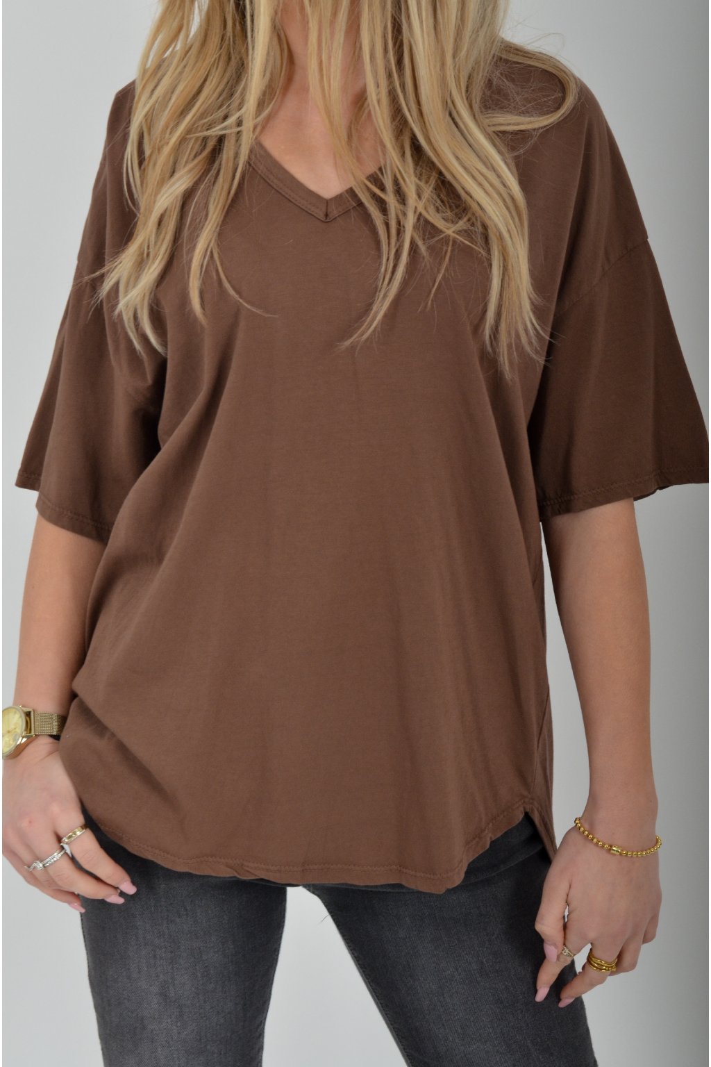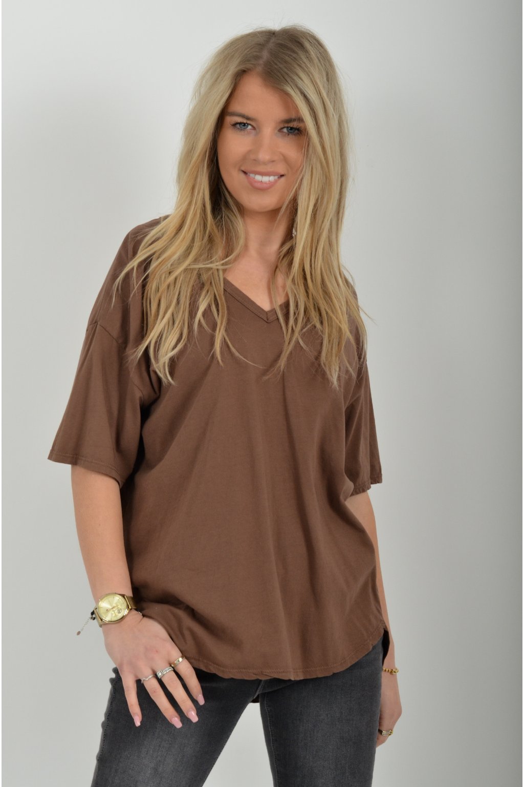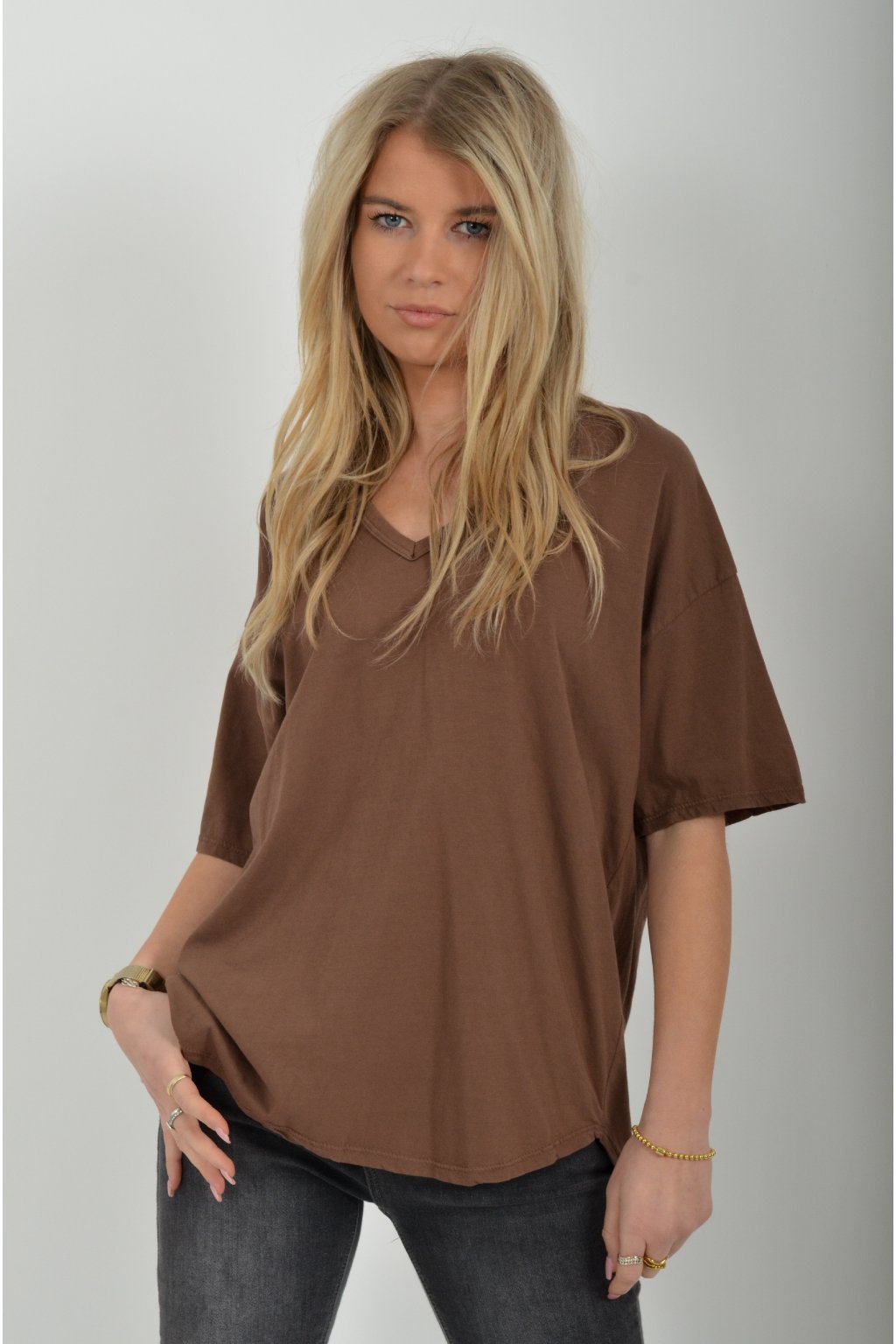 Jednobarevné tričko s krátkým rukávem a výstřihem do V. Zadní část trička je delší než přední. Je vyrobené z velice lehké, měkké a příjemné bavlny.