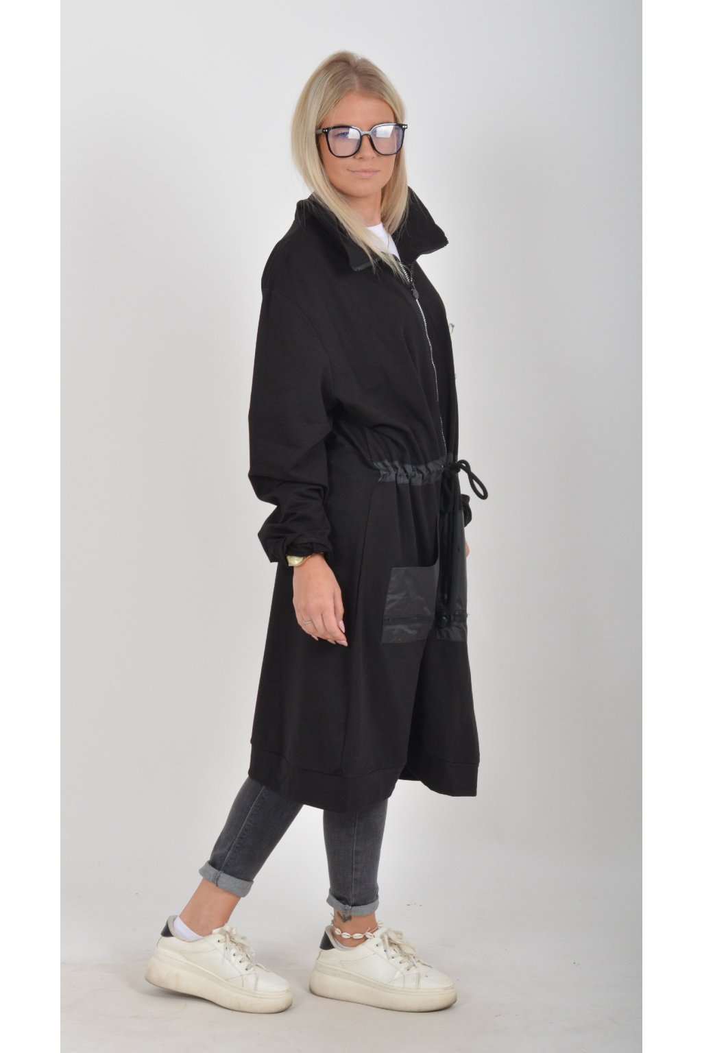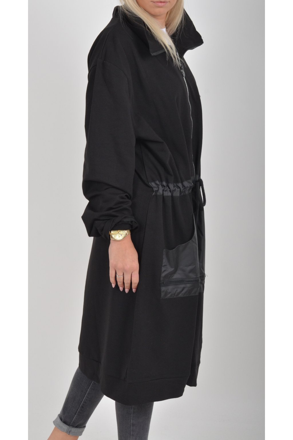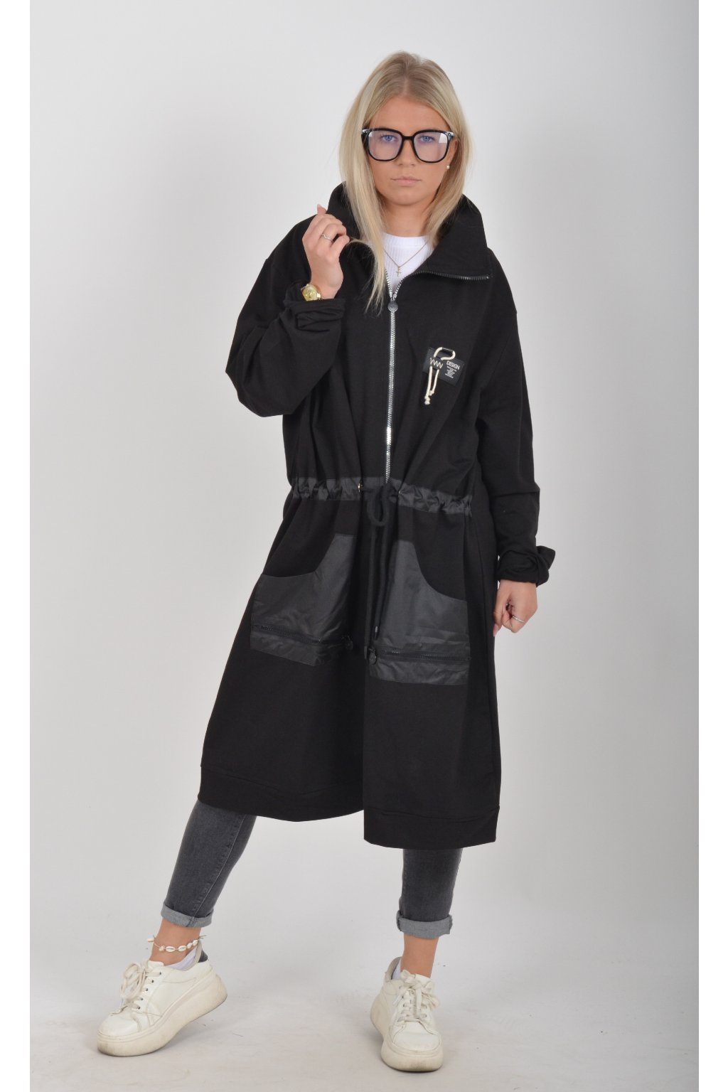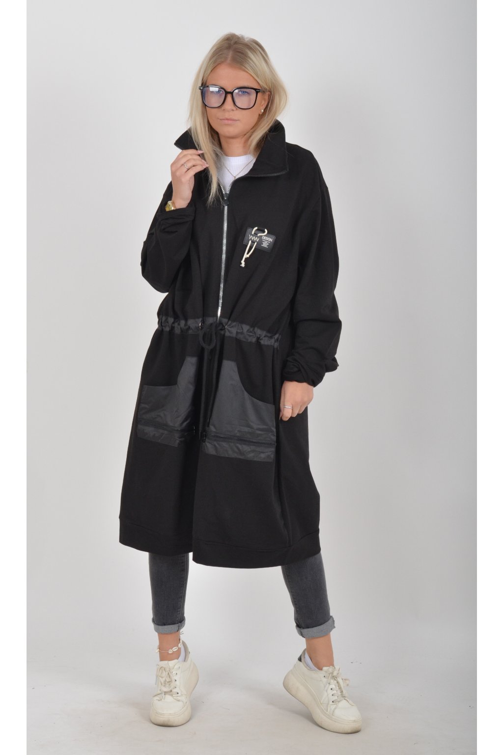 Dlouhá mikinová bunda lehce áčkového střihu se zapínáním na zip. V pase je zapracovaná šňůrka pro libovolné stažená. V přední části má kapsy, které jsou ze šusťákoviny. Je vyrobena z velice příjemné a kvalitní turecké bavlny.