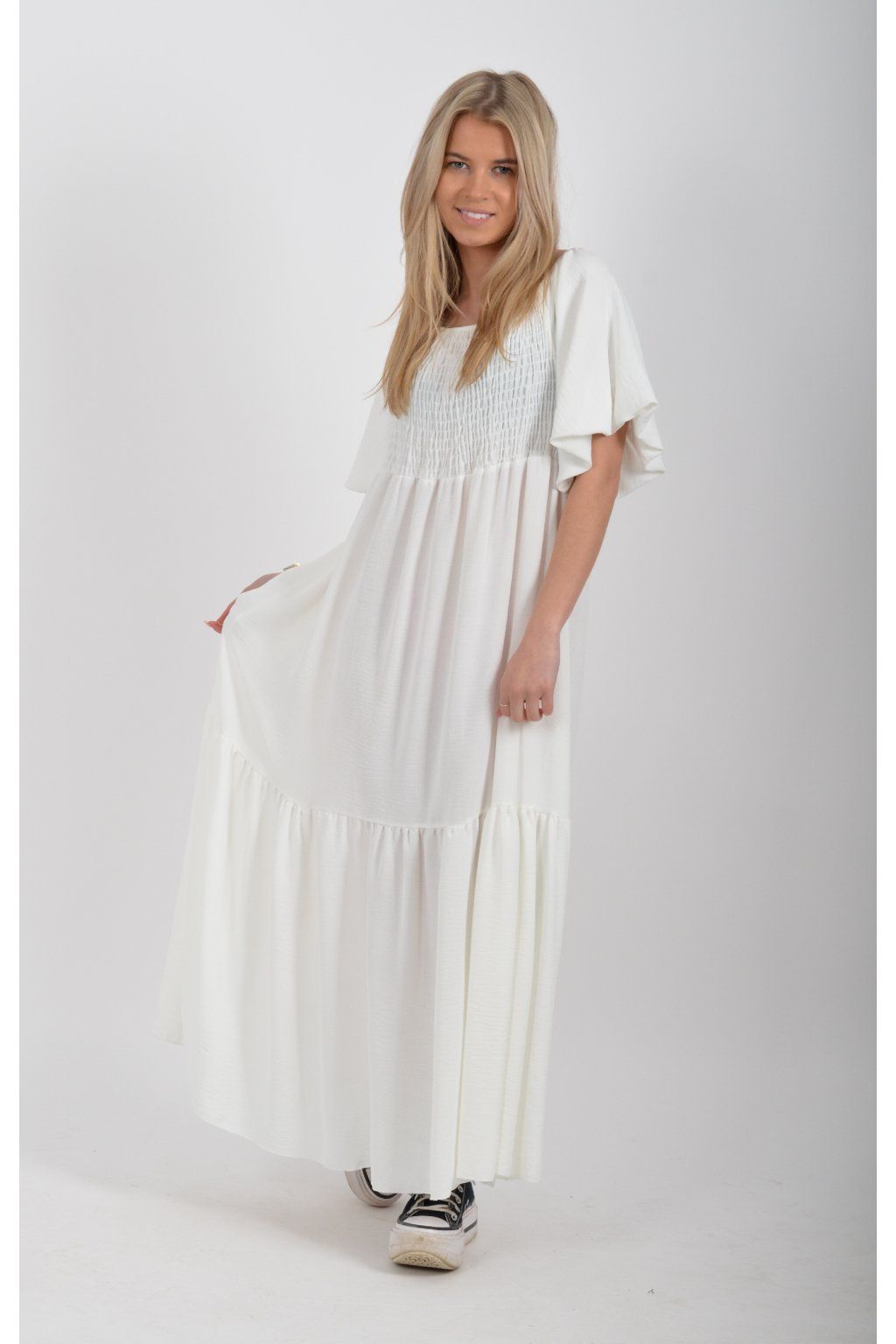 Dlouhé elegantní šaty áčkového střihu s krátkým rukávem. V horní části je žabičkovaní (jsou elastastické). Kolem výstřihu mají zapracovanou gumu, díky které je možné spustit šaty přes ramena.