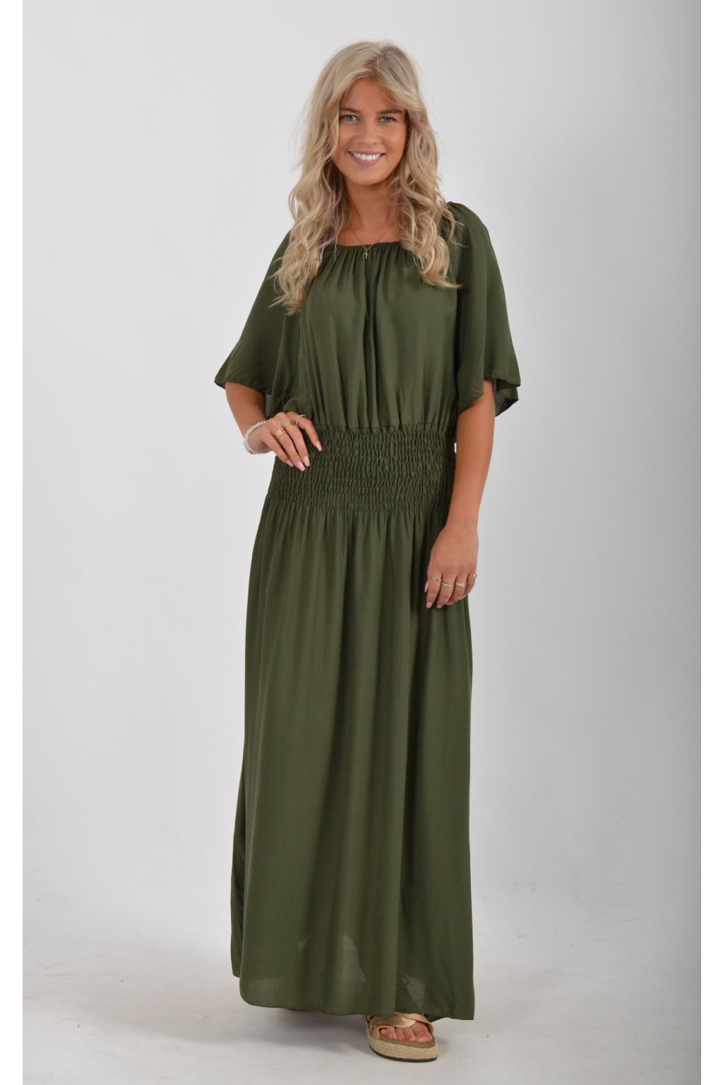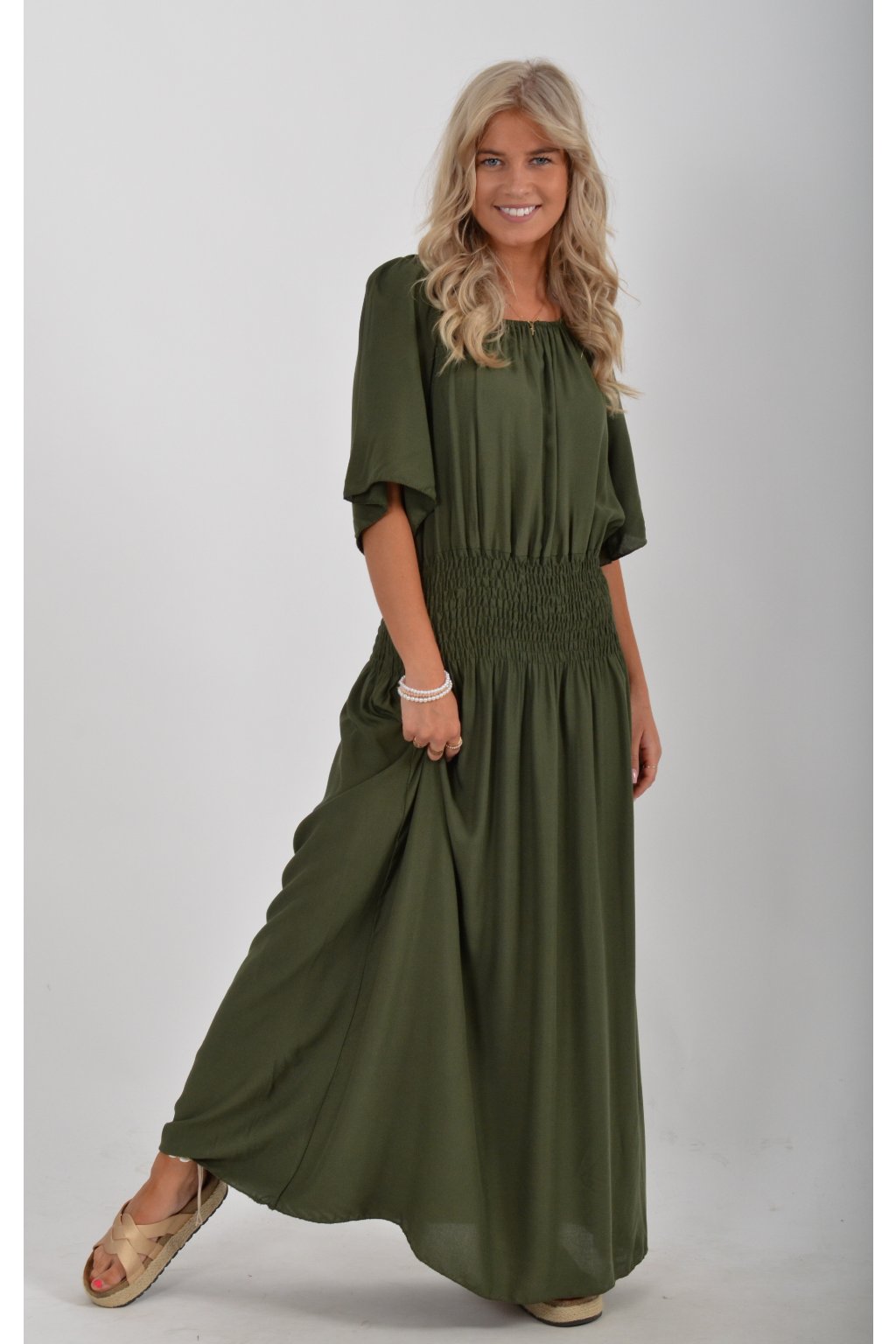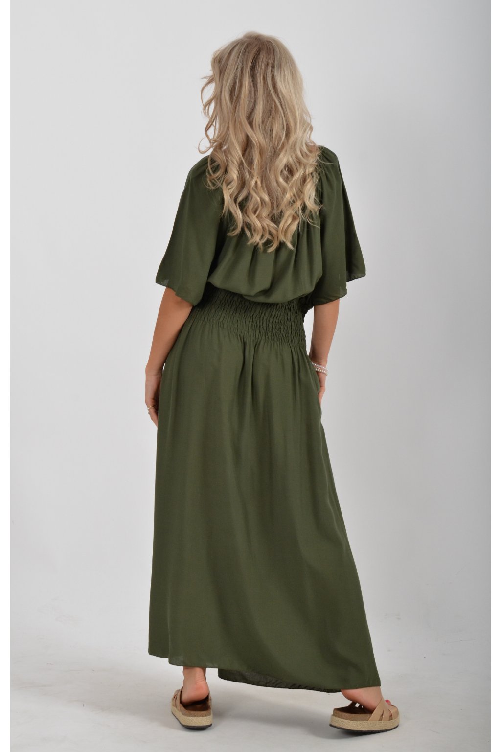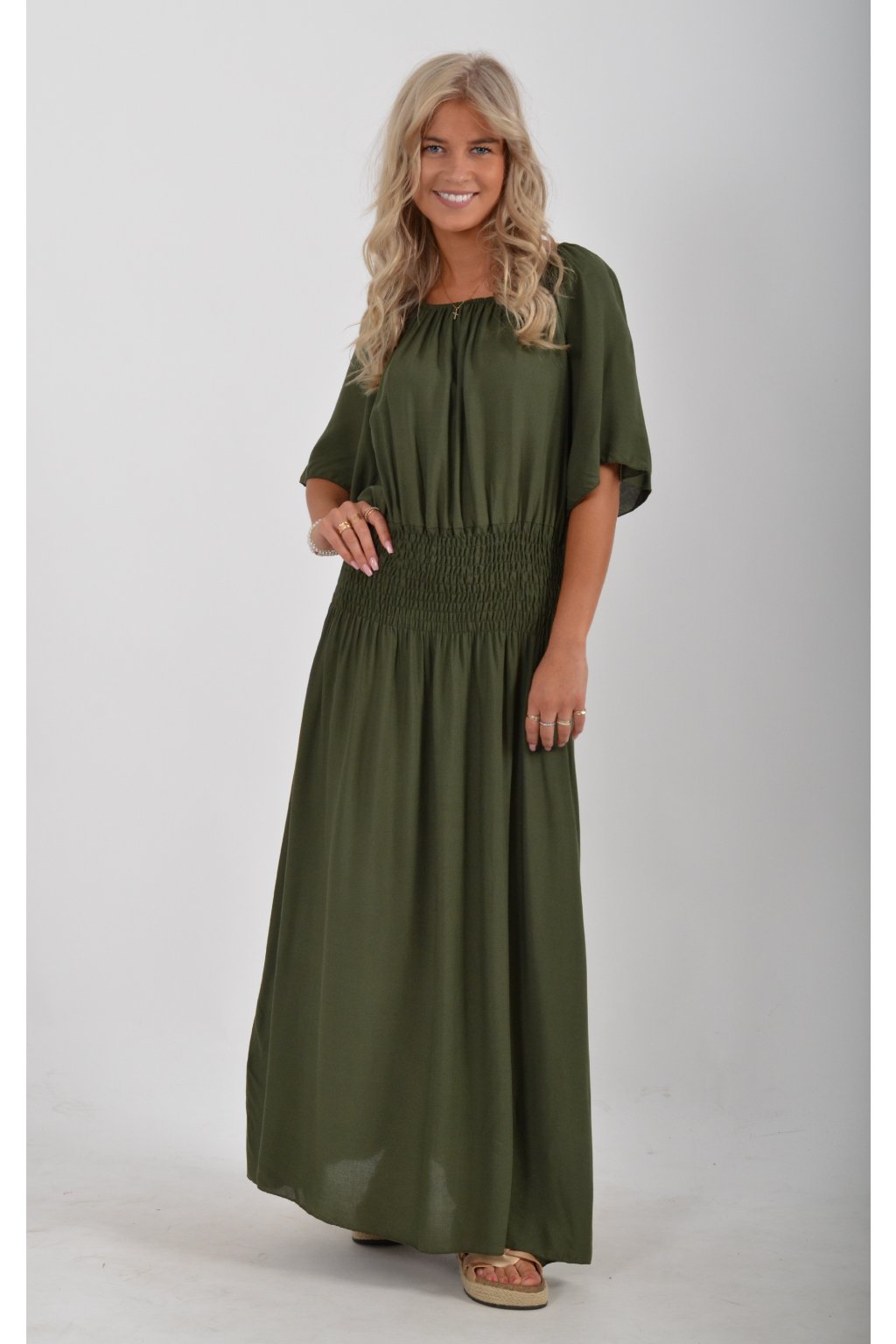 Dlouhé elegantní šaty áčkového střihu s krátkým rukávem. V pase je žabičkovaní (jsou elastastické). Kolem výstřihu mají zapracovanou gumu, díky které je možné spustit šaty přes ramena.