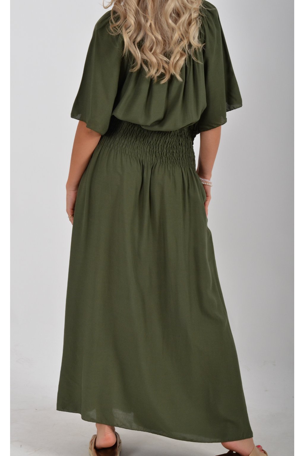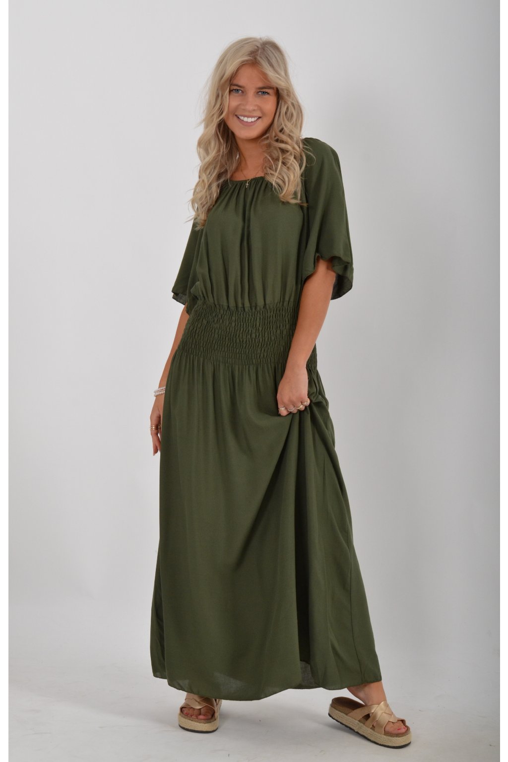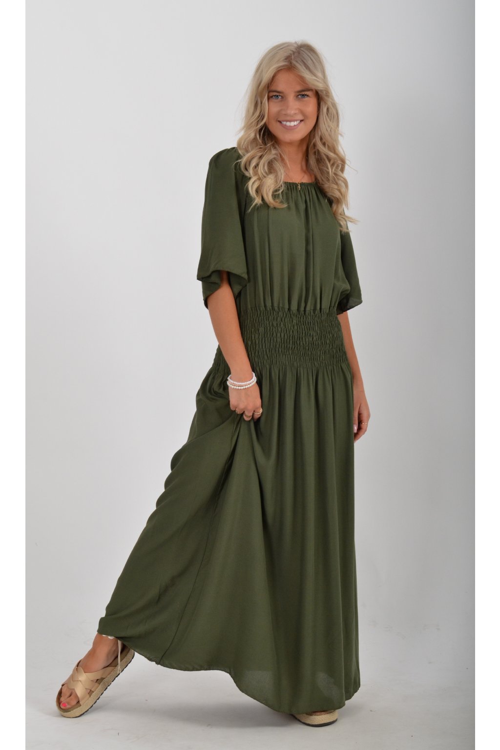 Dlouhé elegantní šaty áčkového střihu s krátkým rukávem. V pase je žabičkovaní (jsou elastastické). Kolem výstřihu mají zapracovanou gumu, díky které je možné spustit šaty přes ramena.