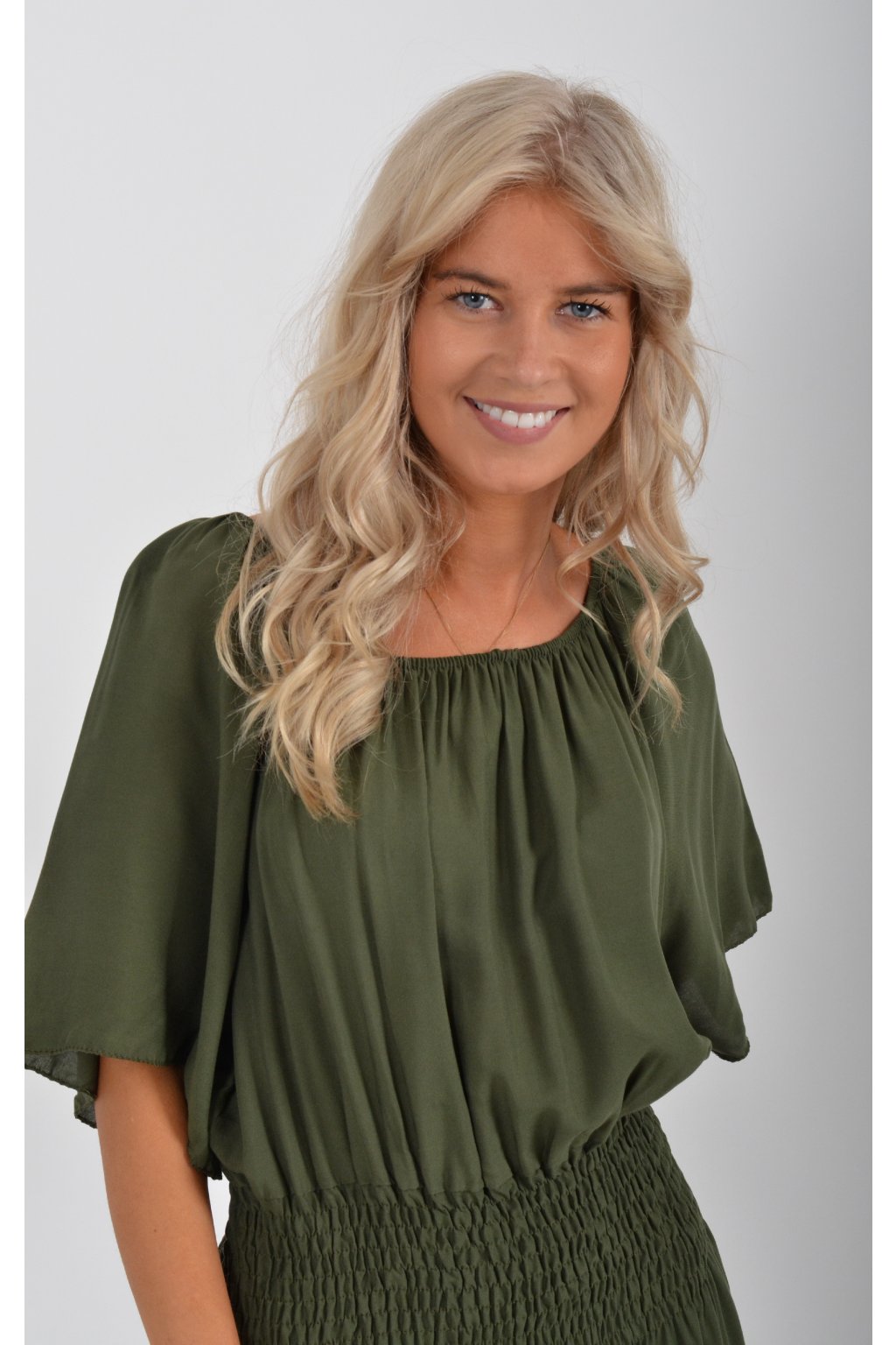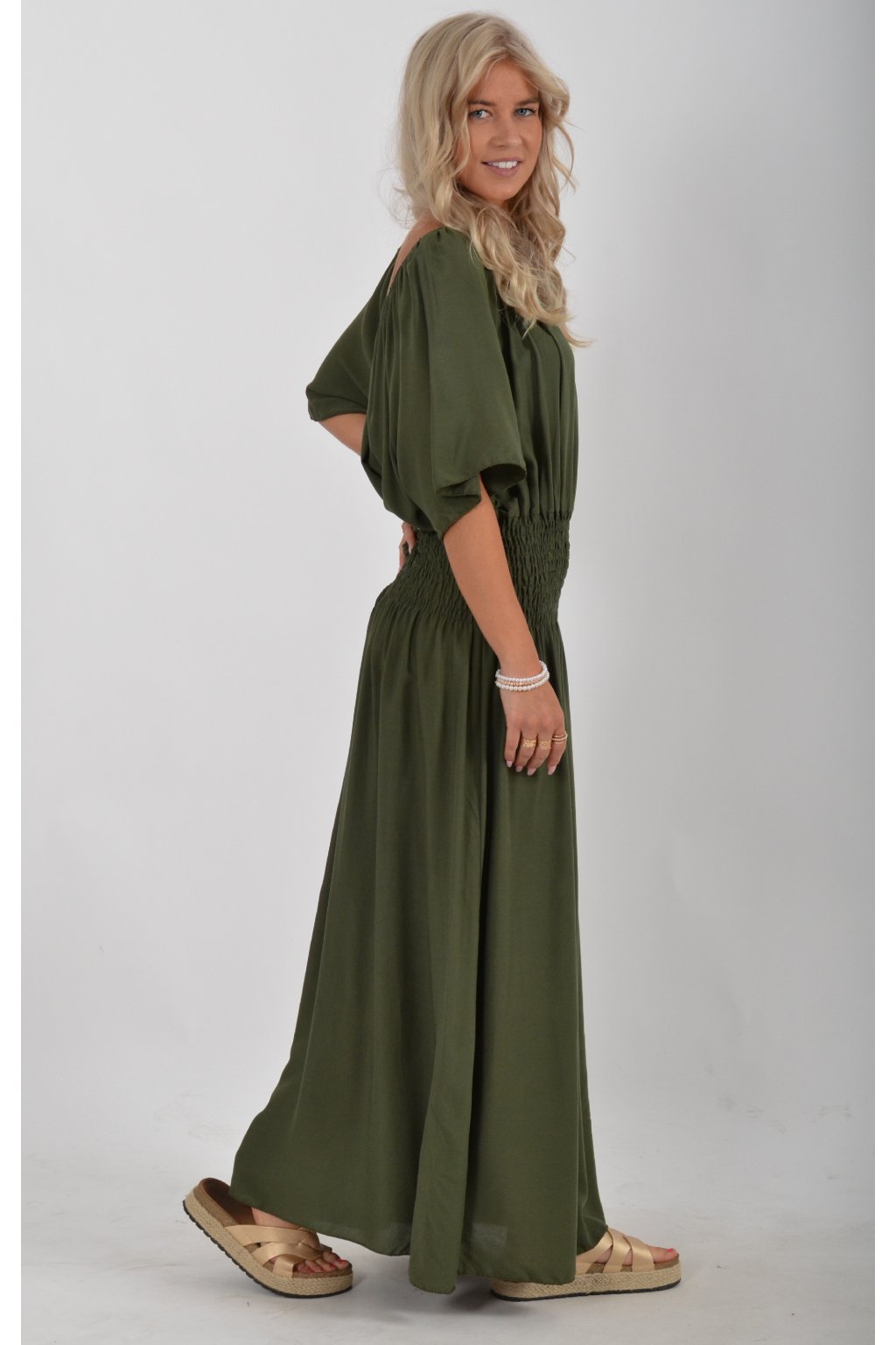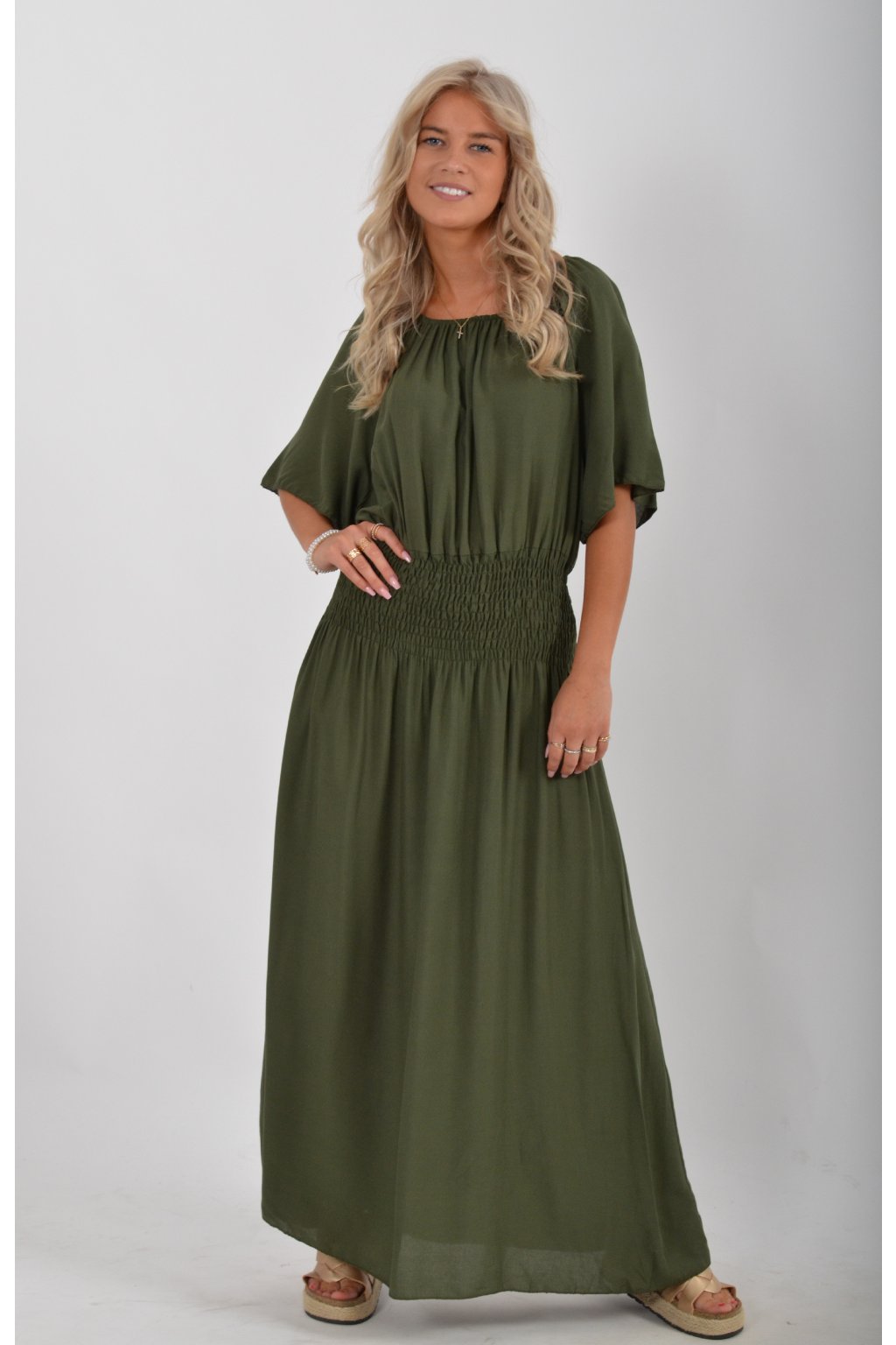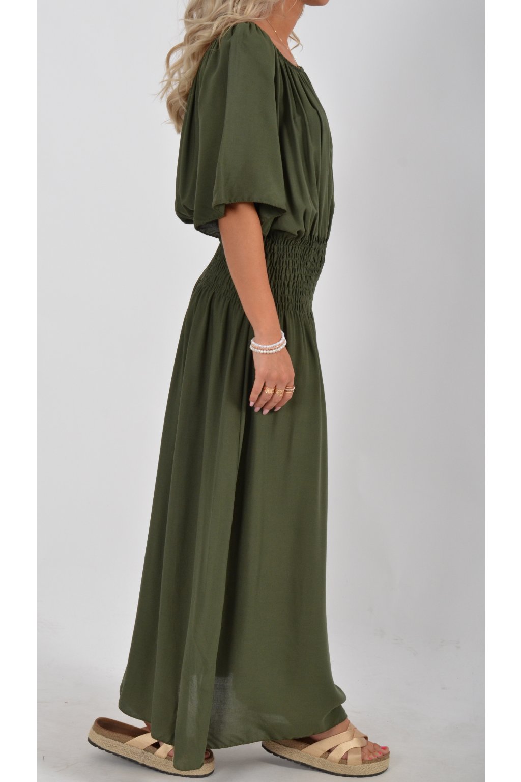 Dlouhé elegantní šaty áčkového střihu s krátkým rukávem. V pase je žabičkovaní (jsou elastastické). Kolem výstřihu mají zapracovanou gumu, díky které je možné spustit šaty přes ramena.