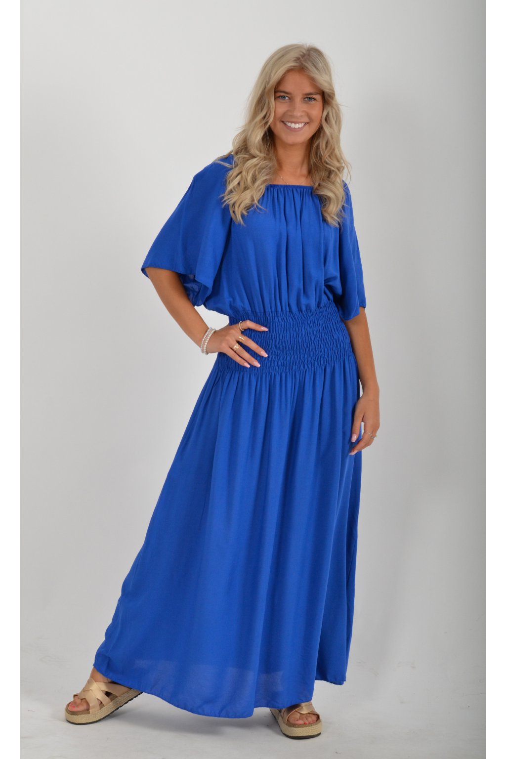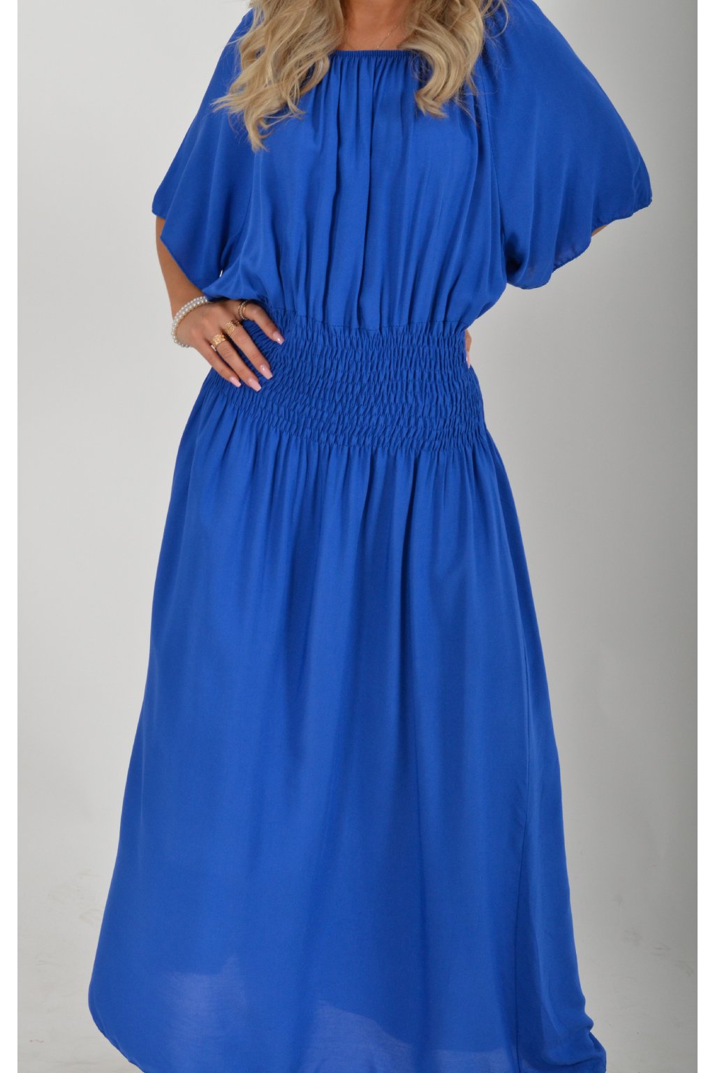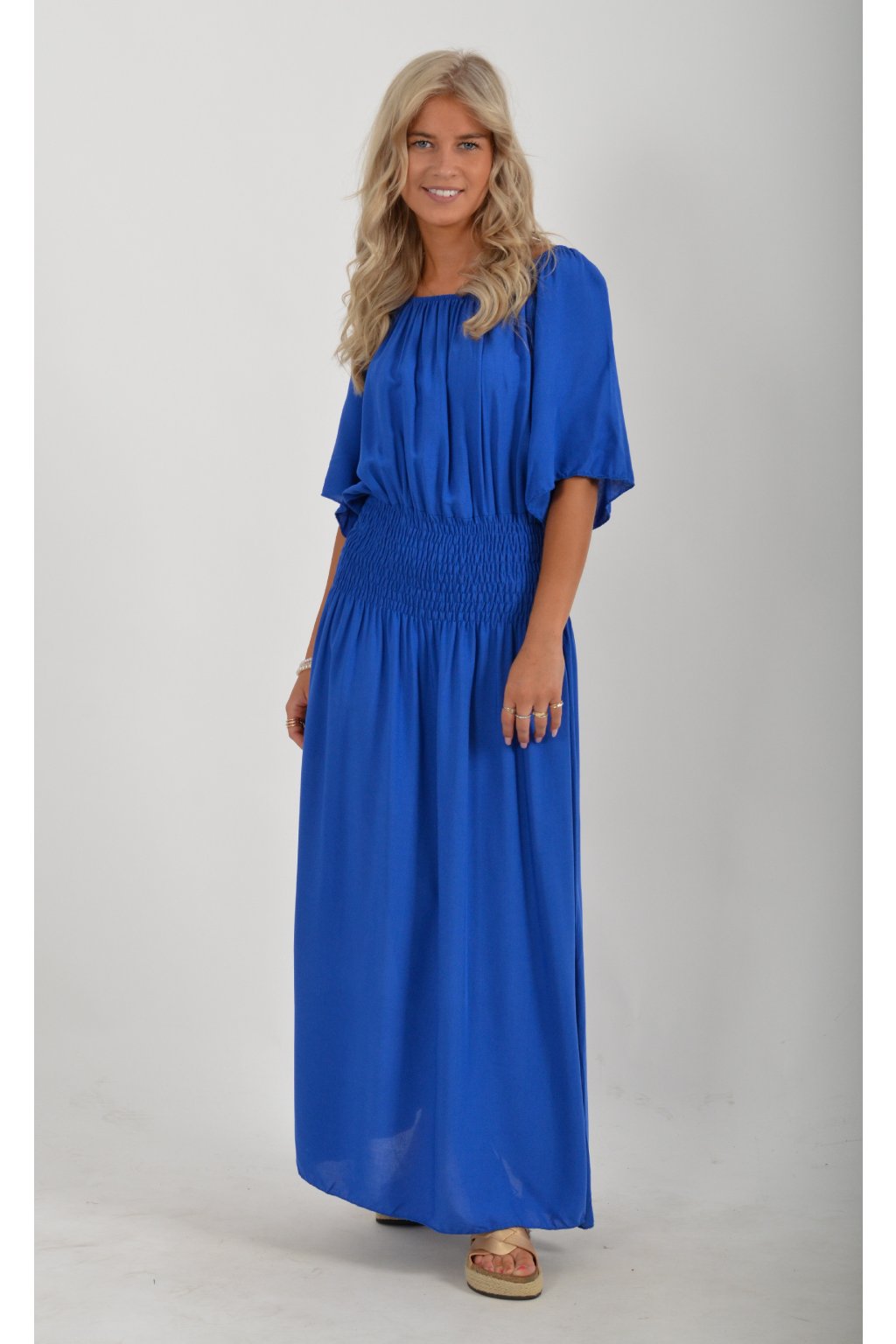 Dlouhé elegantní šaty áčkového střihu s krátkým rukávem. V pase je žabičkovaní (jsou elastastické). Kolem výstřihu mají zapracovanou gumu, díky které je možné spustit šaty přes ramena.