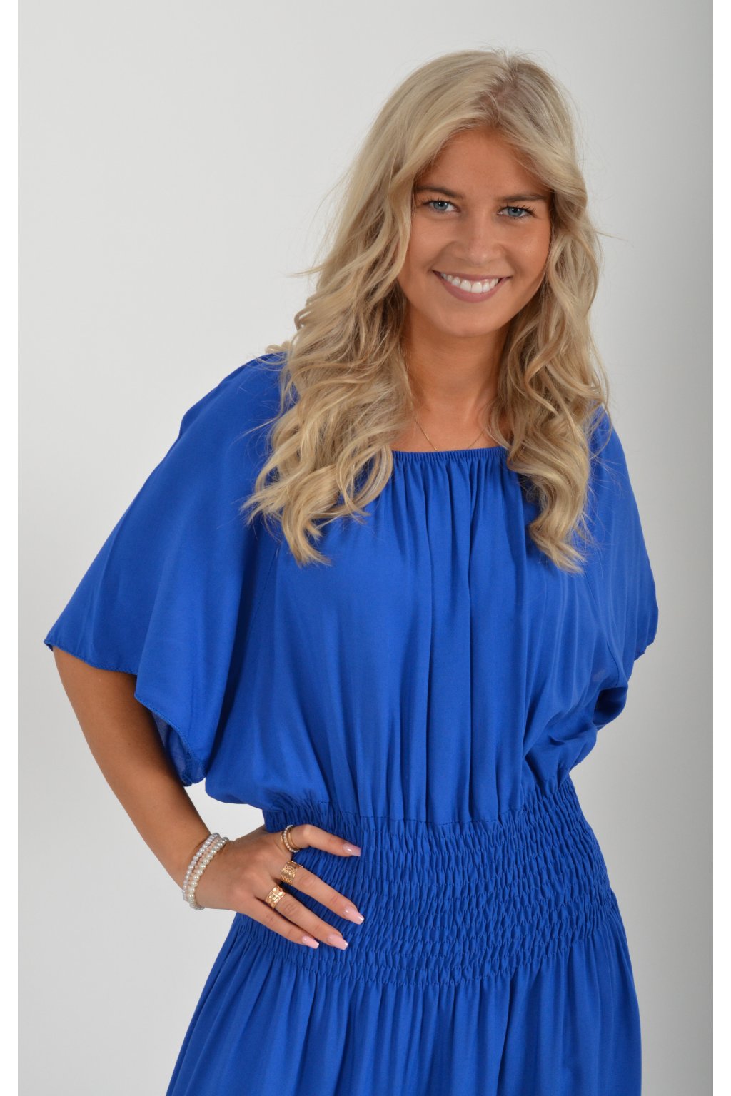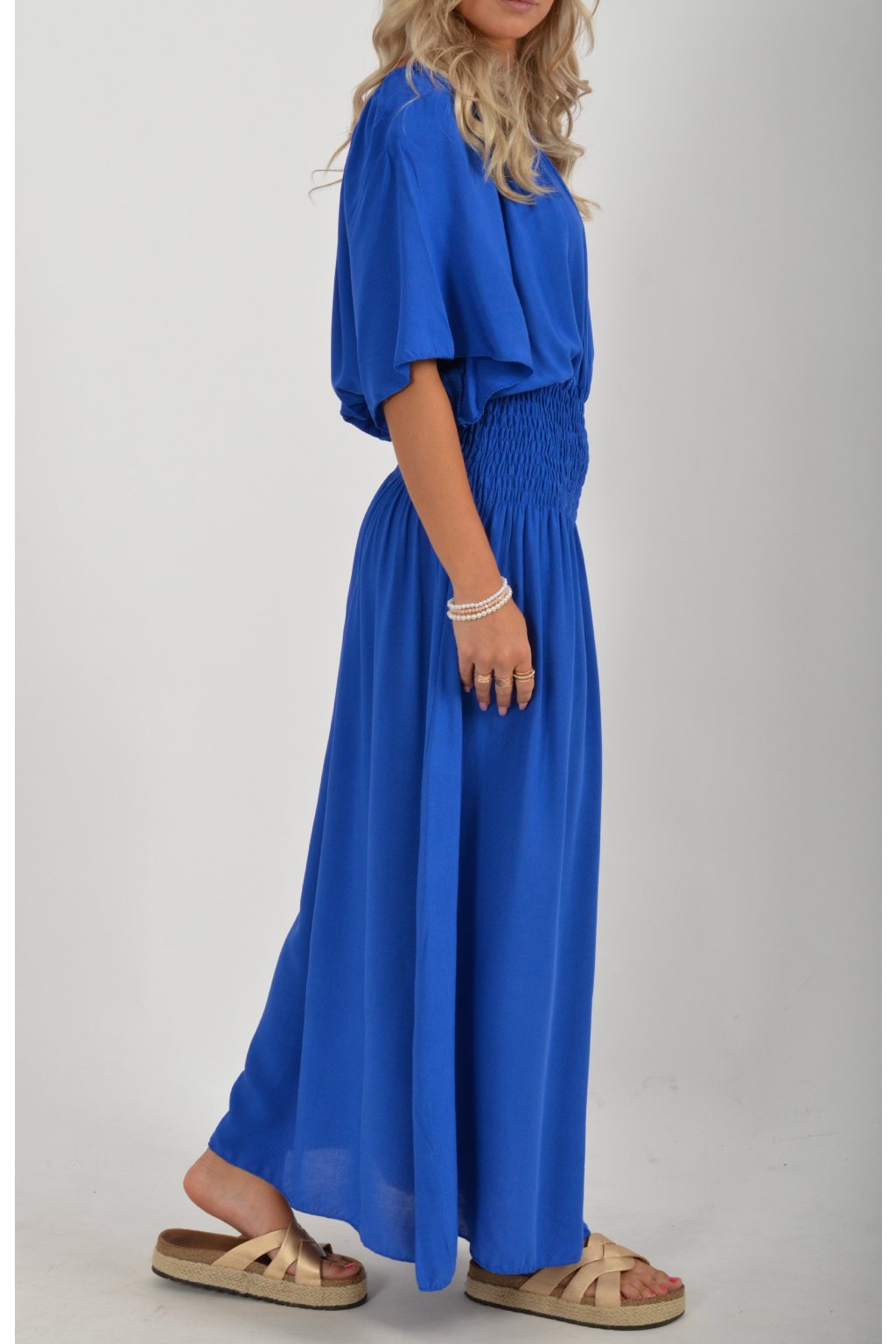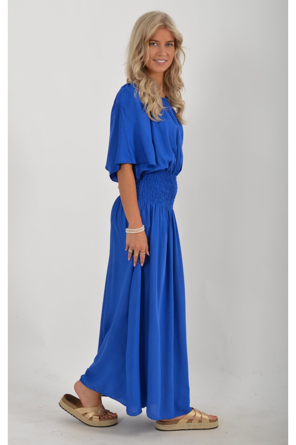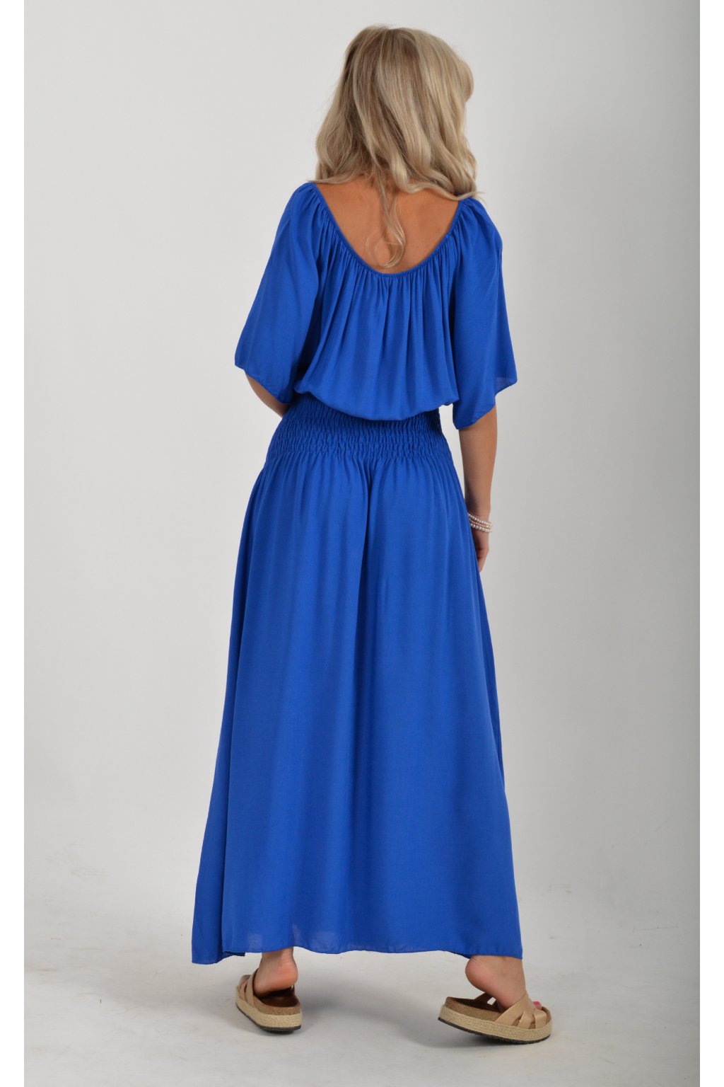 Dlouhé elegantní šaty áčkového střihu s krátkým rukávem. V pase je žabičkovaní (jsou elastastické). Kolem výstřihu mají zapracovanou gumu, díky které je možné spustit šaty přes ramena.