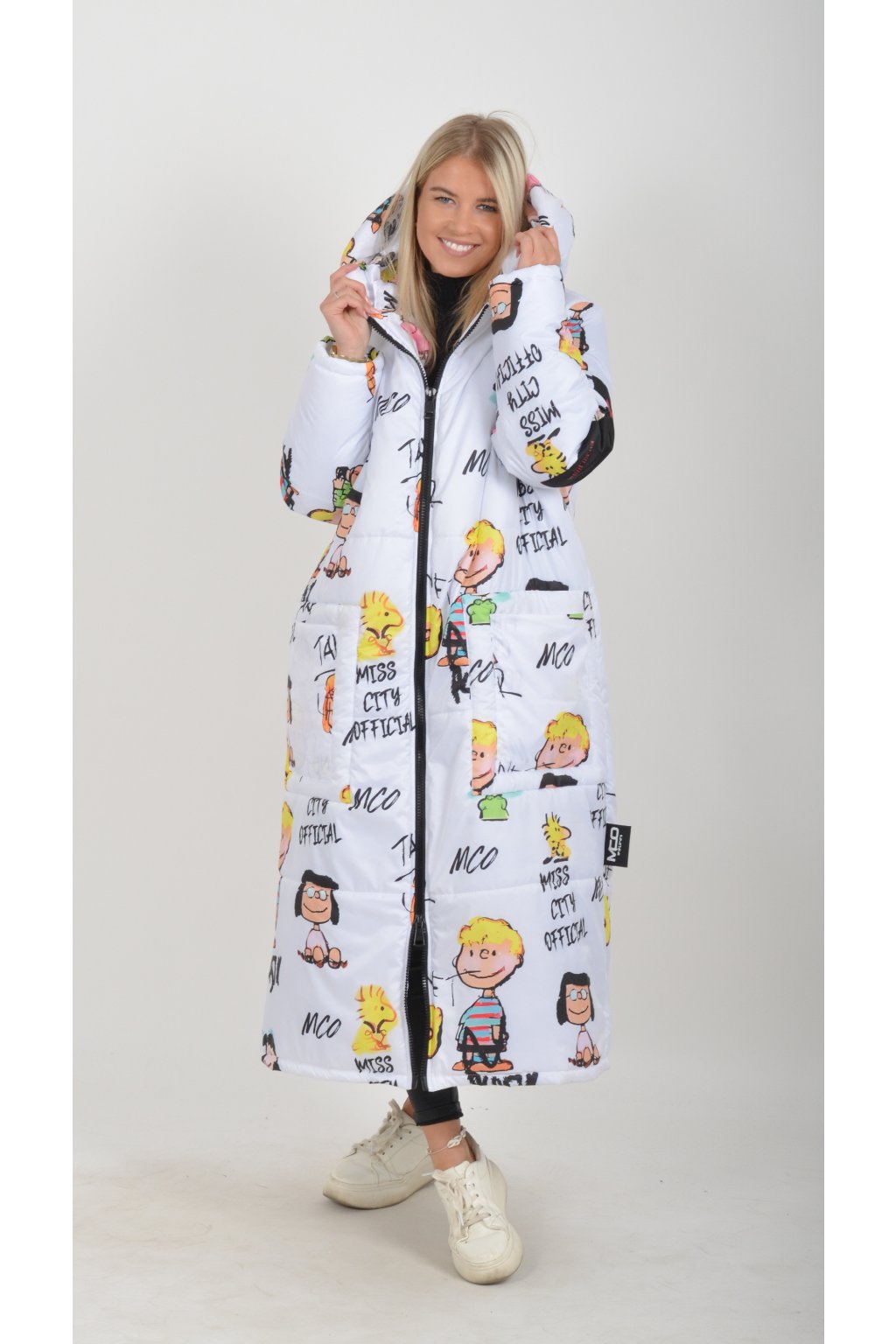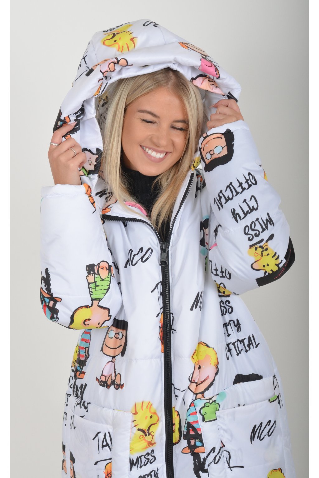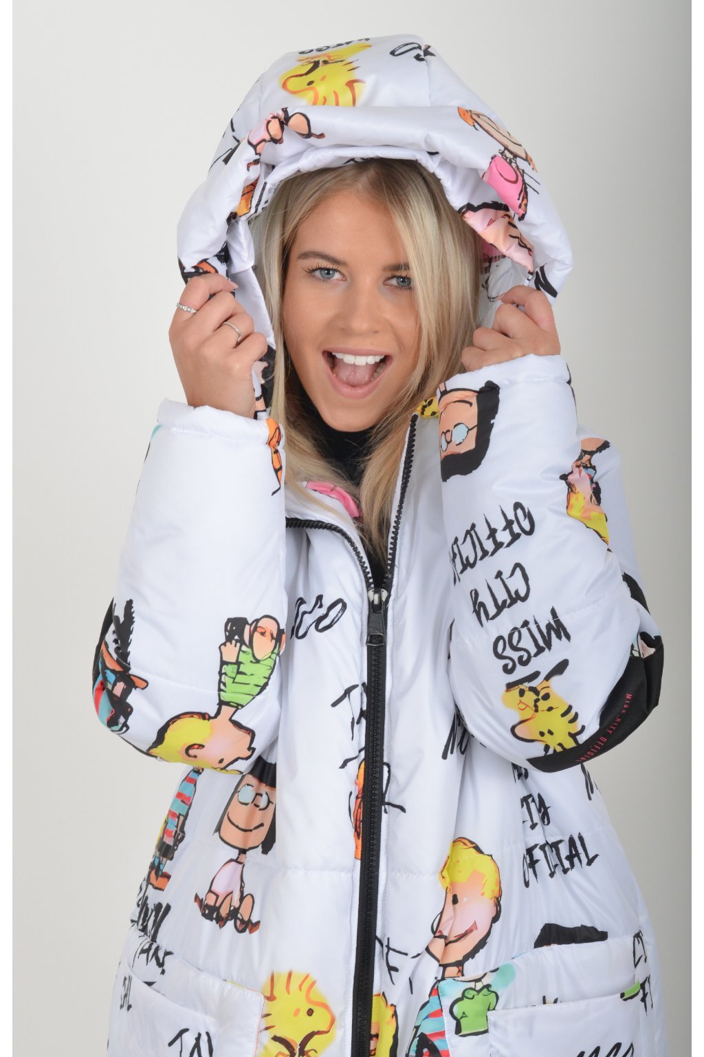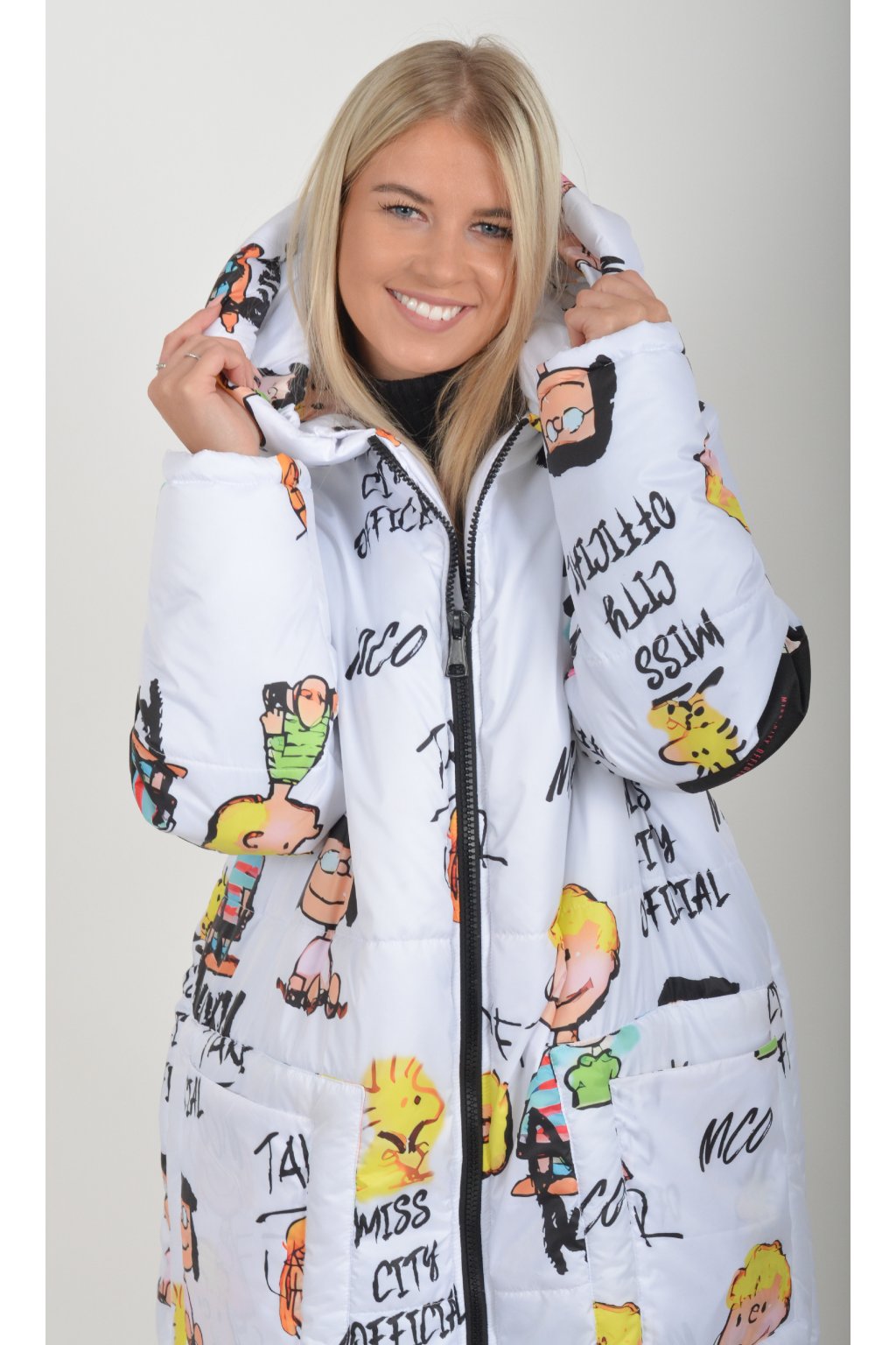 Zimní vzorovaný originální kabát z velice kvalitního a příjemného materiálu. Kabát má v přední části kapsy a kapuci. Výplň kabátku je duté vlákno.