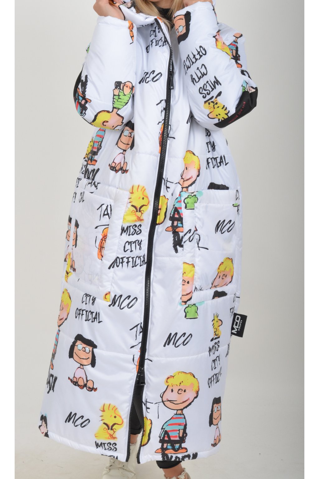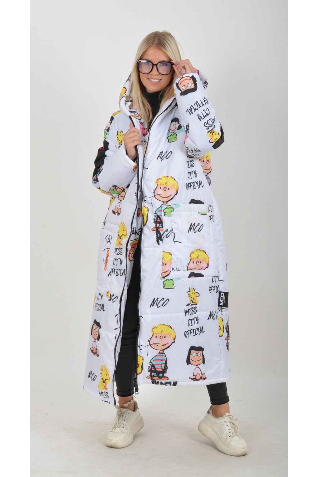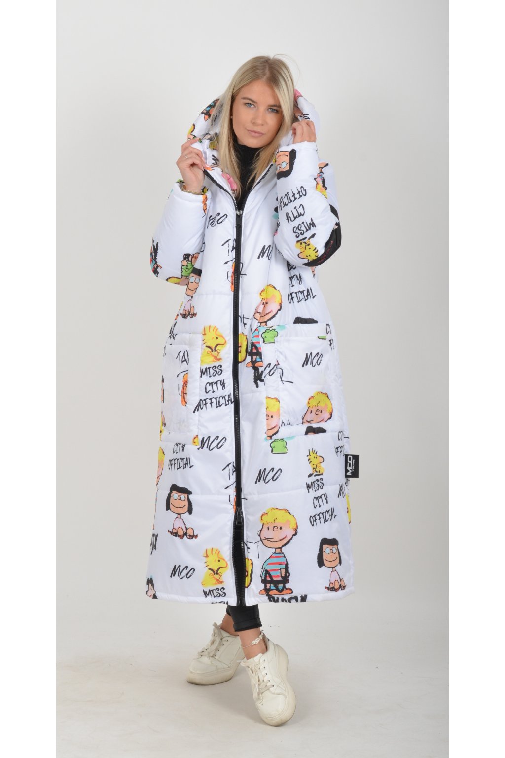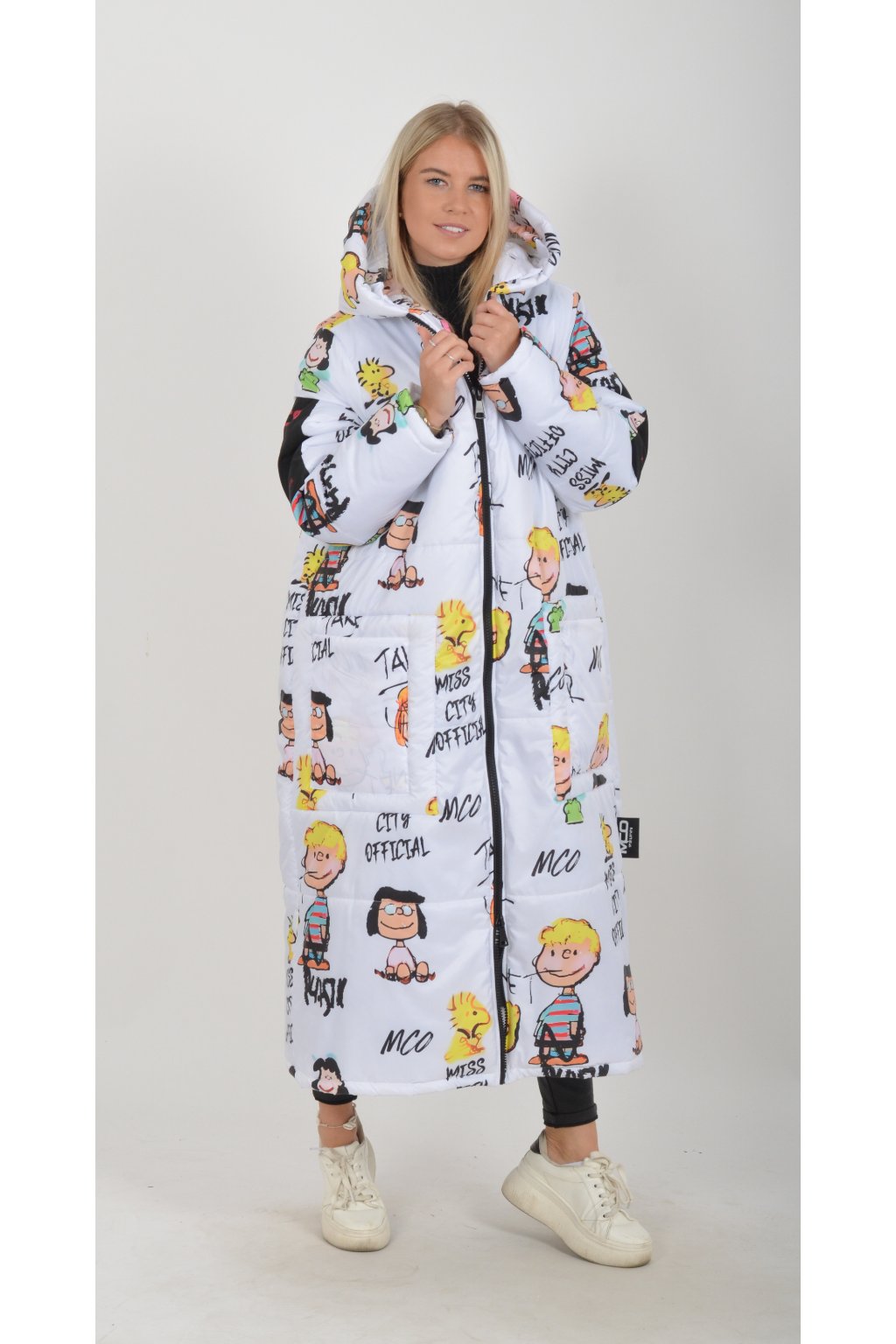 Zimní vzorovaný originální kabát z velice kvalitního a příjemného materiálu. Kabát má v přední části kapsy a kapuci. Výplň kabátku je duté vlákno.