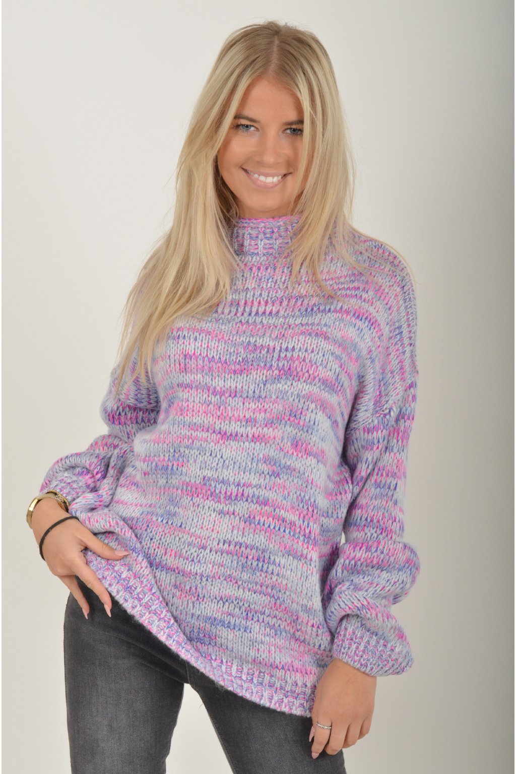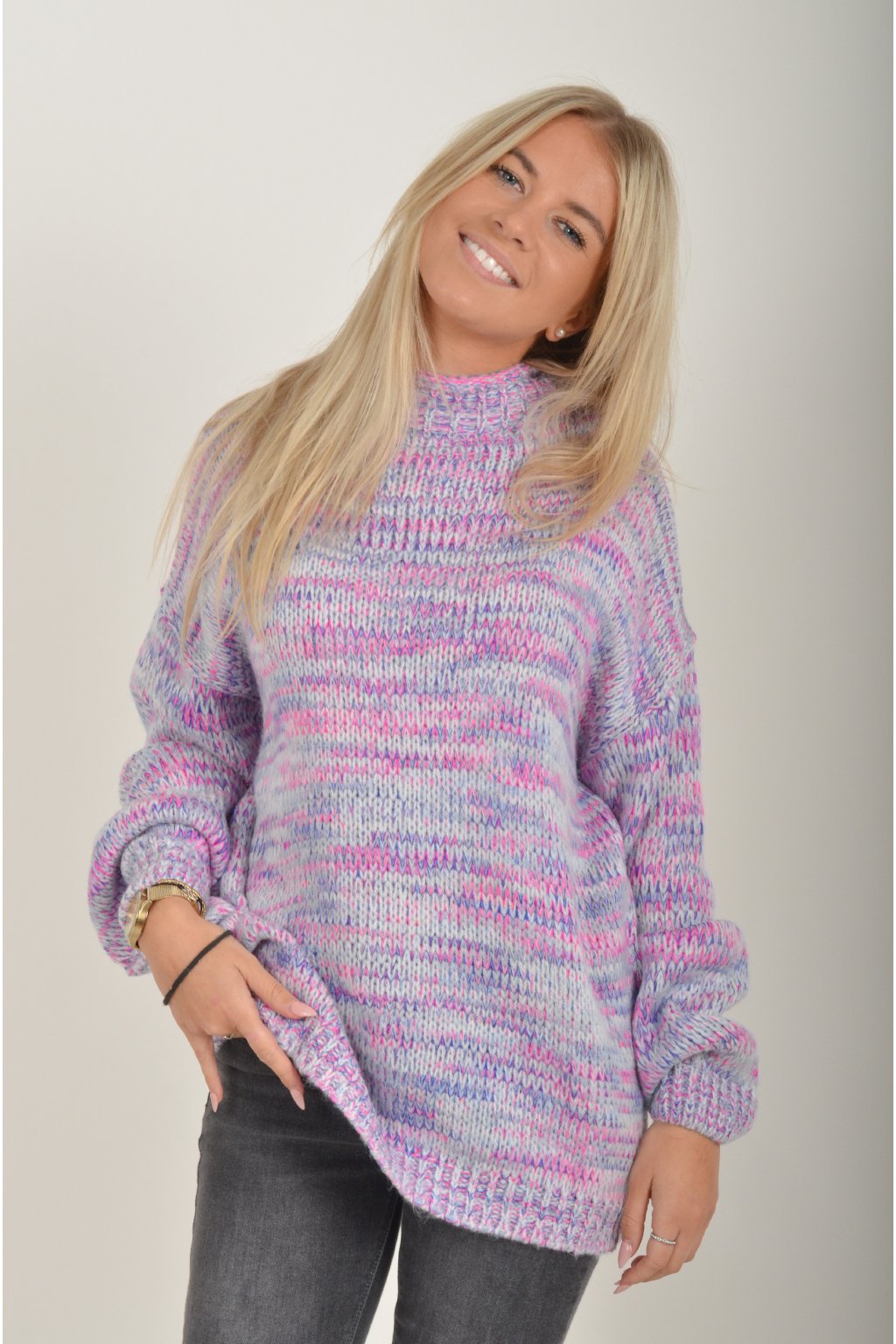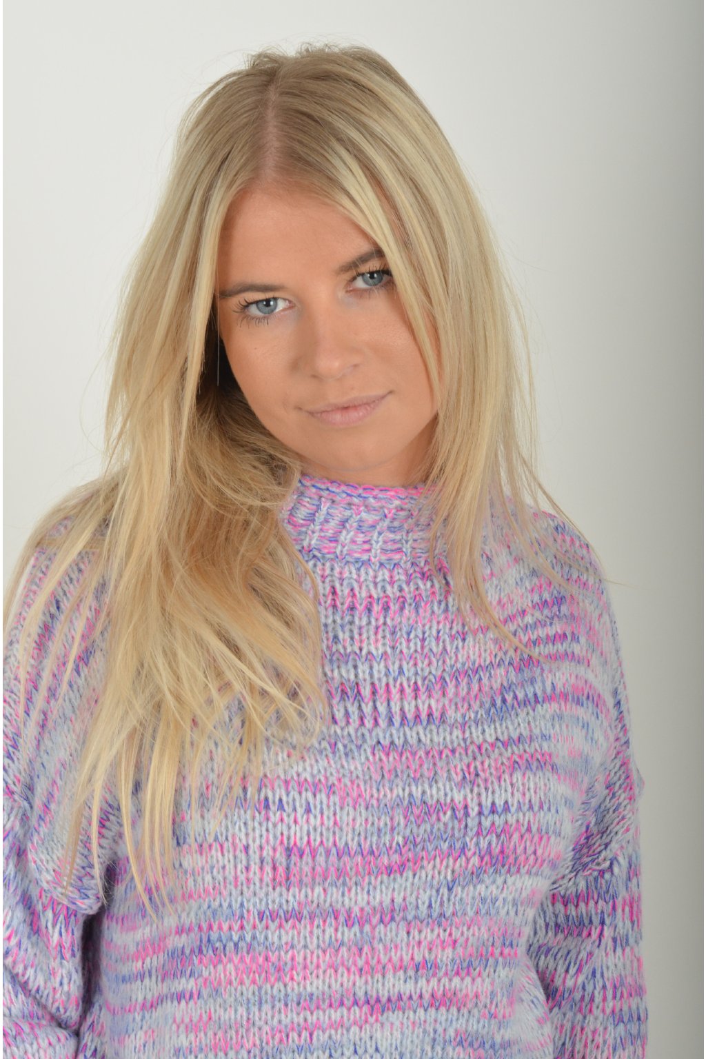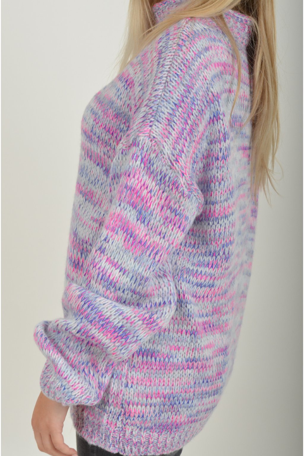 Žíhaný elastický svetr s dlouhým rukávem s barevnou kombinací, fialová, modrá a růžová. Svetr je z velice příjemného a nekousavého materiálu.