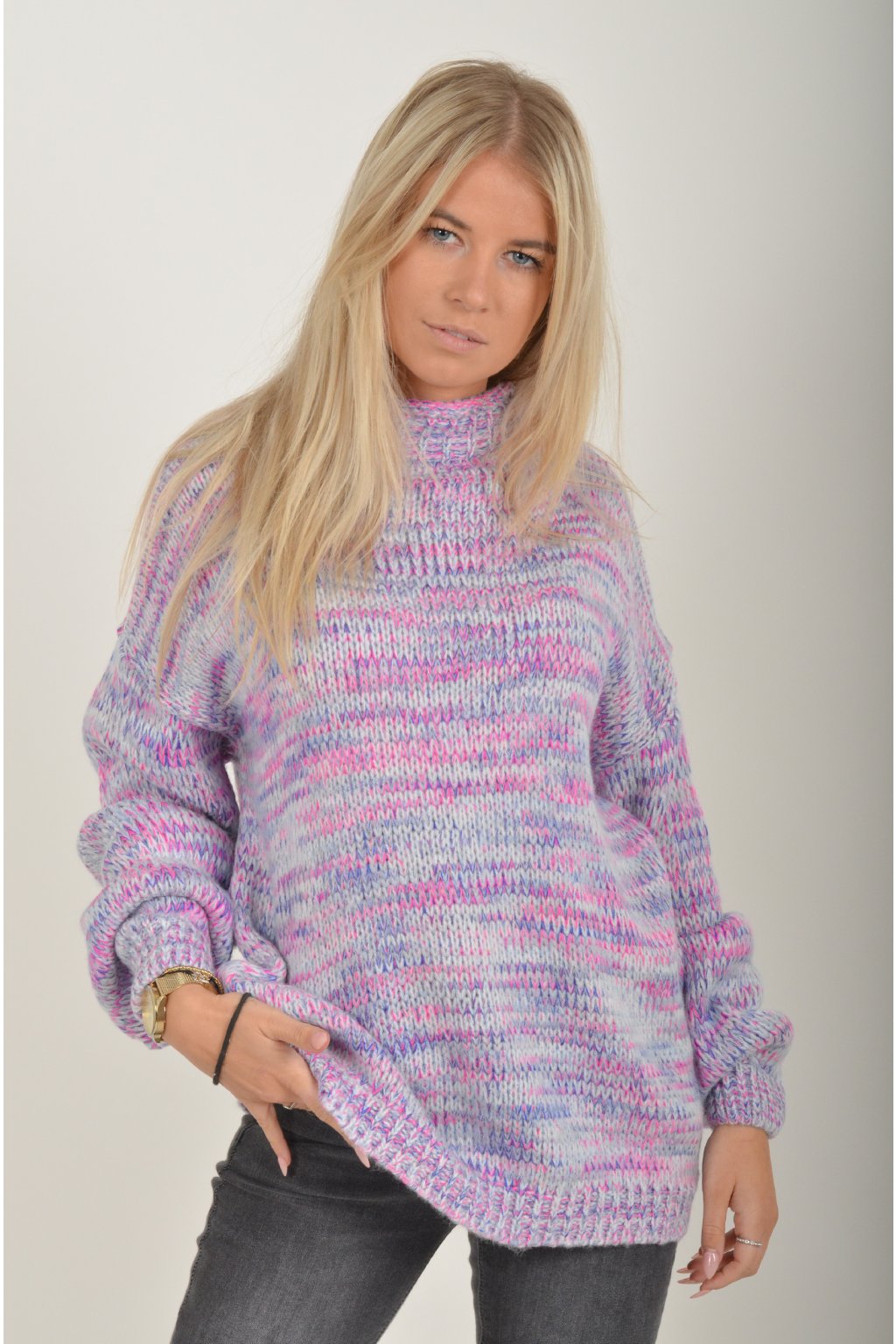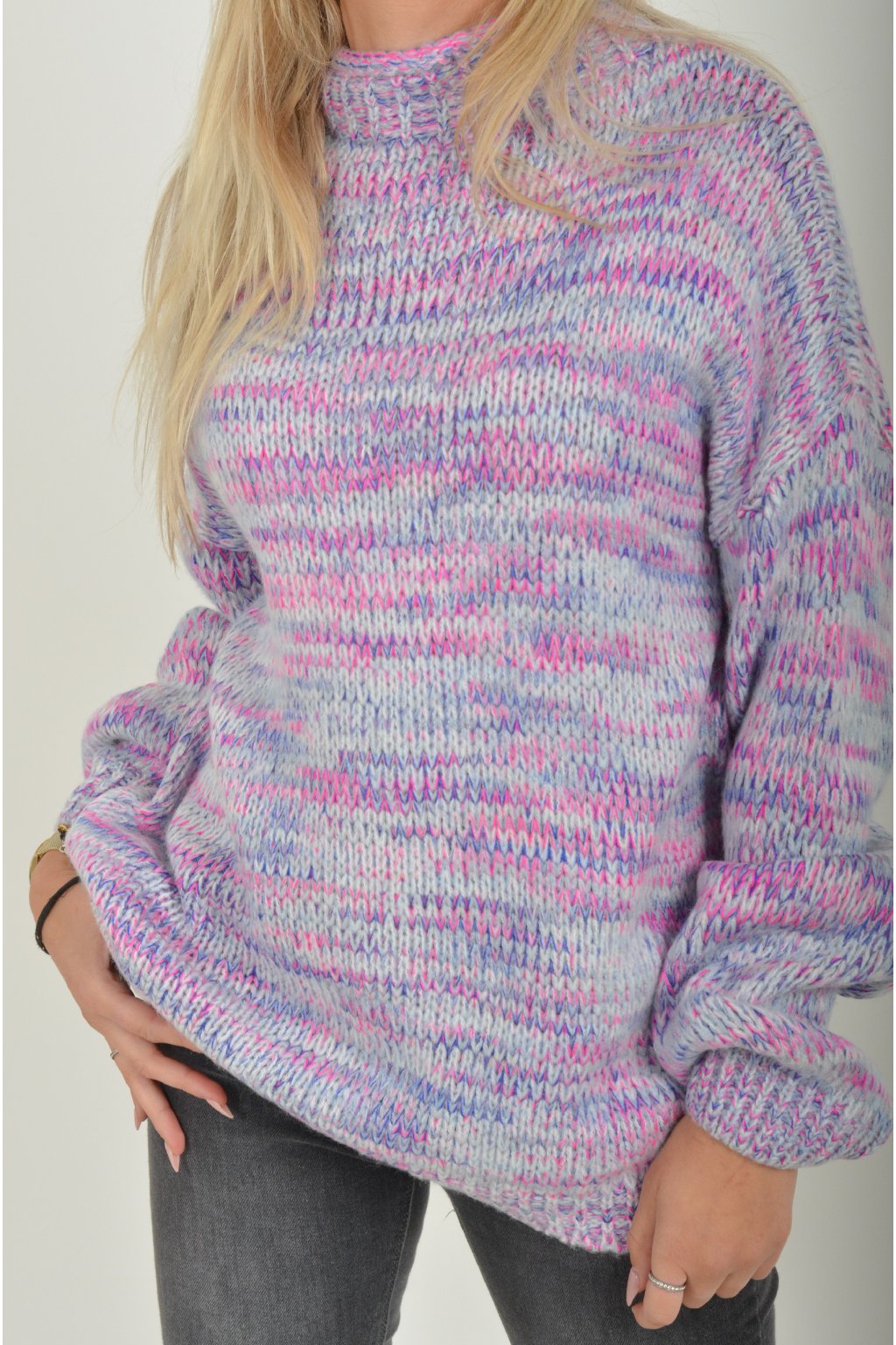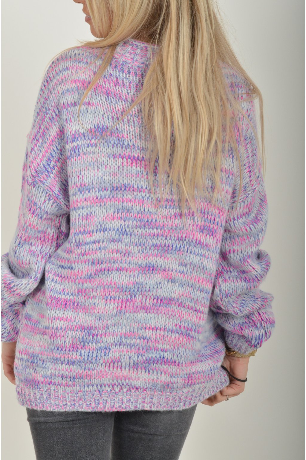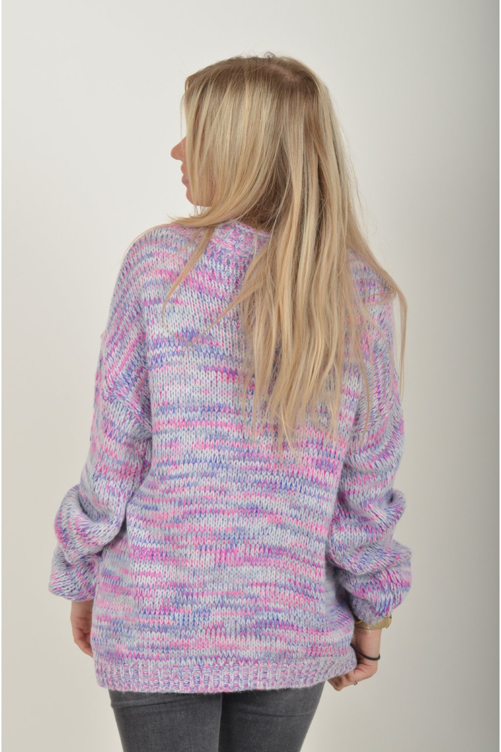 Žíhaný elastický svetr s dlouhým rukávem s barevnou kombinací, fialová, modrá a růžová. Svetr je z velice příjemného a nekousavého materiálu.