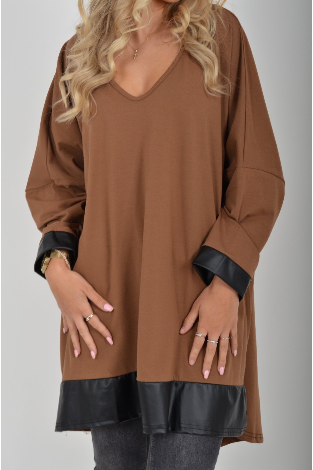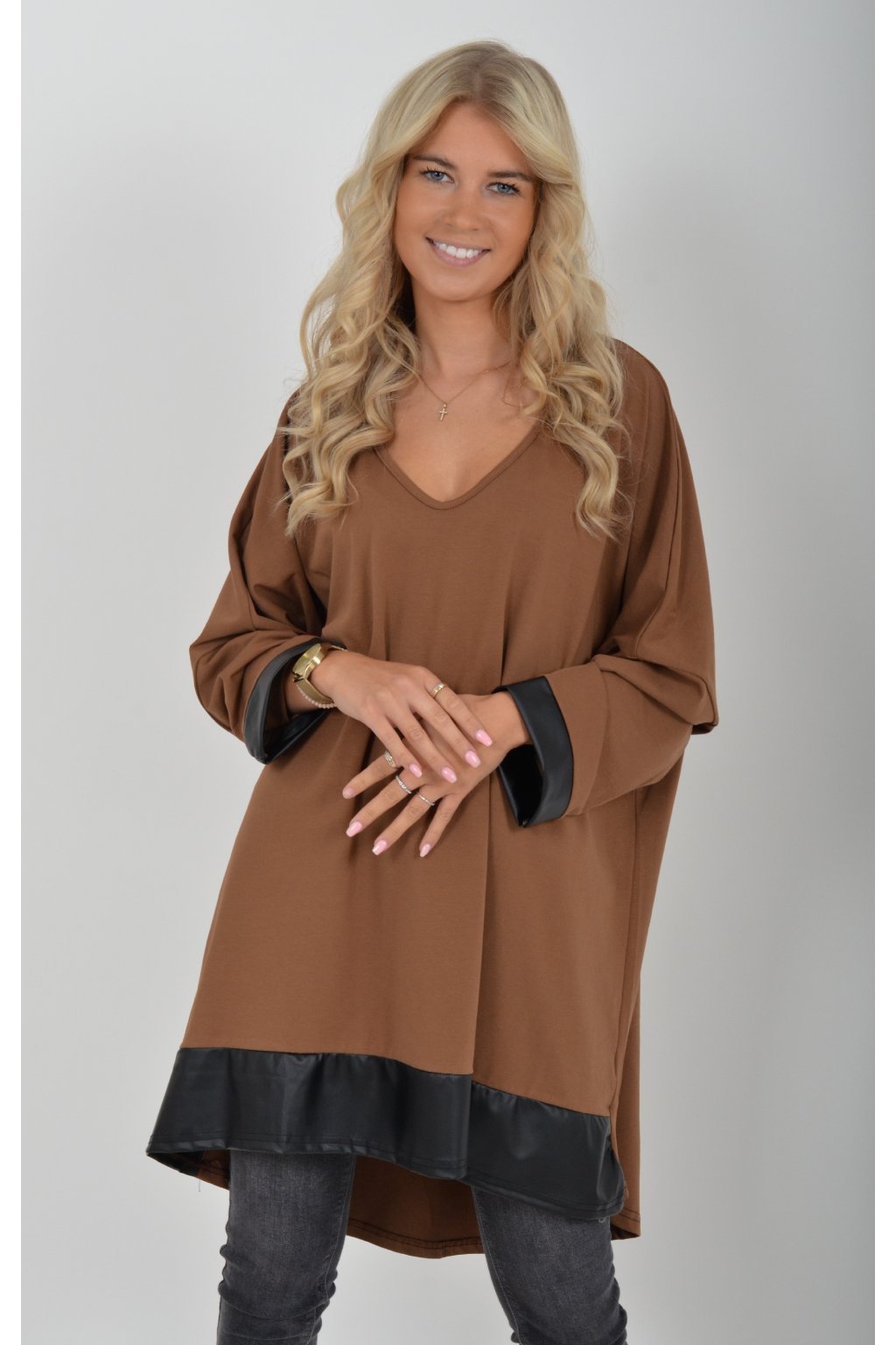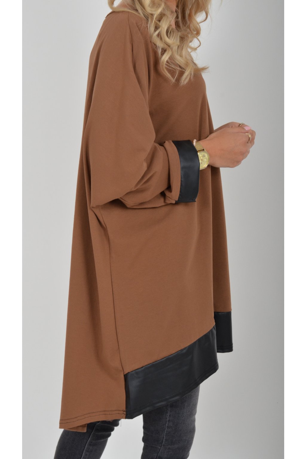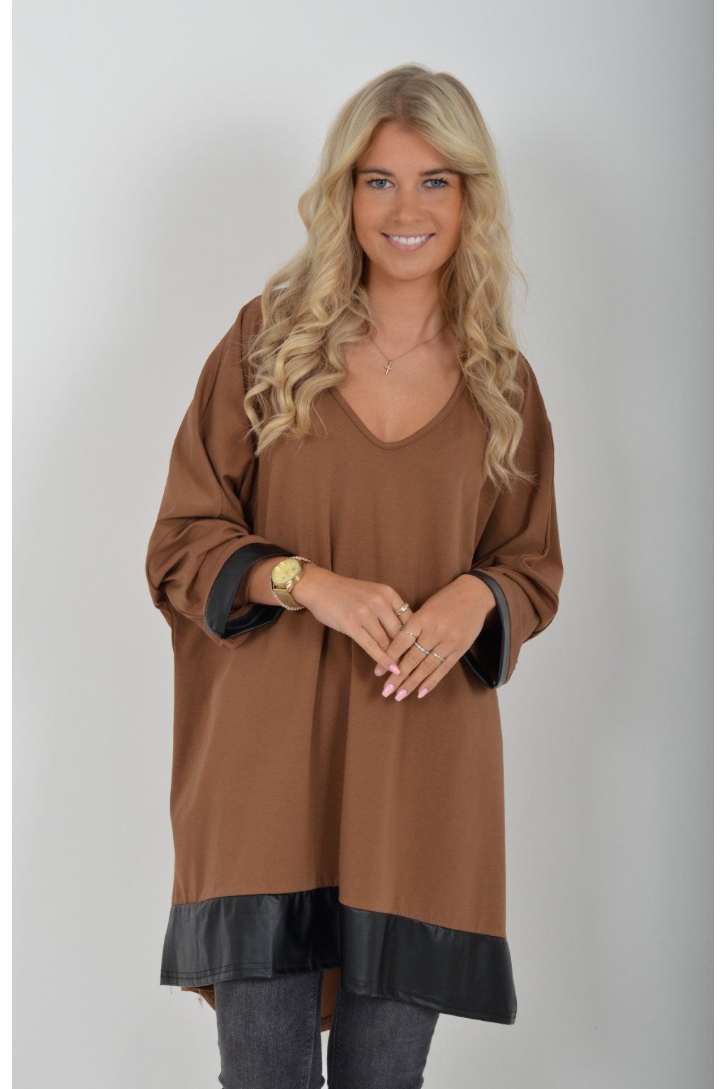 Oversize tunika s tříčtvtečním rukávem z příjemné turecké bavlny. Která je doplněna koženkovým detailem na spodní části a rukávech. Je vhodná pro každodenní nošení.