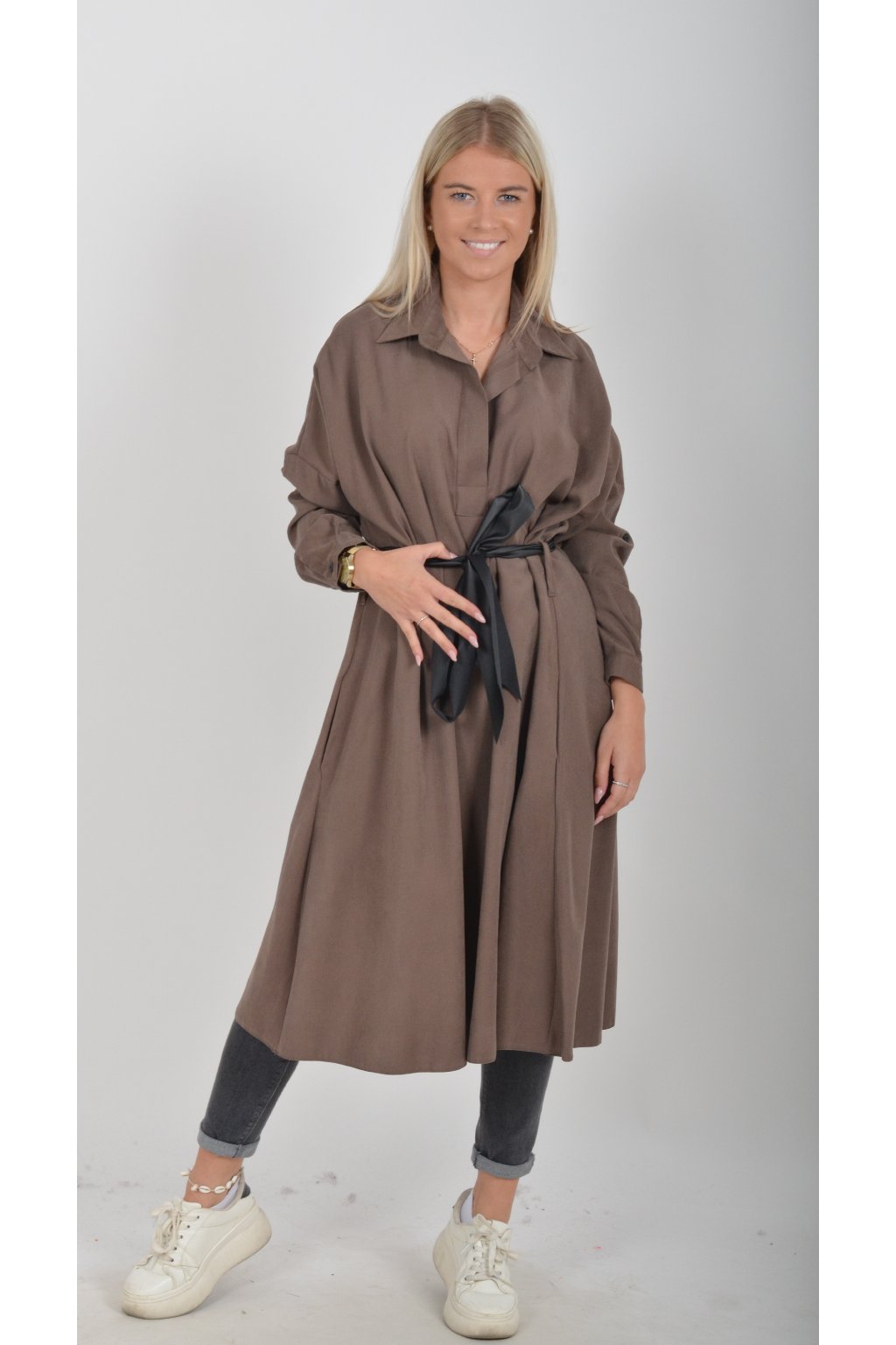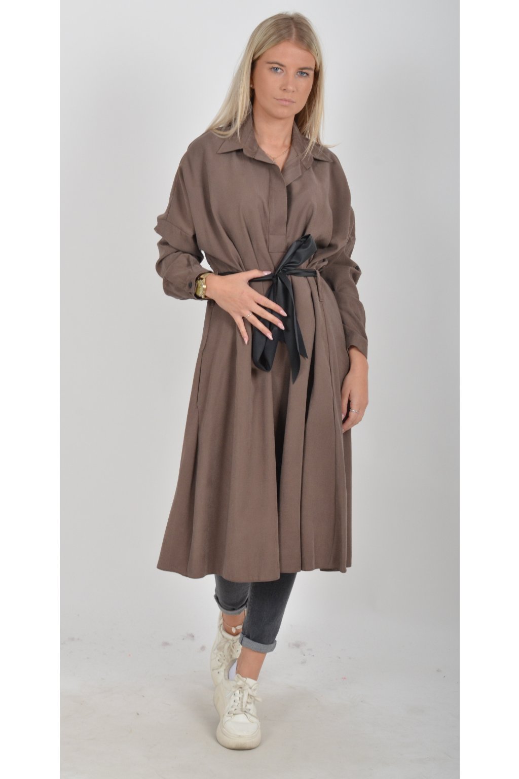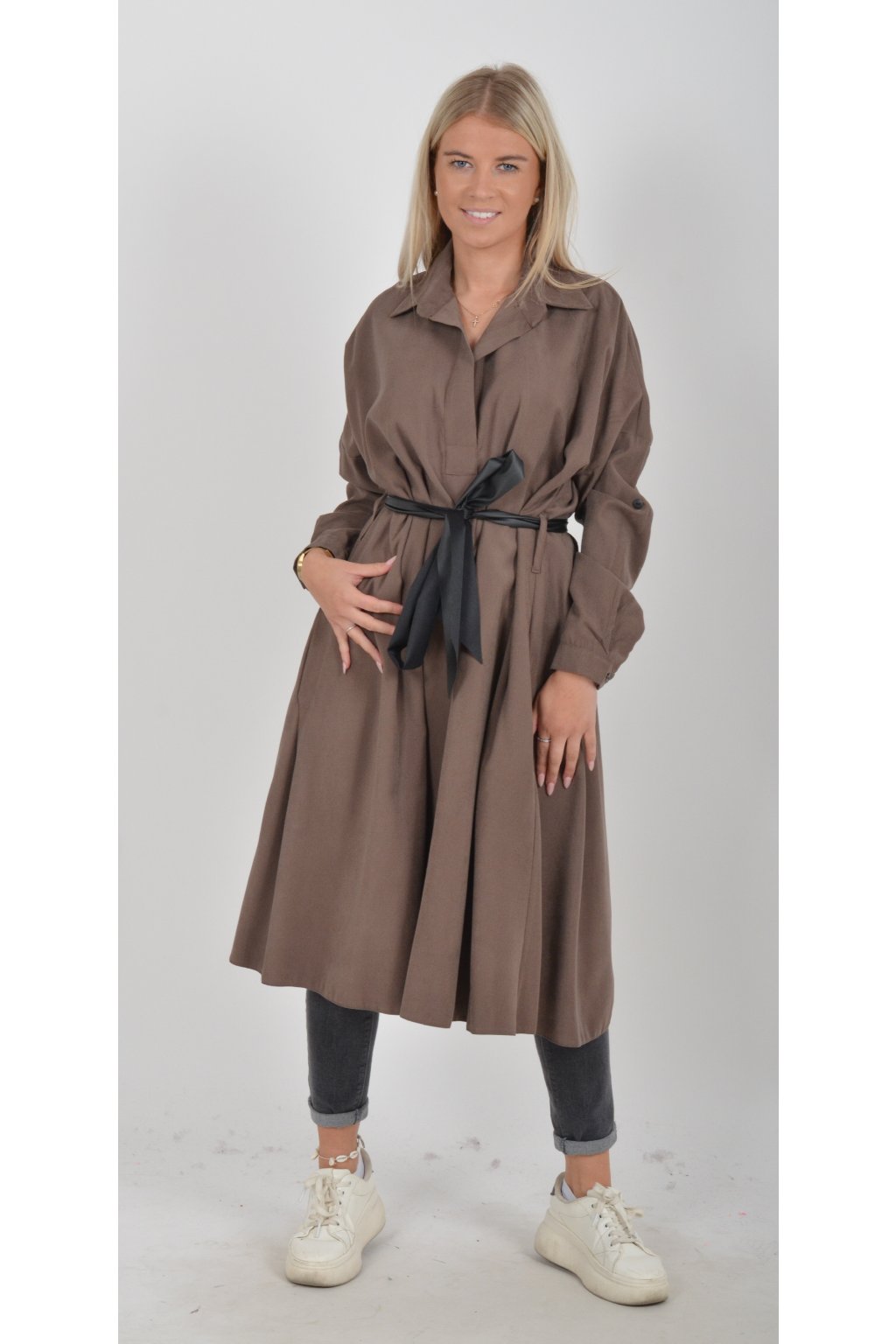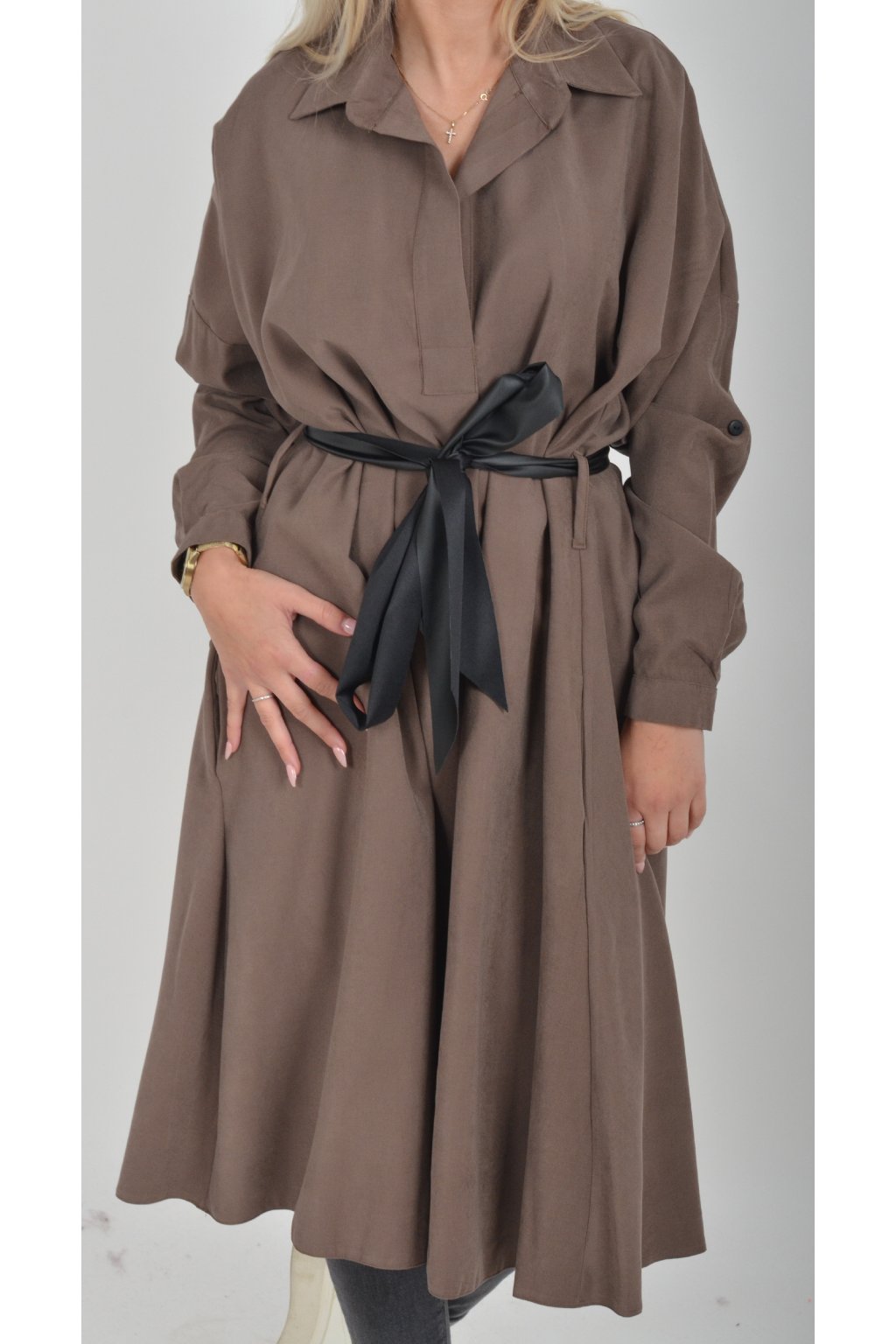 Jednou za dámu, jednou jen tak ven, tyto šaty splní oboje. Mají košilový áčkový střih s rozevlátou sukní, která je v zadní části mírně delší. Šaty mají na bocích kapsy. Rukávy jsou dlouhé, ale dají se zkrátit na knoflíček. Výrazným doplňkem šatů je pásek s imitací kůže, který můžete jakkoliv vázat a kombinovat. K šatům doporučujeme ozdobnou brož nebo šperky z naší kolekce.