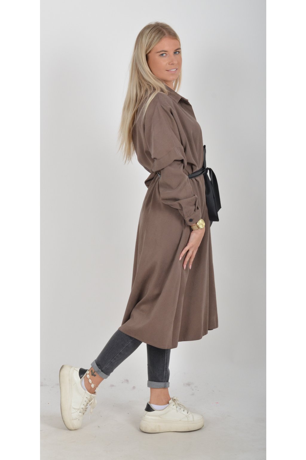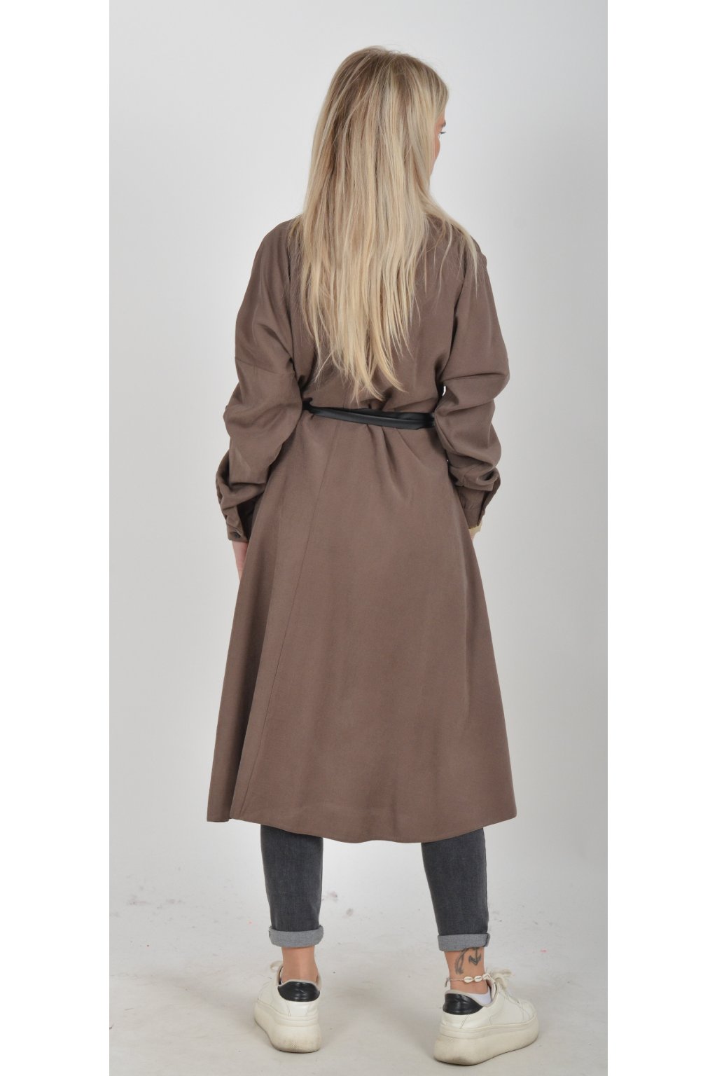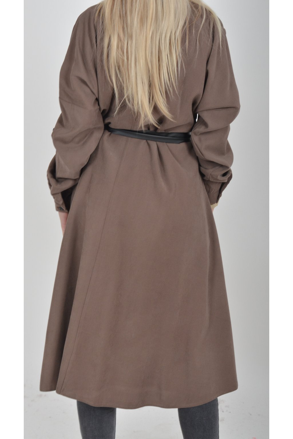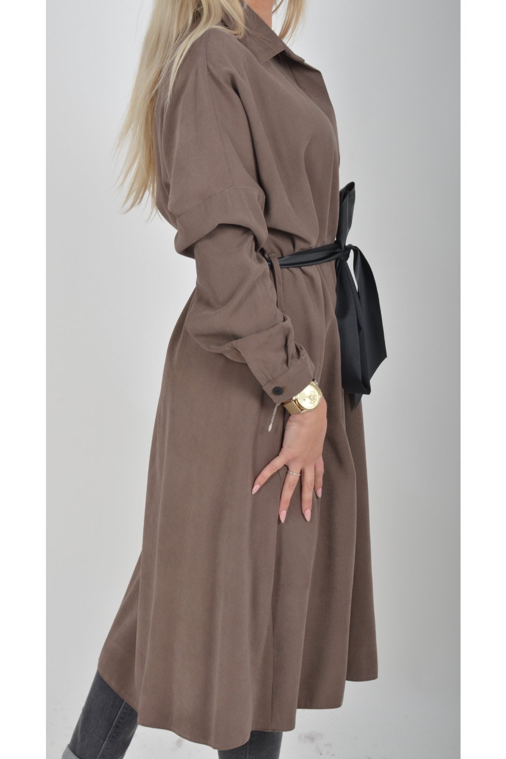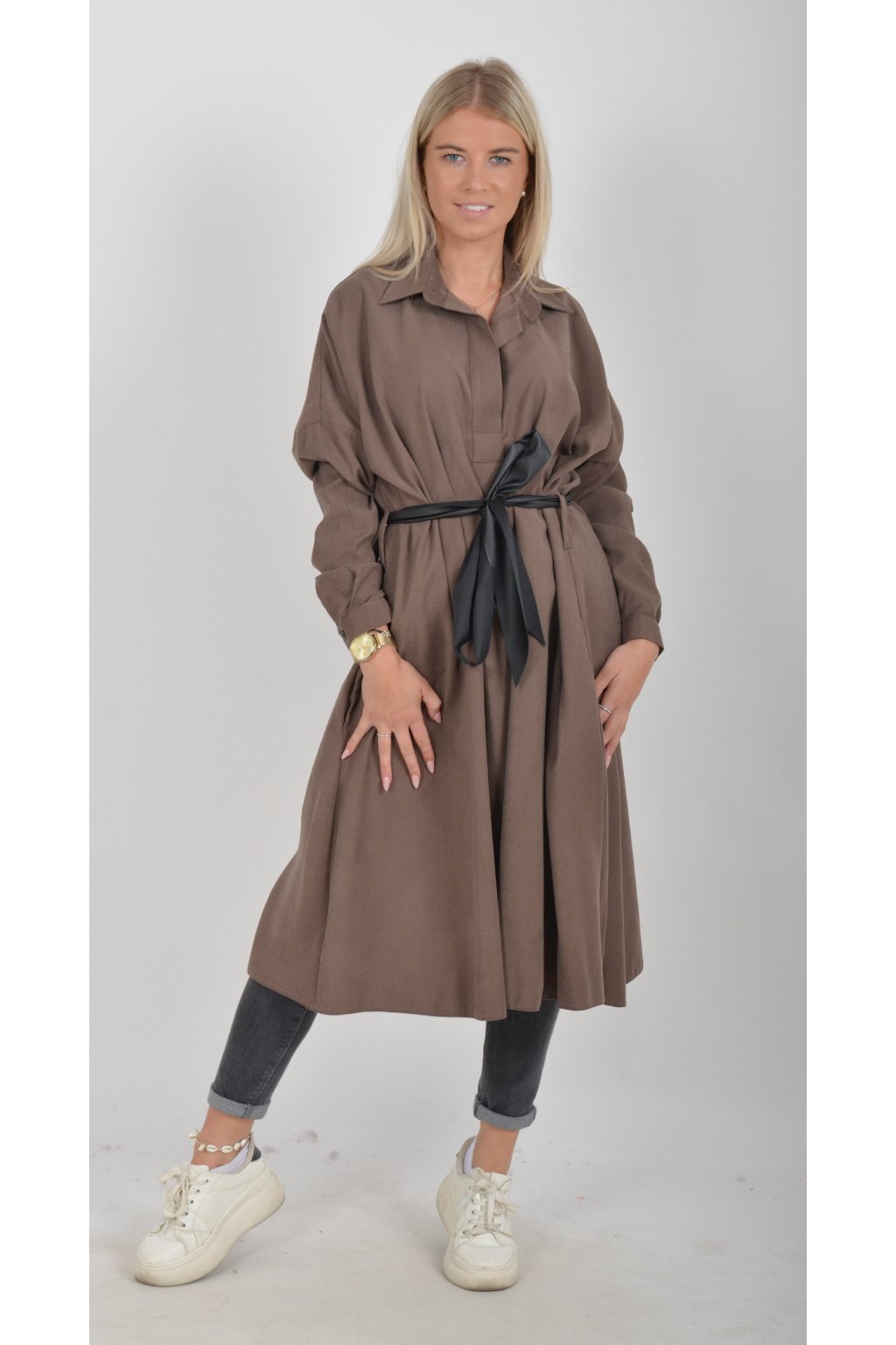 Jednou za dámu, jednou jen tak ven, tyto šaty splní oboje. Mají košilový áčkový střih s rozevlátou sukní, která je v zadní části mírně delší. Šaty mají na bocích kapsy. Rukávy jsou dlouhé, ale dají se zkrátit na knoflíček. Výrazným doplňkem šatů je pásek s imitací kůže, který můžete jakkoliv vázat a kombinovat. K šatům doporučujeme ozdobnou brož nebo šperky z naší kolekce.