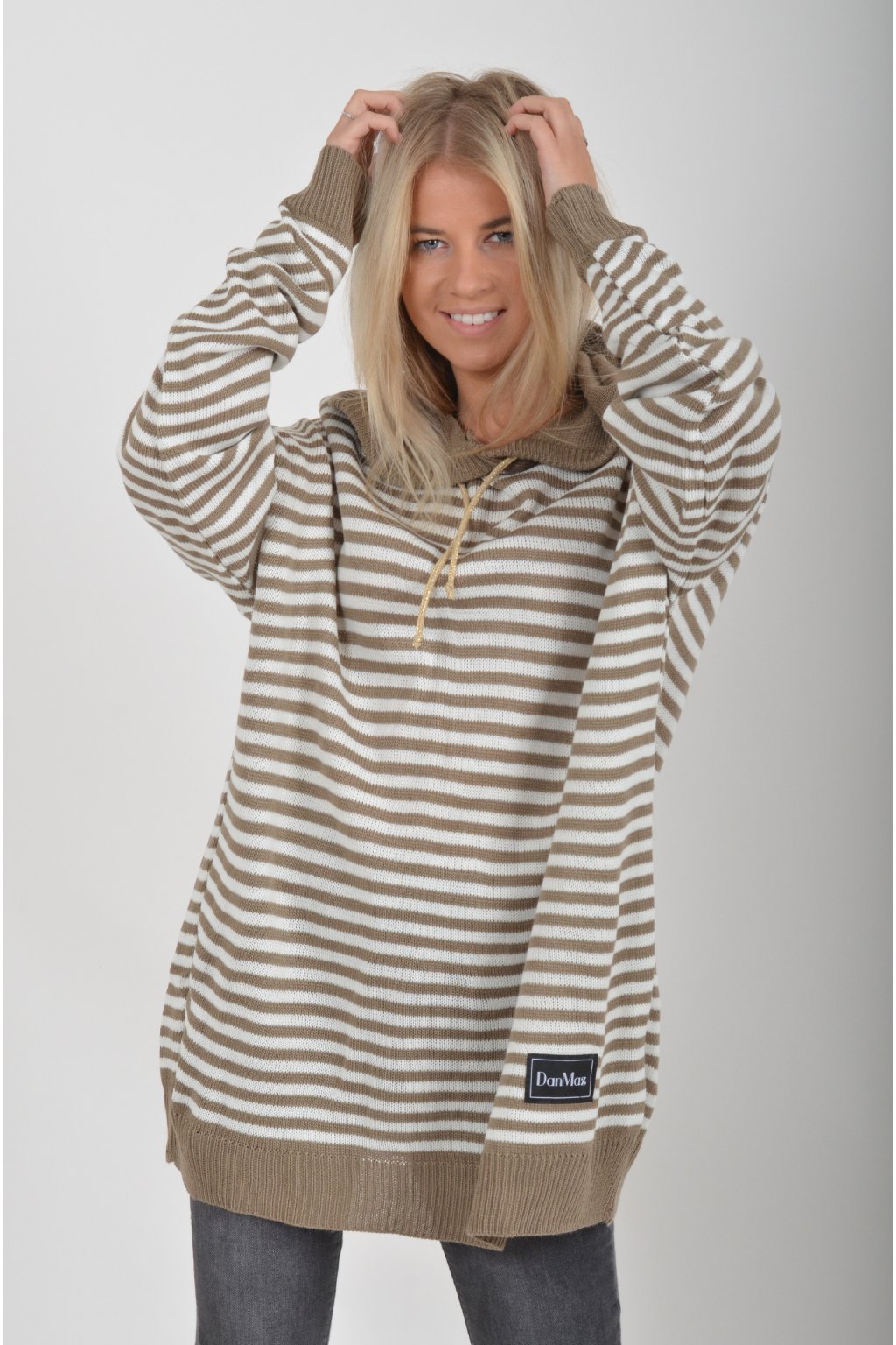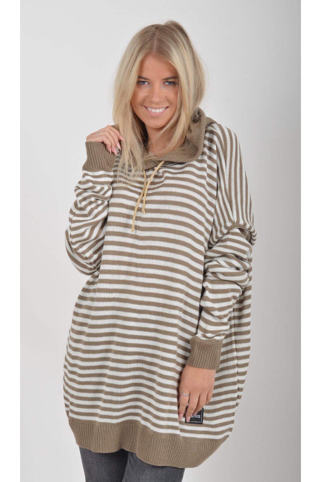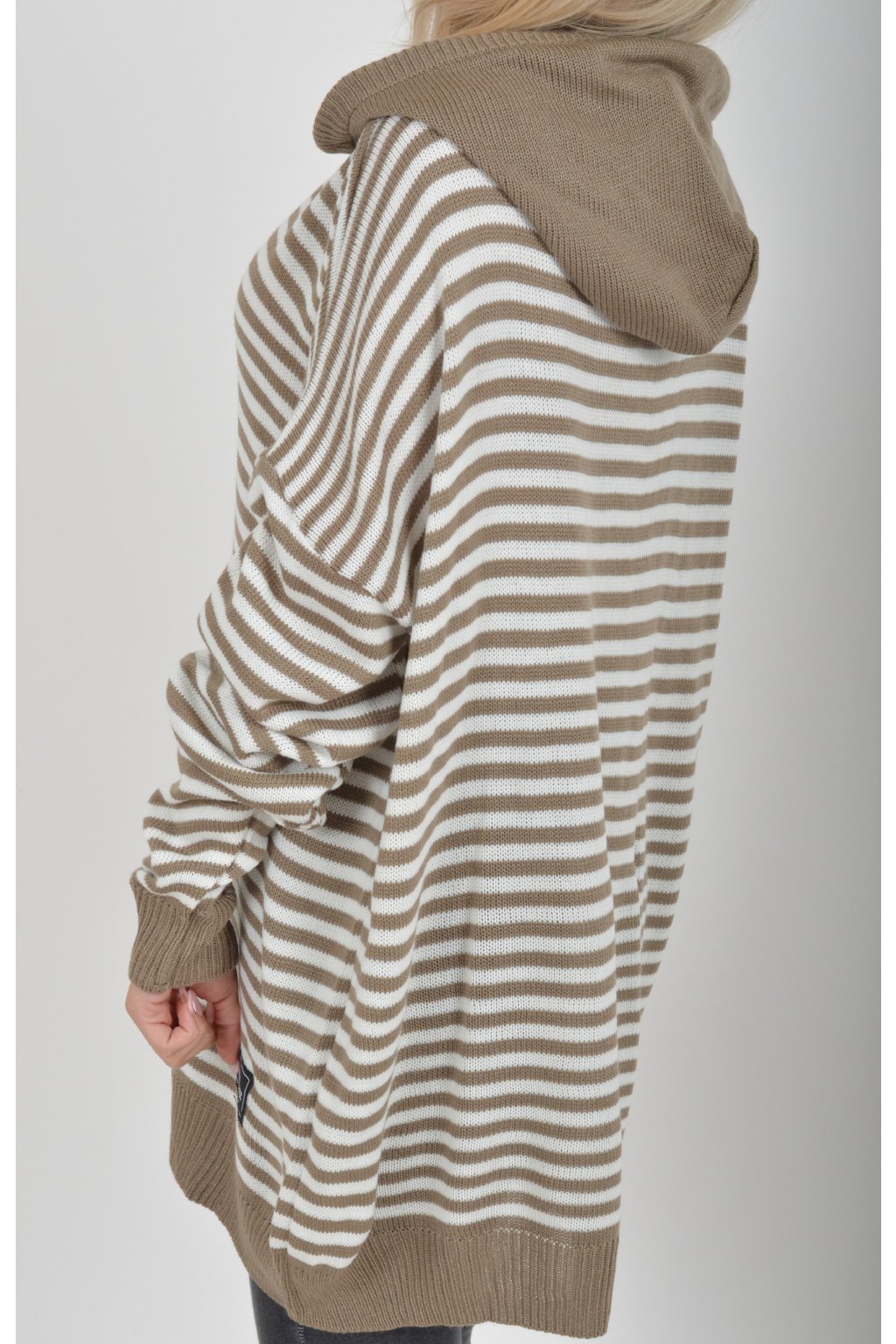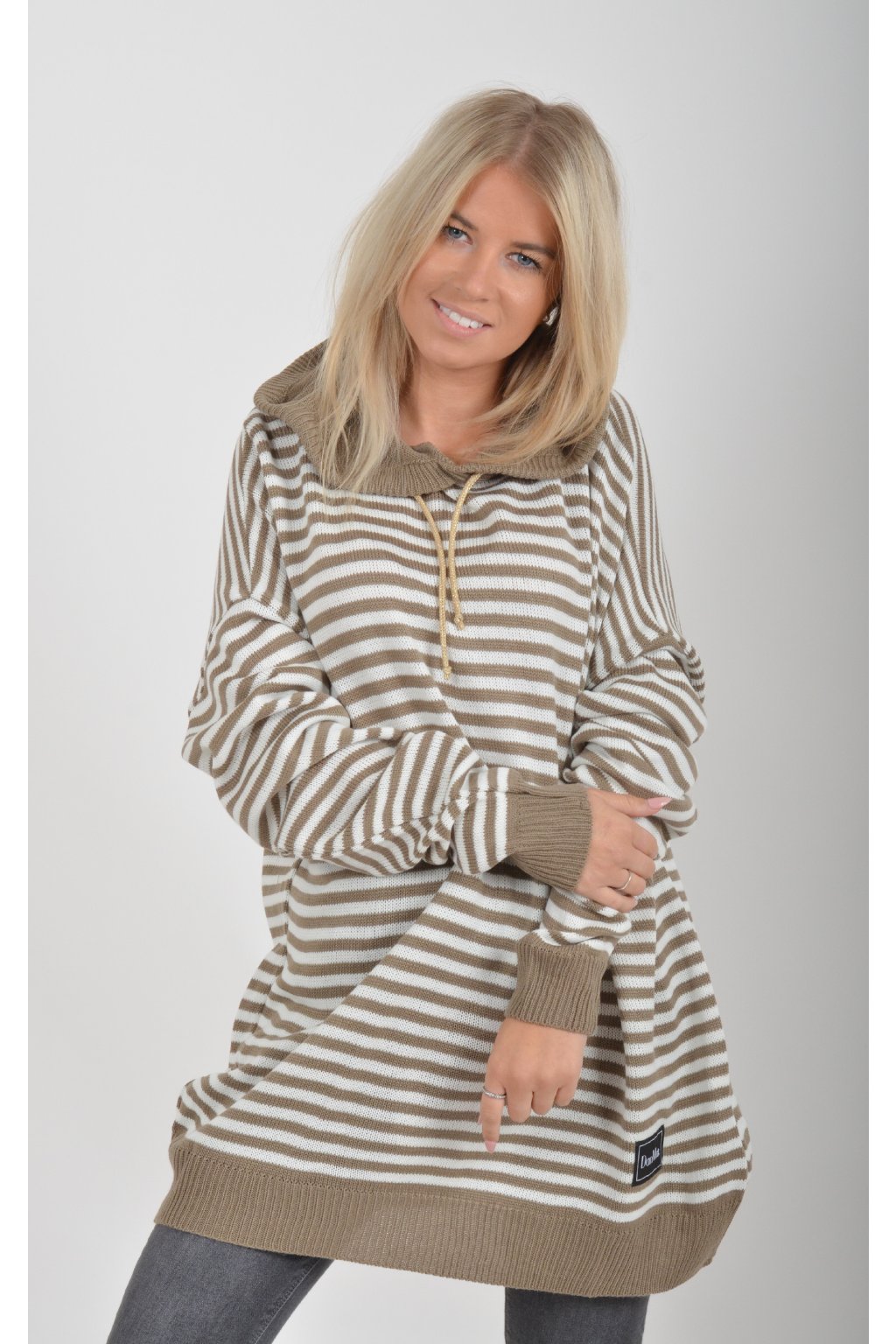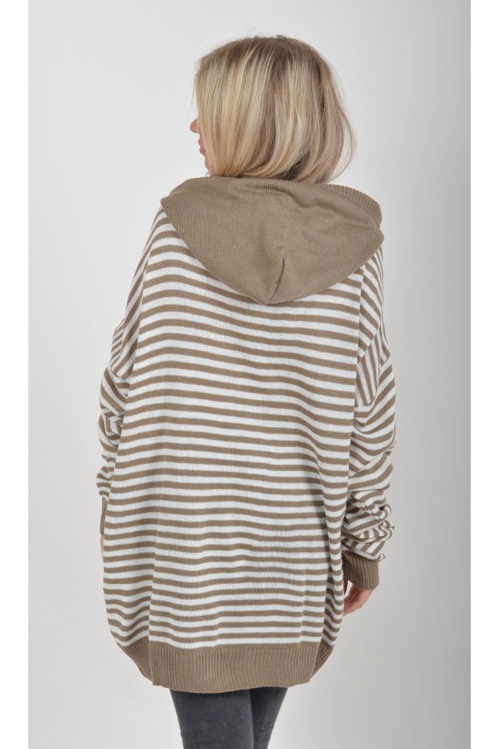 Pruhovaný svetr s kapucí a dlouhým rukávem. Materiál je nekousavý a příjemný.