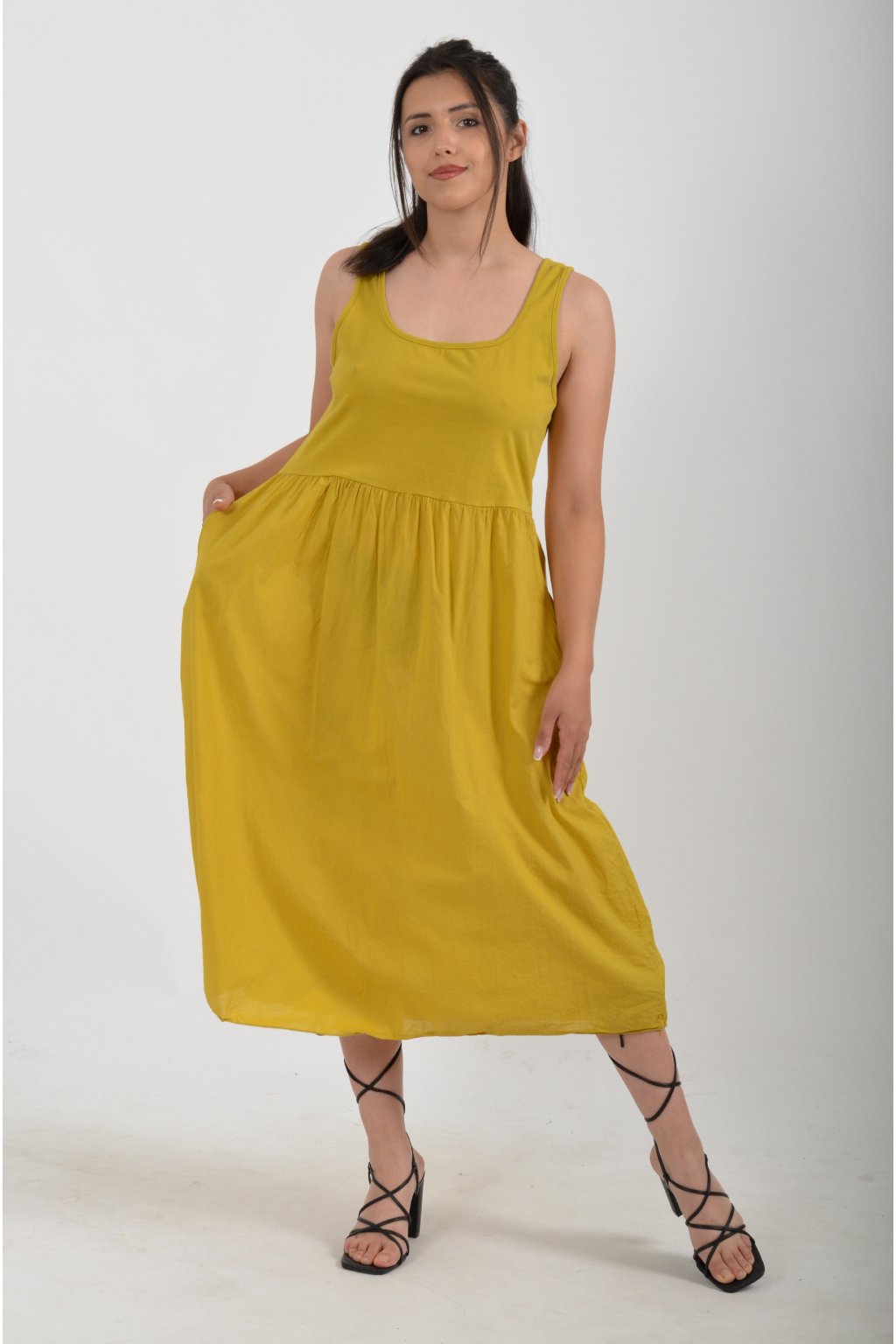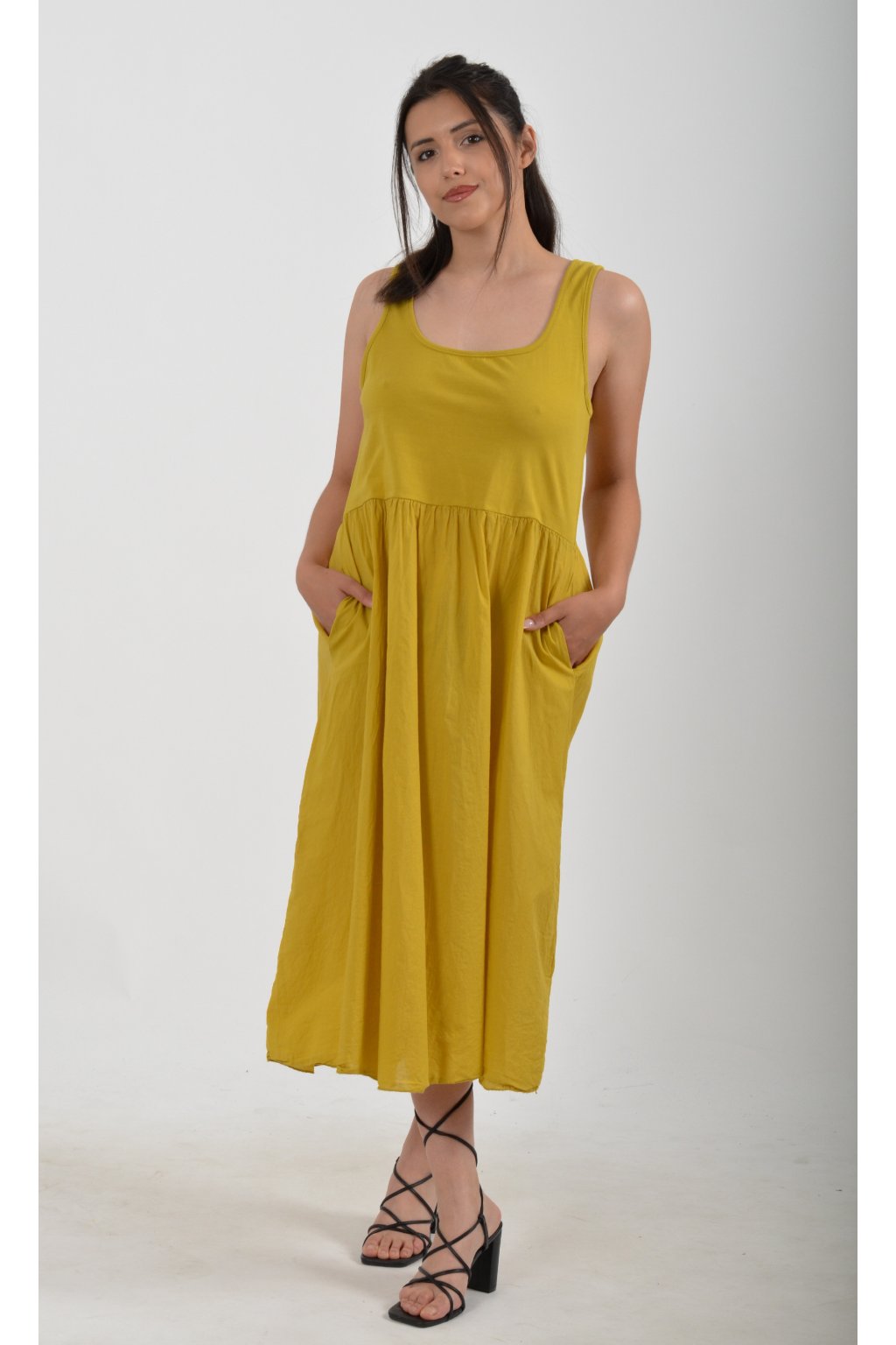 Jednobarevné šaty z velice příjemného a lehounkého materiálu. Na bocích mají kapsy a jsou vhodné pro nošení v letních dnech.