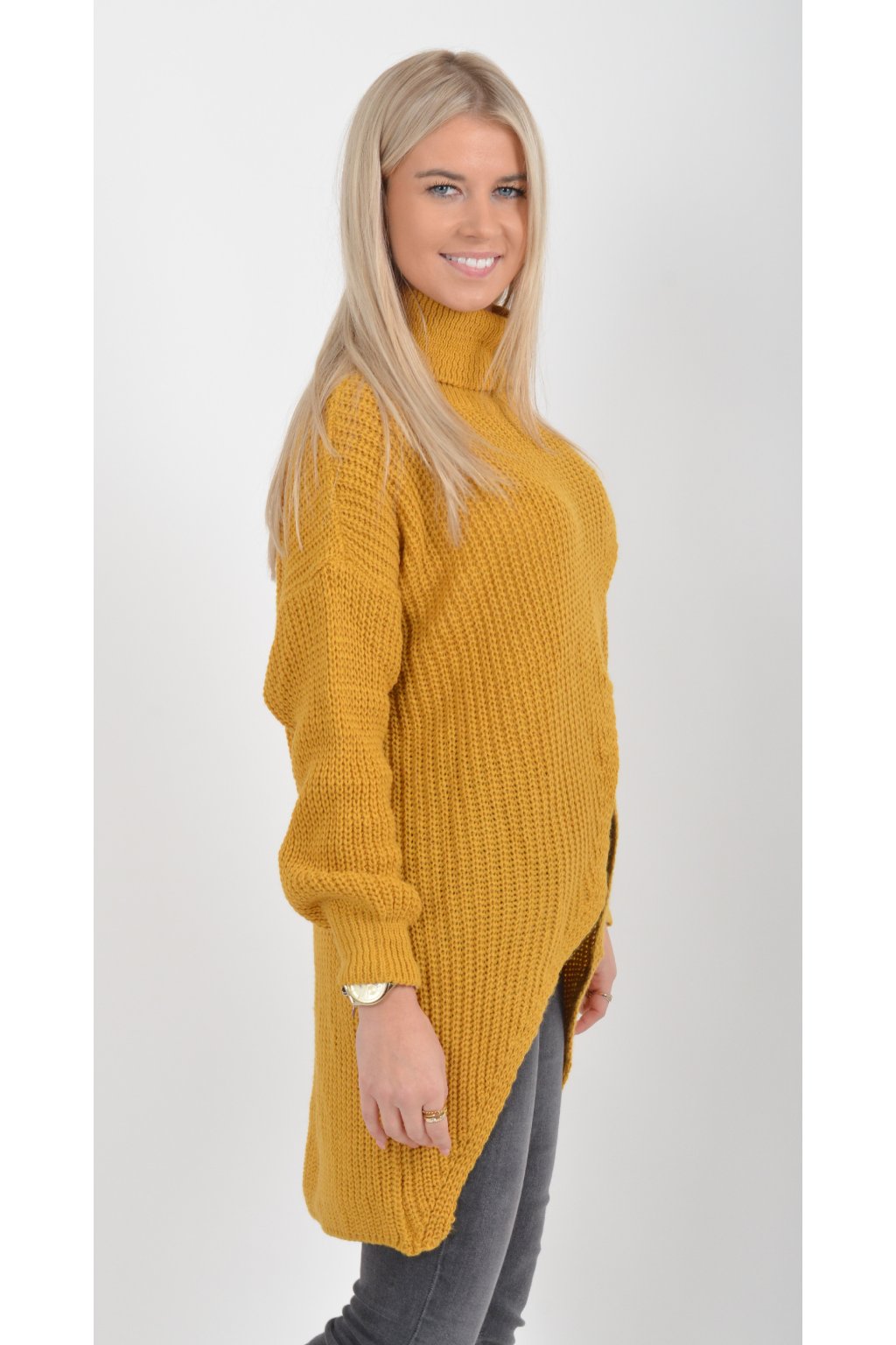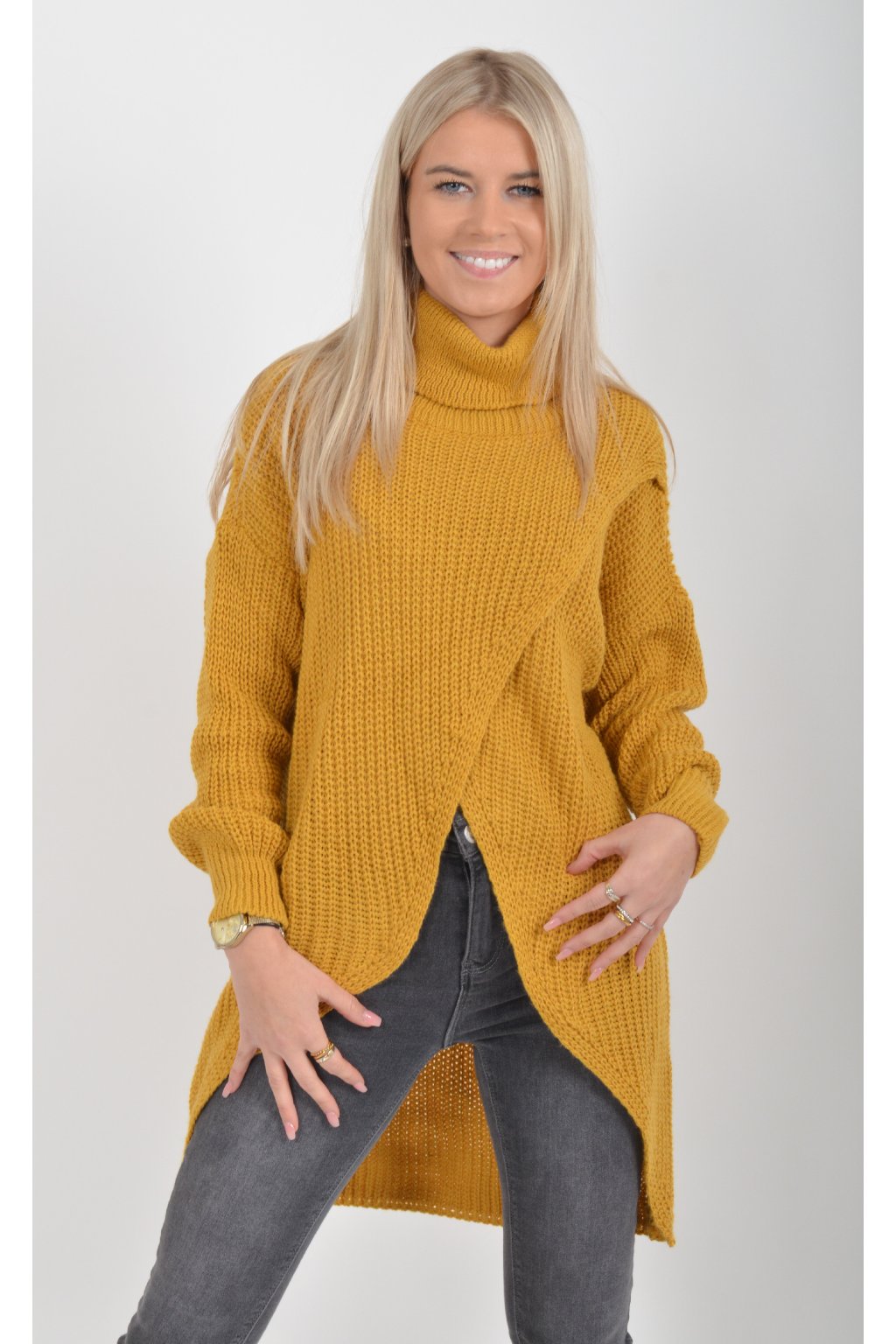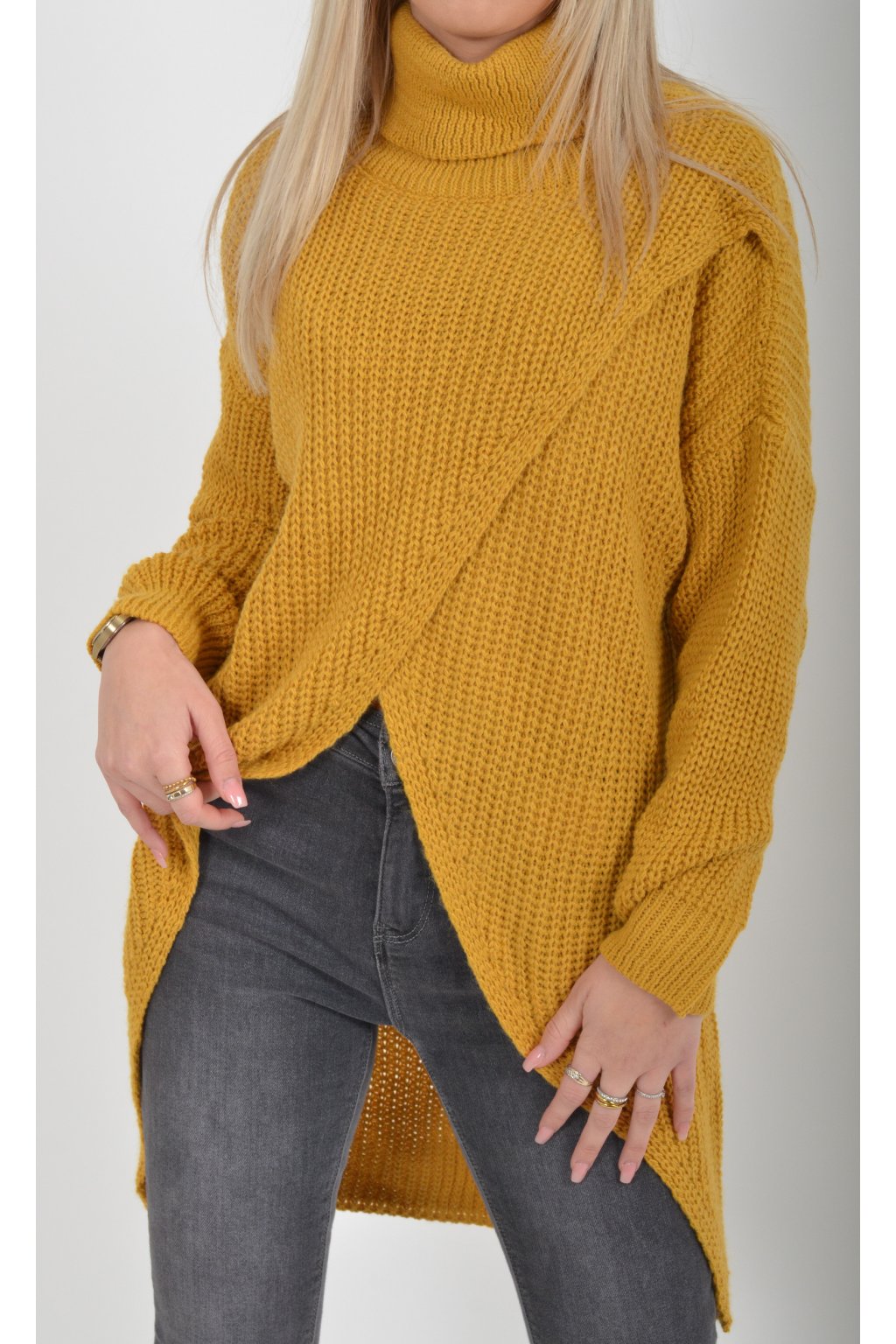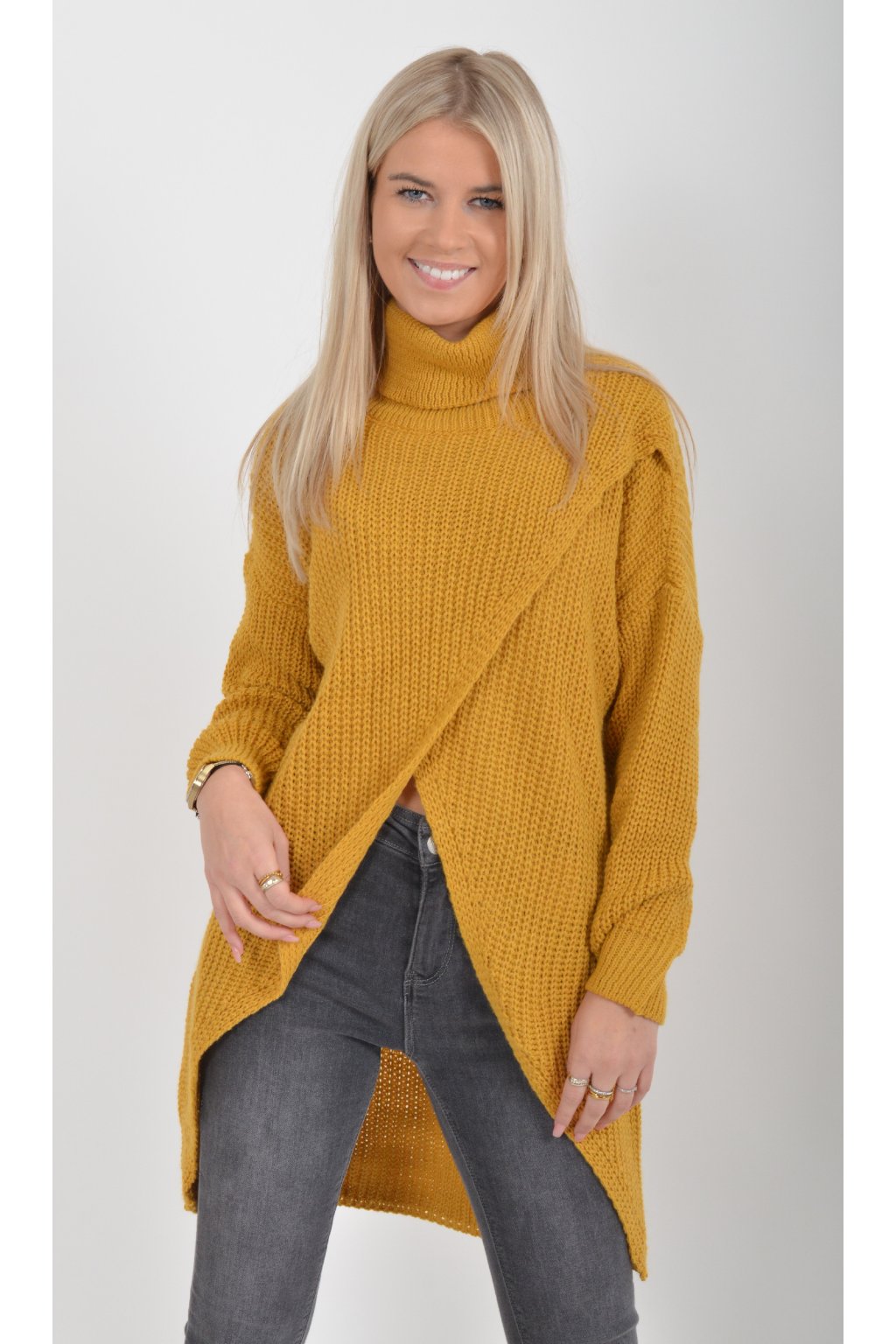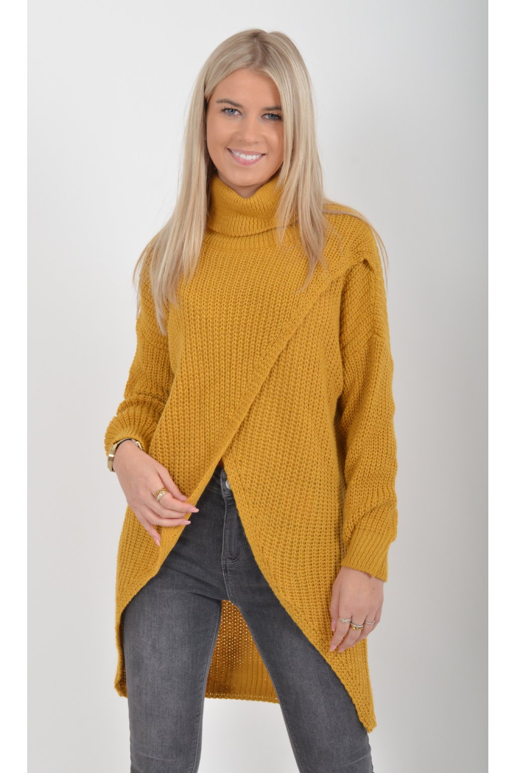 Svetr s dlouhým rukávem a rolákem asymetrického střihu v přední části. Je vyrobený z velice příjemného a nekousavého materiálu.