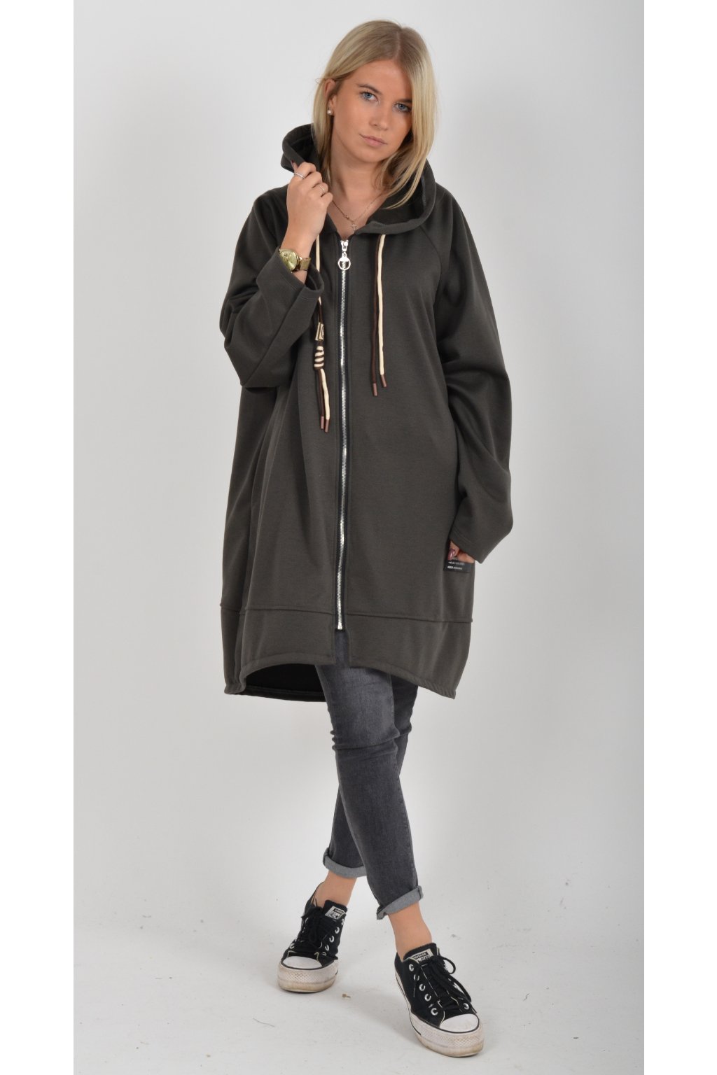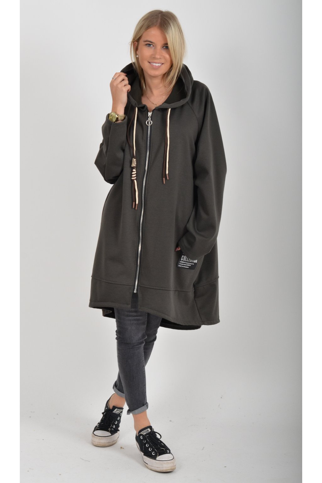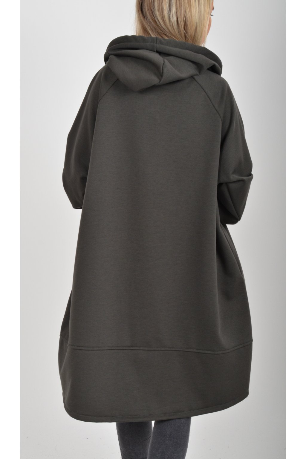 Mikina s kapucí, dlouhým rukávem a kapsami na bocích. Přední část je kratší než zadní. Je vyrobena z velice příjemného a kvalitního materiálu.