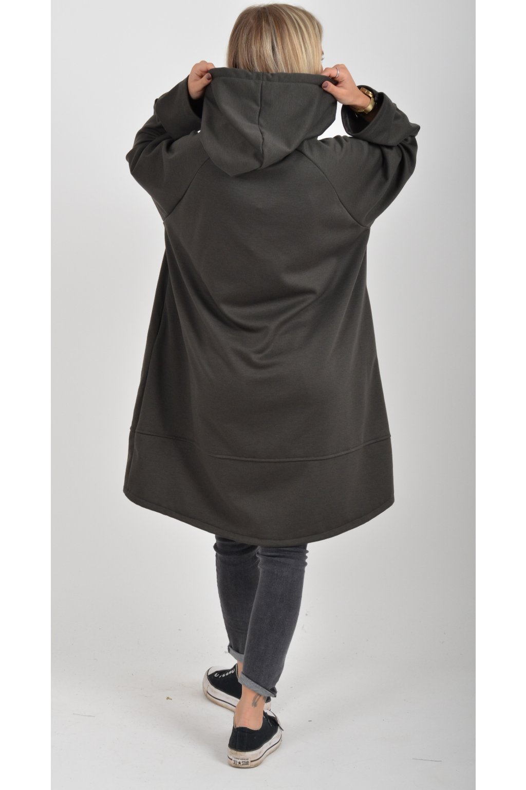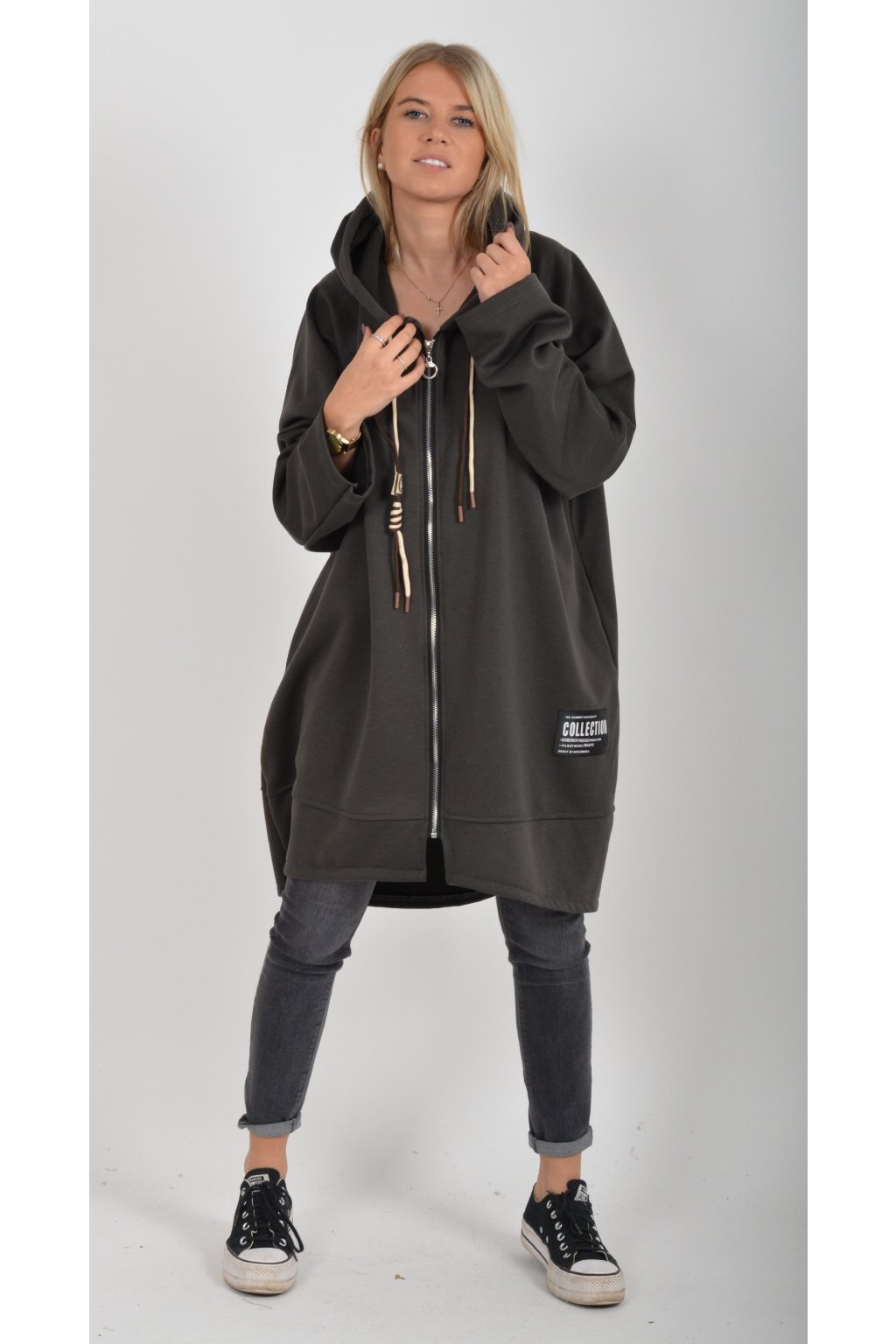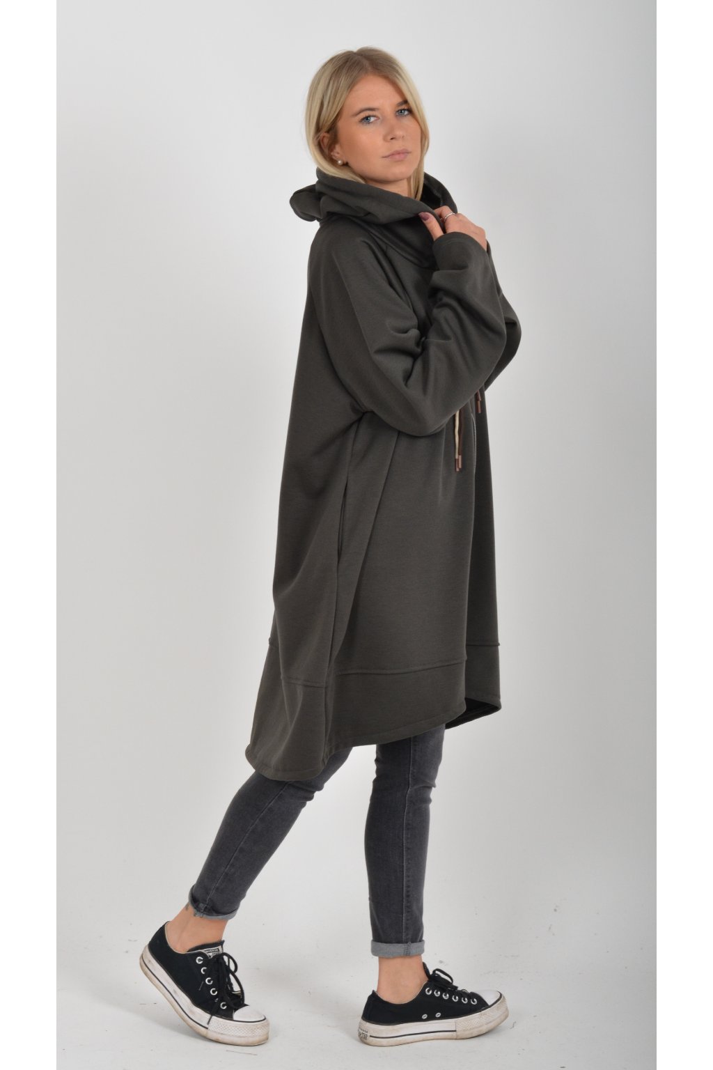 Mikina s kapucí, dlouhým rukávem a kapsami na bocích. Přední část je kratší než zadní. Je vyrobena z velice příjemného a kvalitního materiálu.