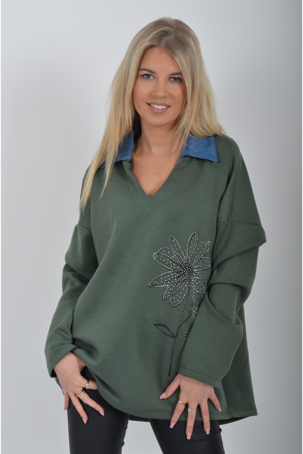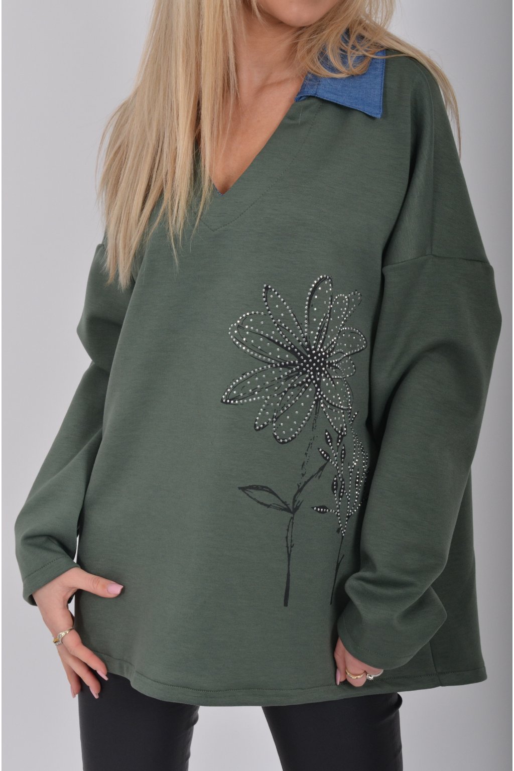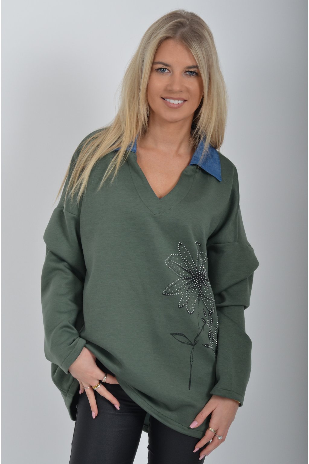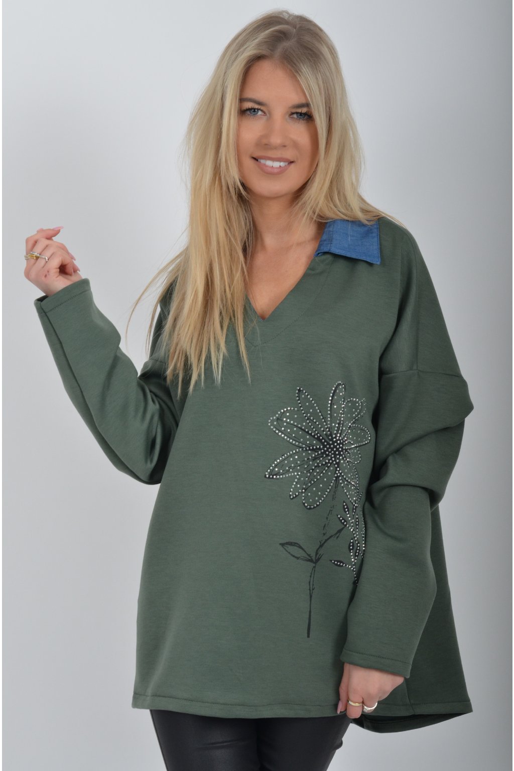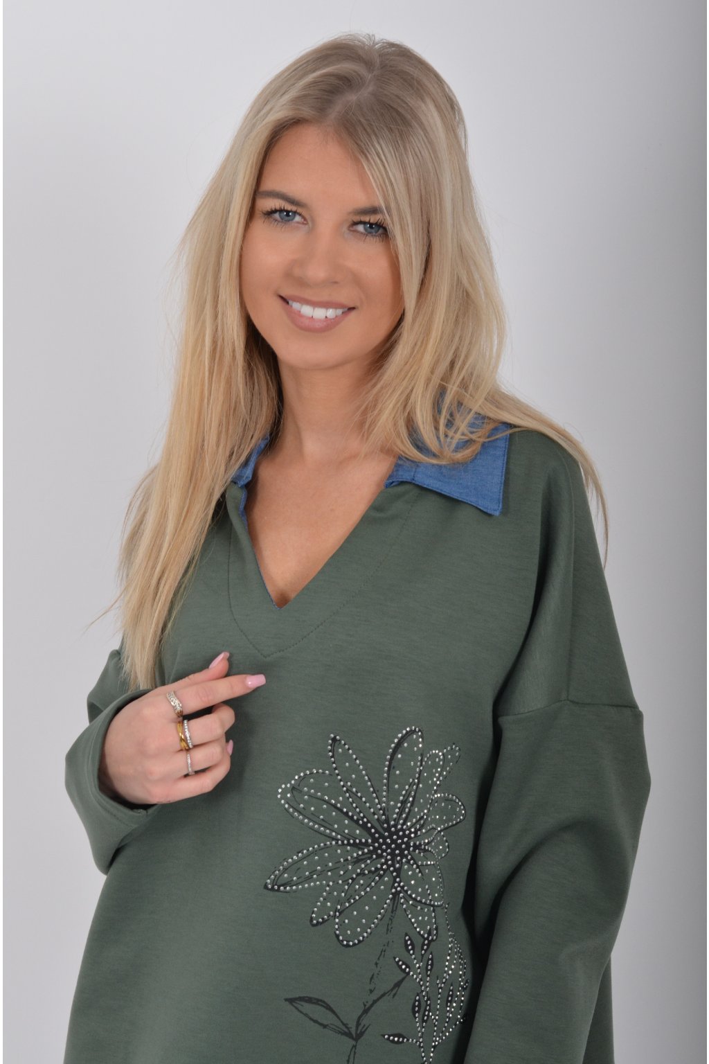 Halenka s dlouhým rukávem a modrým límečkem vyrobena z velice příjemného a jemného materiálu. V přední části má stříbrnou aplikaci.