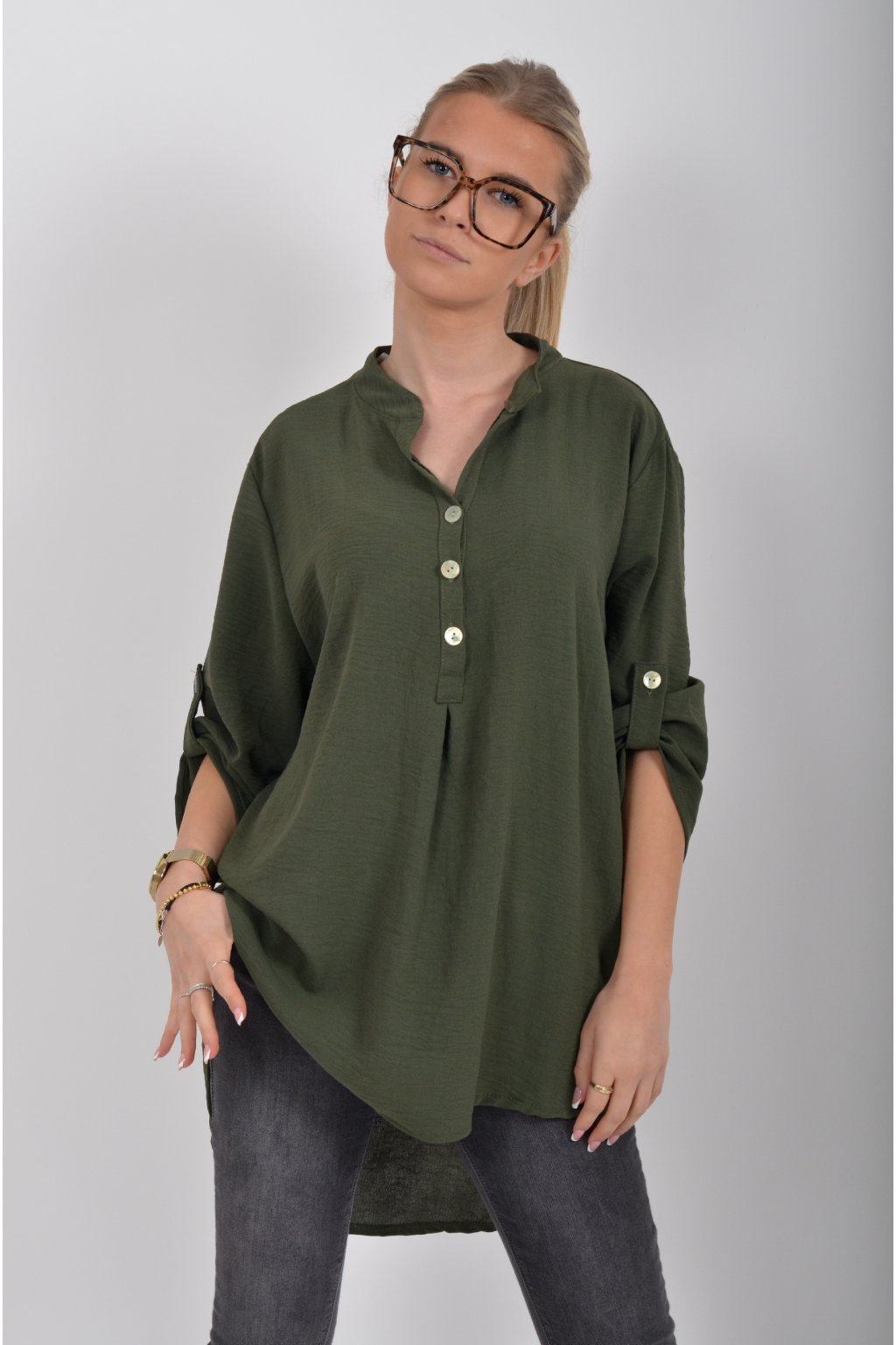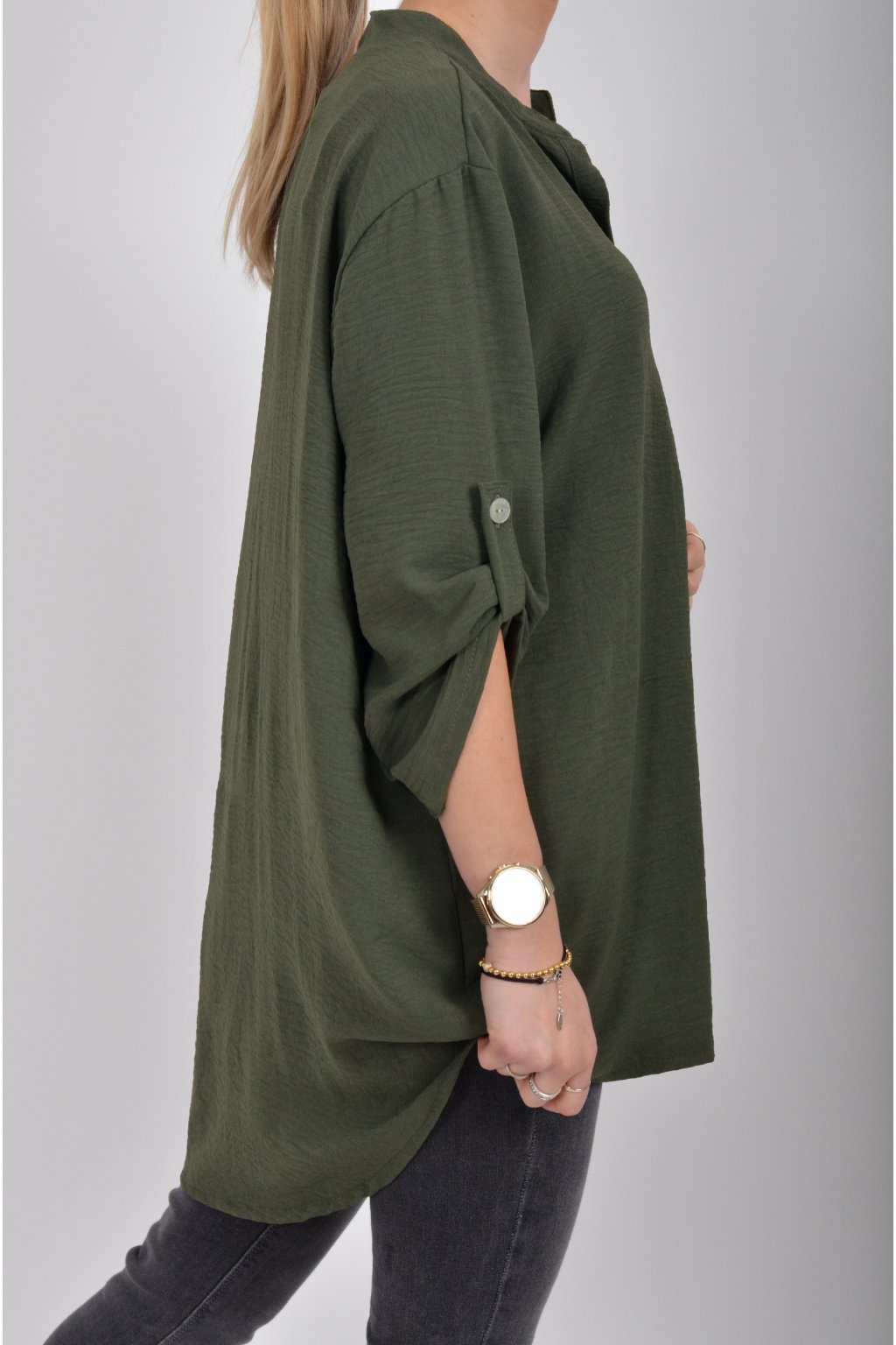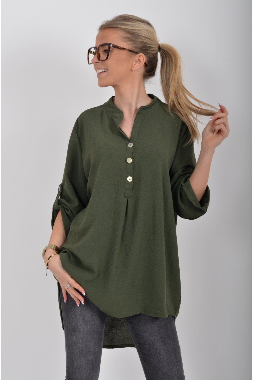 Halenka s tříčtvrtečním rukávem který lze pomocí knoflíku jednoduše zkrátit. Halenka má výstřih do V a zapínaní na tři knoflíky. Je vyrobena z příjemného a lehounkého materiálu. Zadní část halenky je delší než přední.