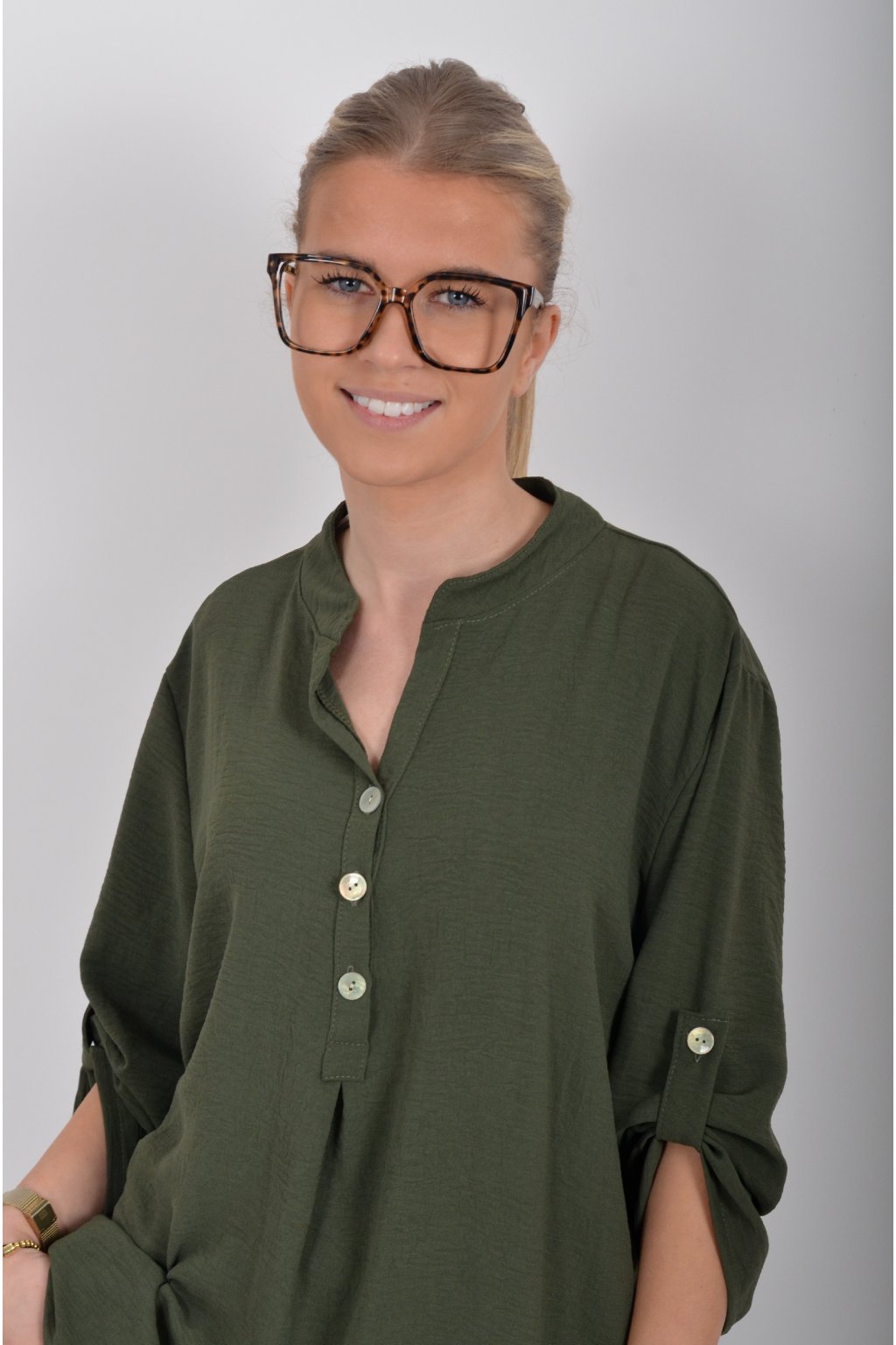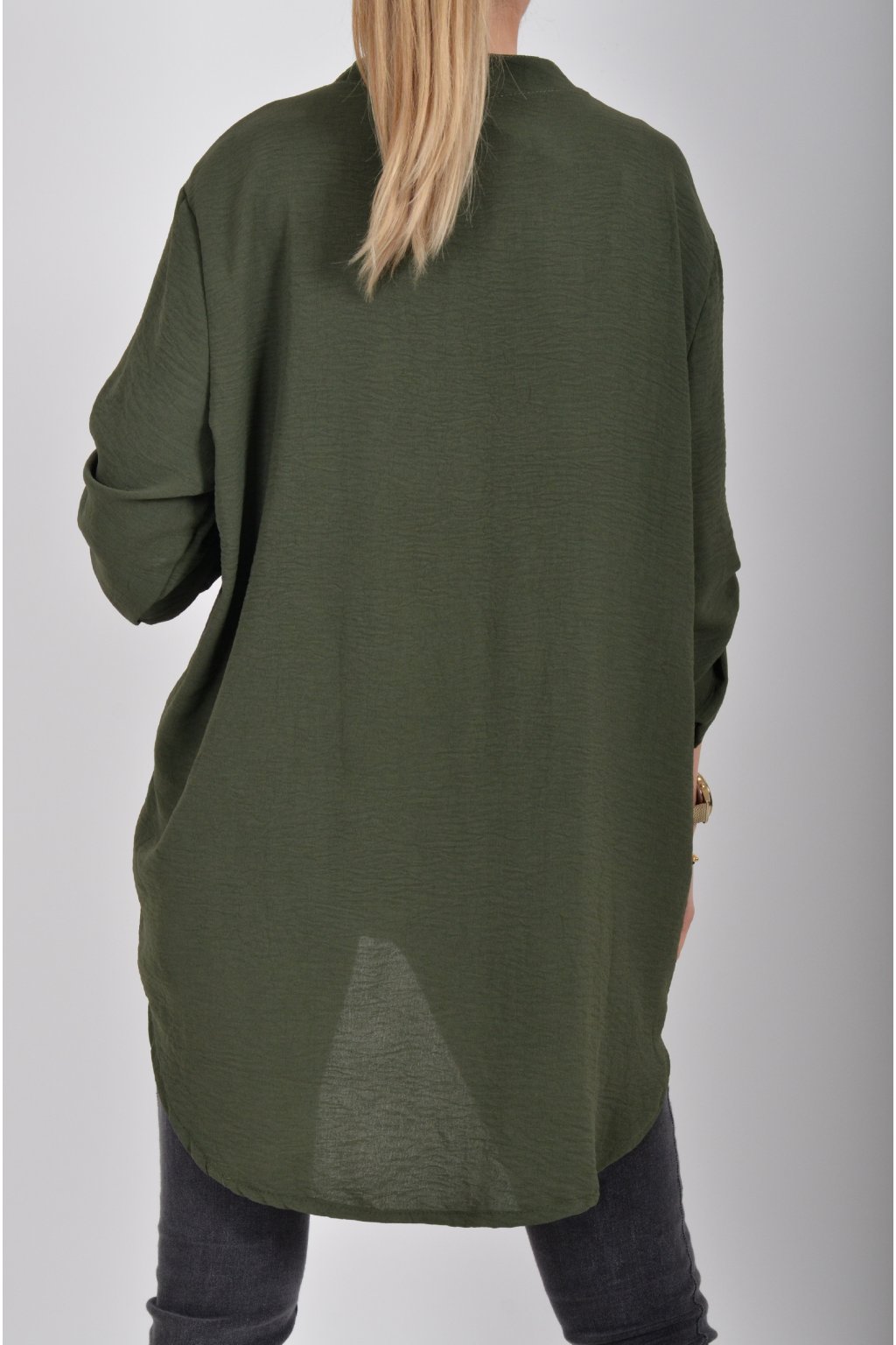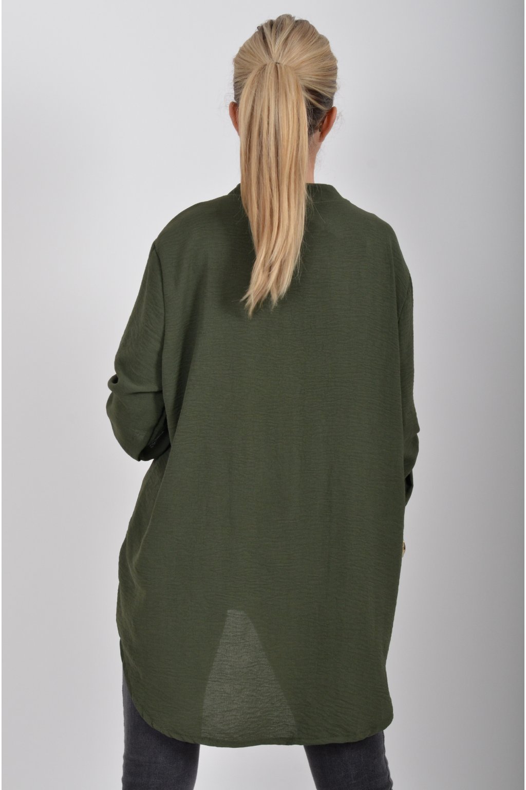 Halenka s tříčtvrtečním rukávem který lze pomocí knoflíku jednoduše zkrátit. Halenka má výstřih do V a zapínaní na tři knoflíky. Je vyrobena z příjemného a lehounkého materiálu. Zadní část halenky je delší než přední.