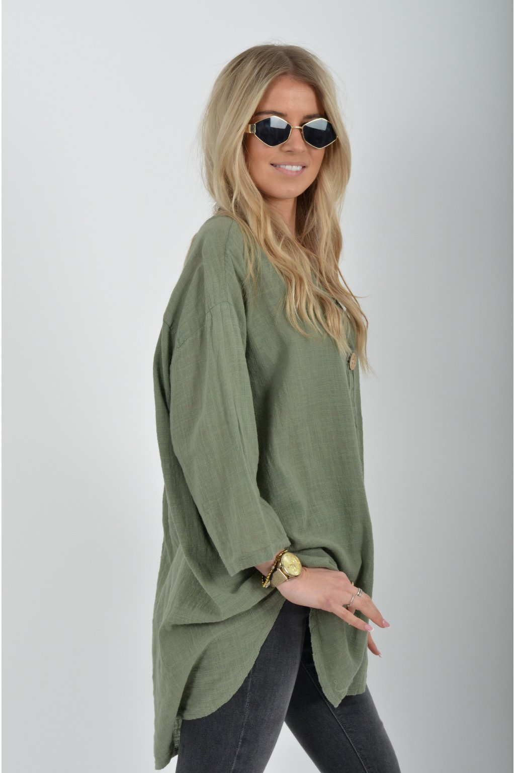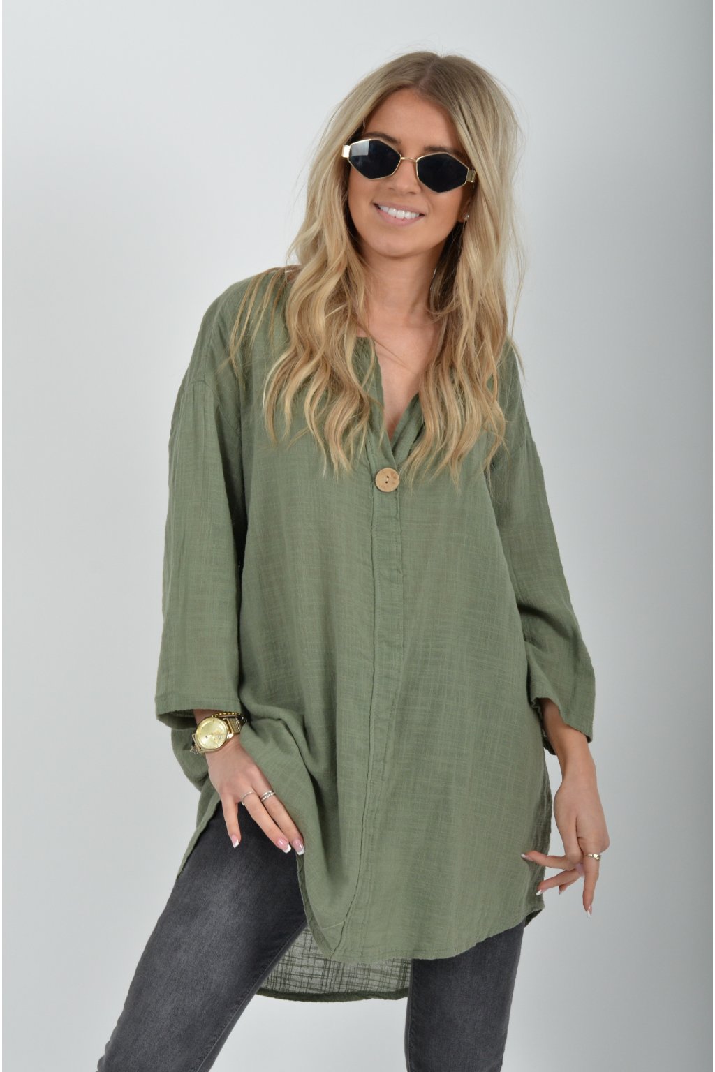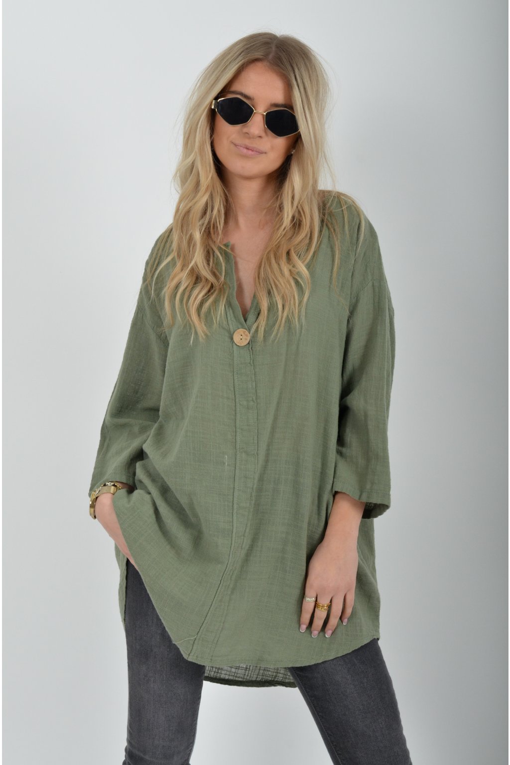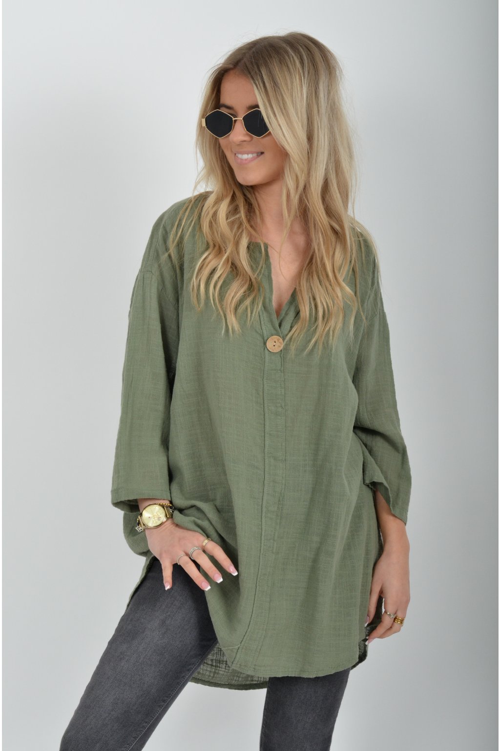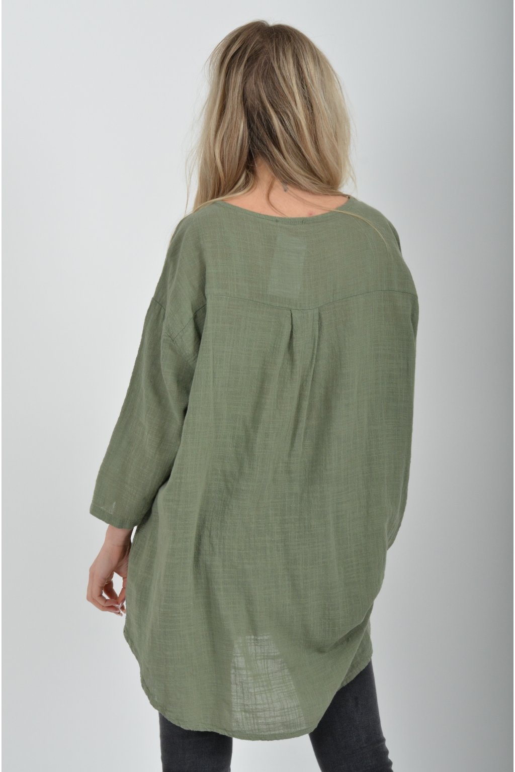 Bavlněné halenka s tříčtvrtečním rukávem. Halenka má výstřih do V a ozdobný knoflík. Je vyrobena z příjemného a lehounkého materiálu. Zadní část halenky je delší než přední.