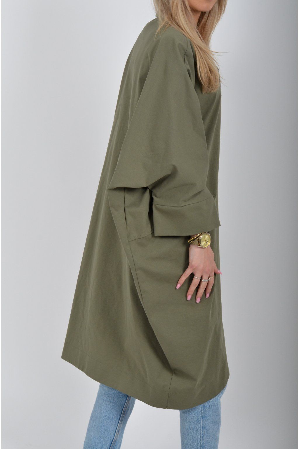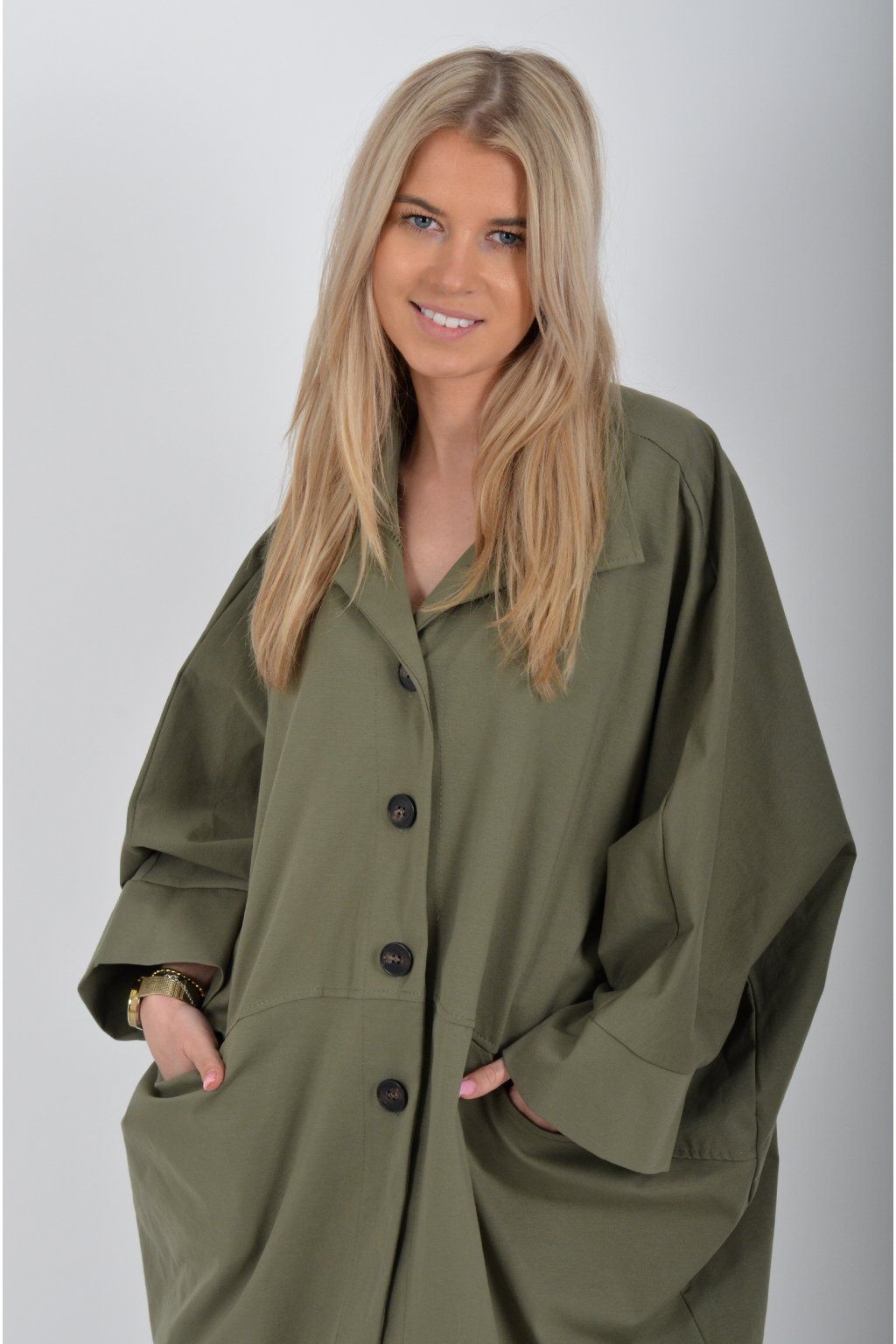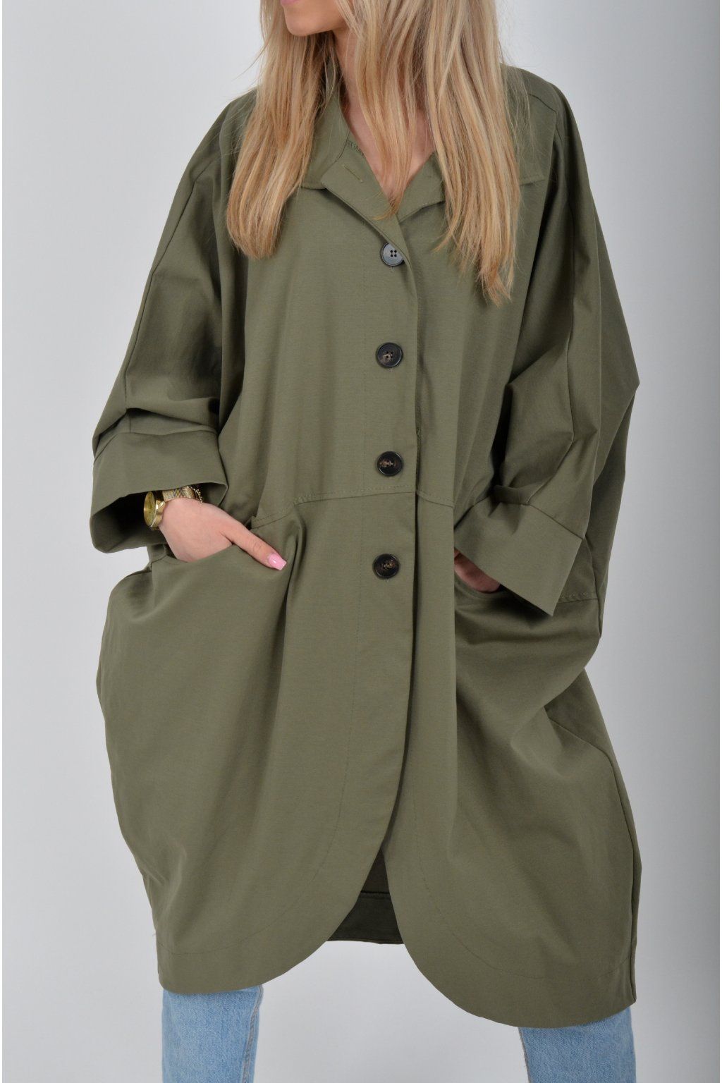 Pohodlný oversize jarní kabátek ušitý z pružného příjemného materiálu. Kabátek má límec, zapínaní na knoflíky a je balónového střihu. V přední části má kapsy a rukávy jsou tříčtvrteční.