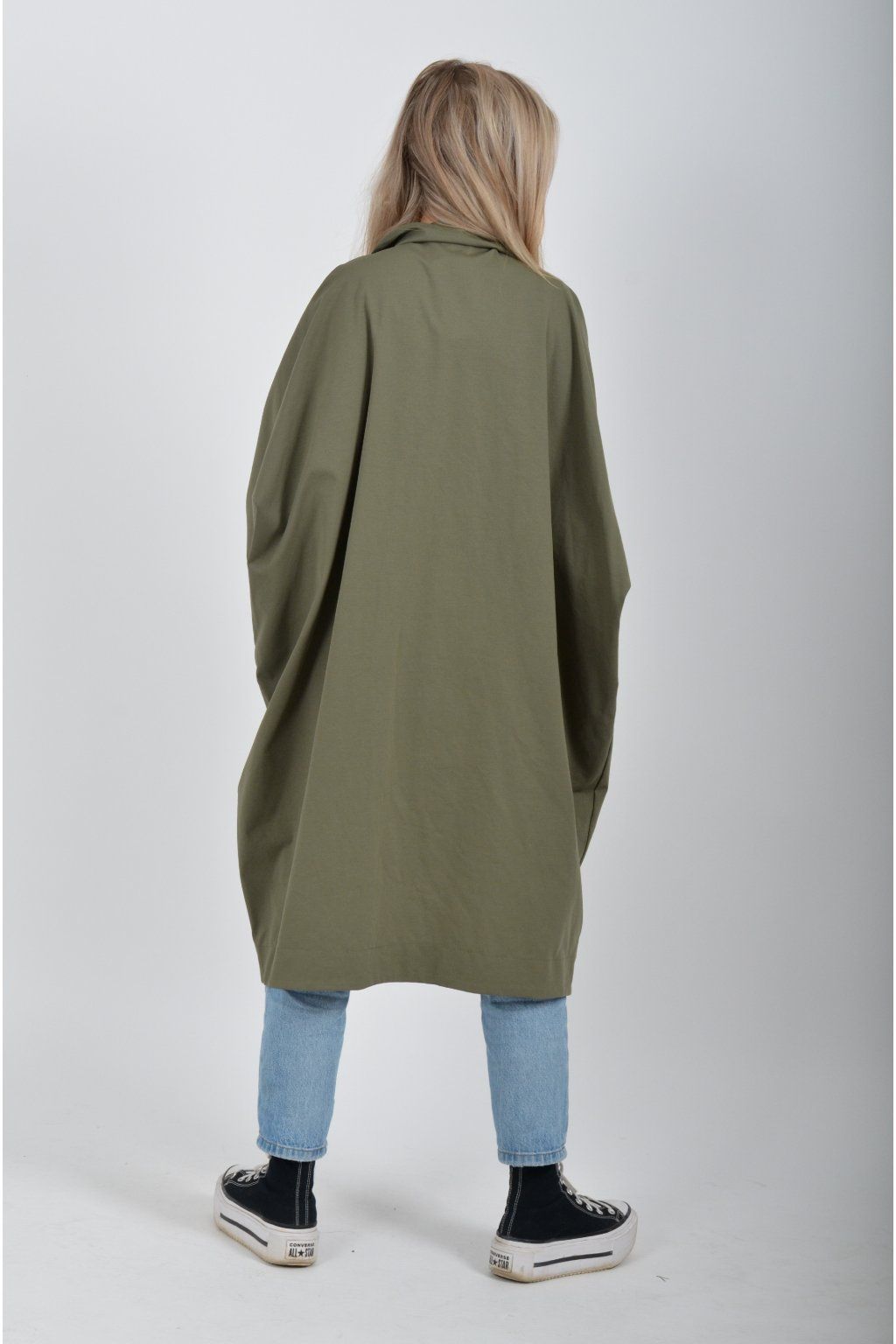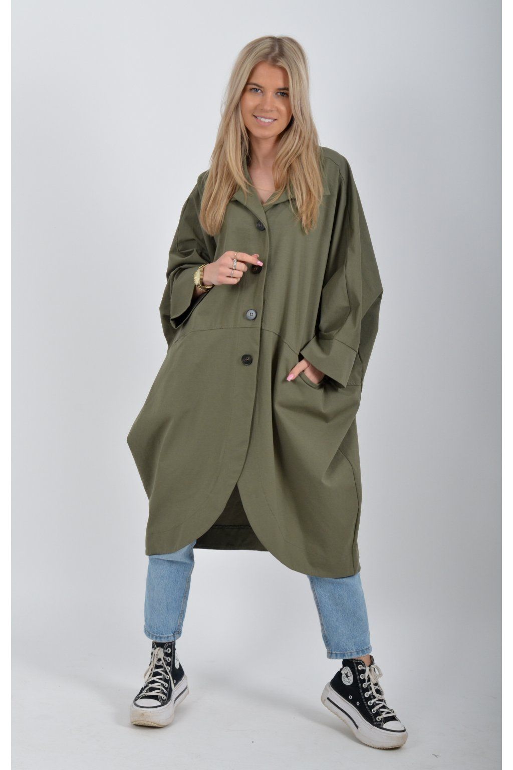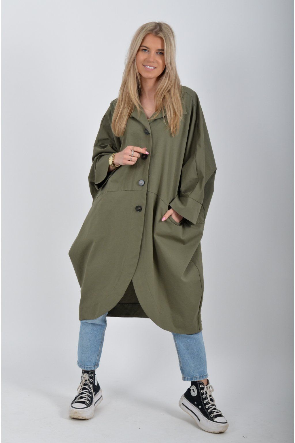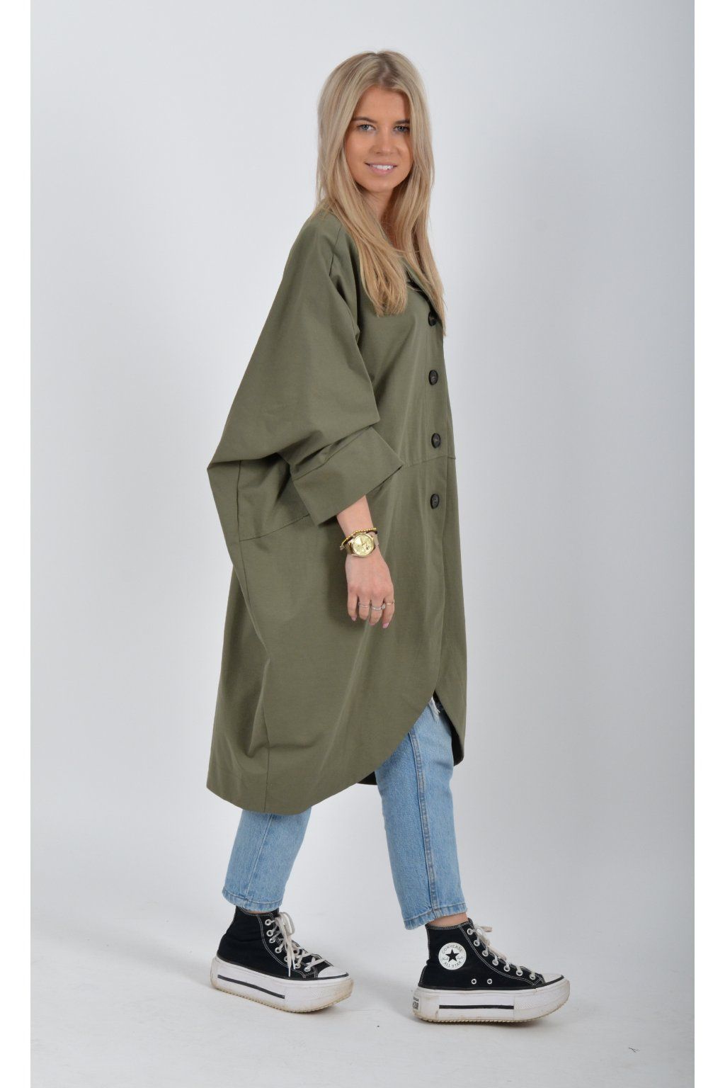 Pohodlný oversize jarní kabátek ušitý z pružného příjemného materiálu. Kabátek má límec, zapínaní na knoflíky a je balónového střihu. V přední části má kapsy a rukávy jsou tříčtvrteční.