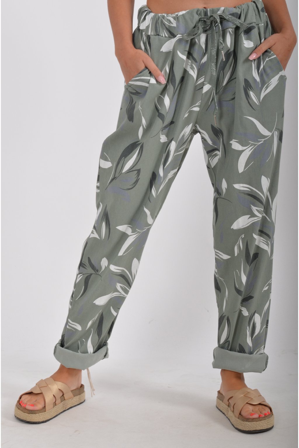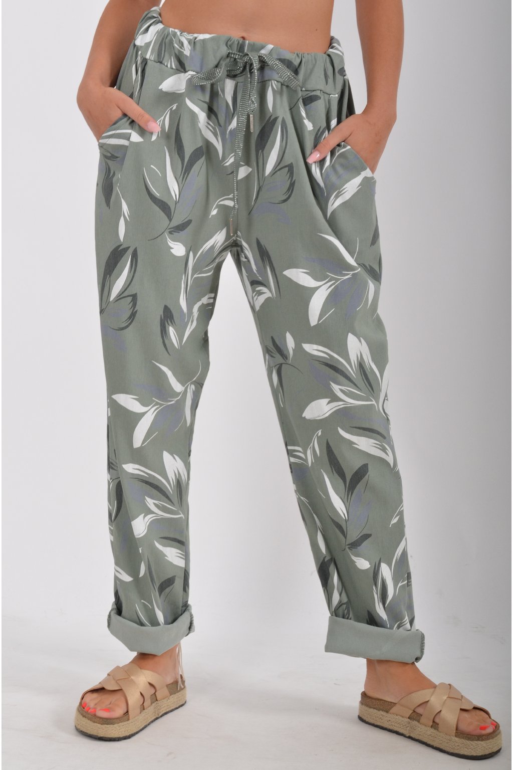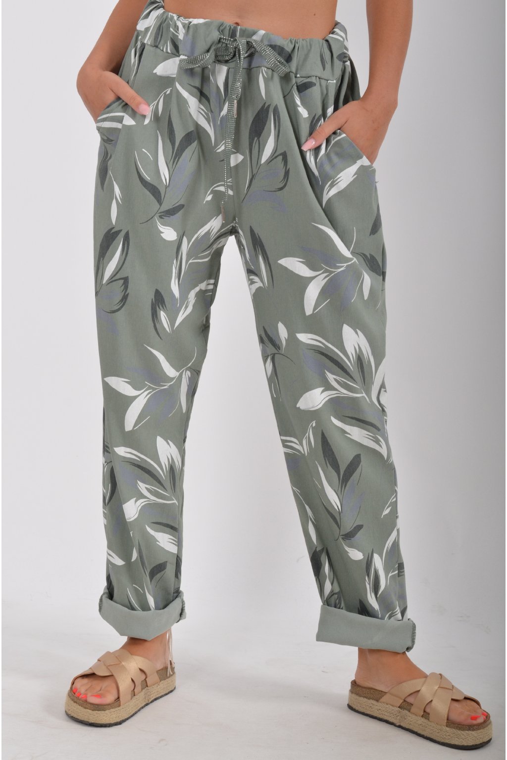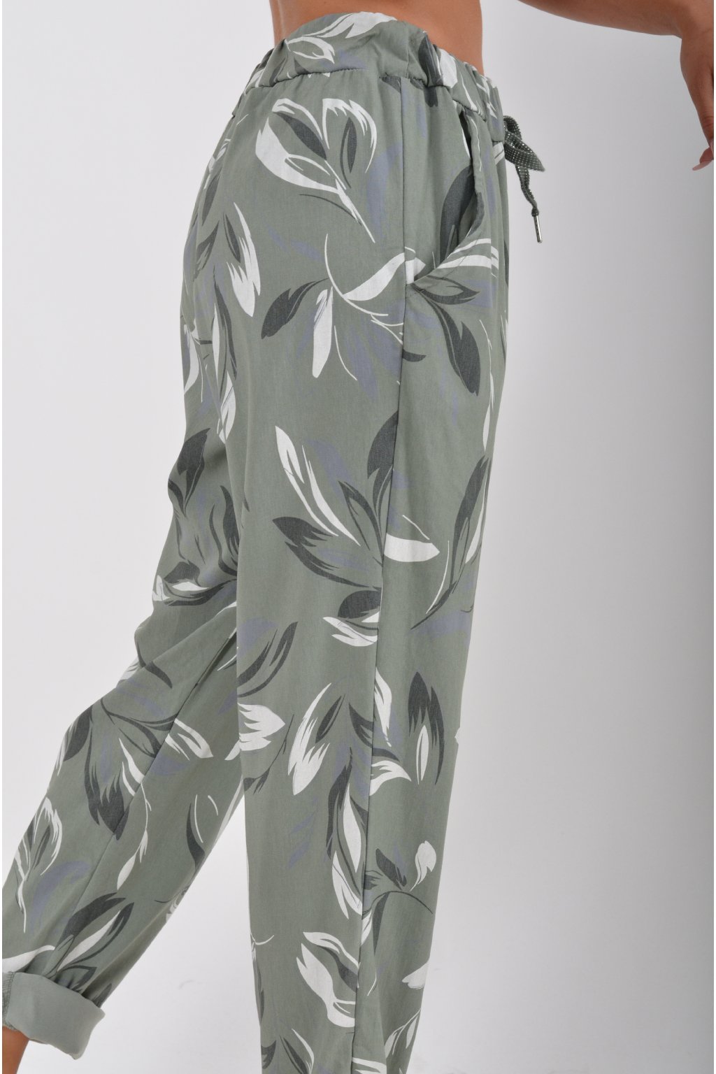 Vzorované kalhoty s kapsami na bocích, které se krásně přizpůsobí postavě, díky podílu elastanu. Jsou vhodné pro každodenní nošení. V pase je zapracovaná guma a tkanička pro libovolné stažení.