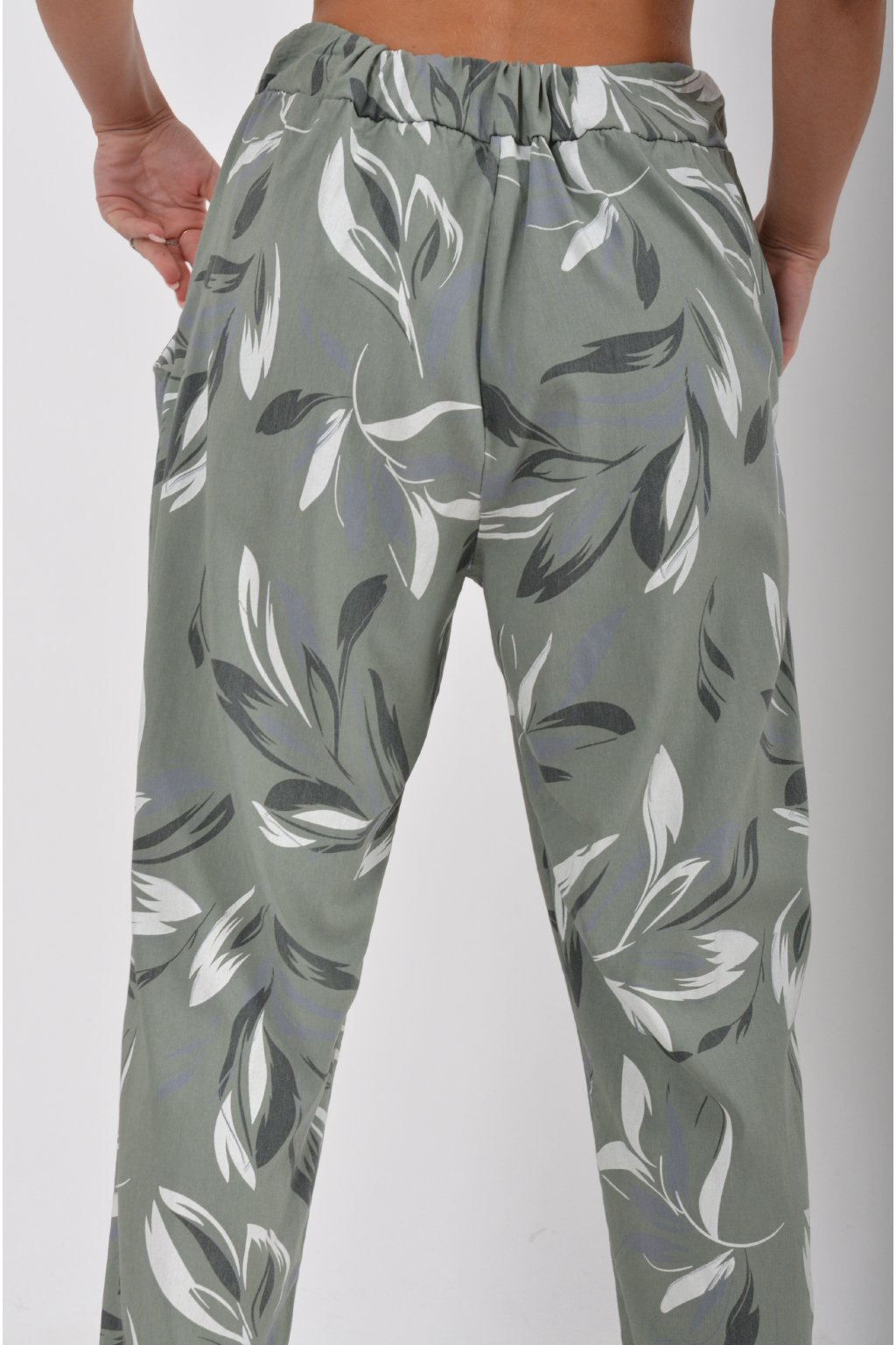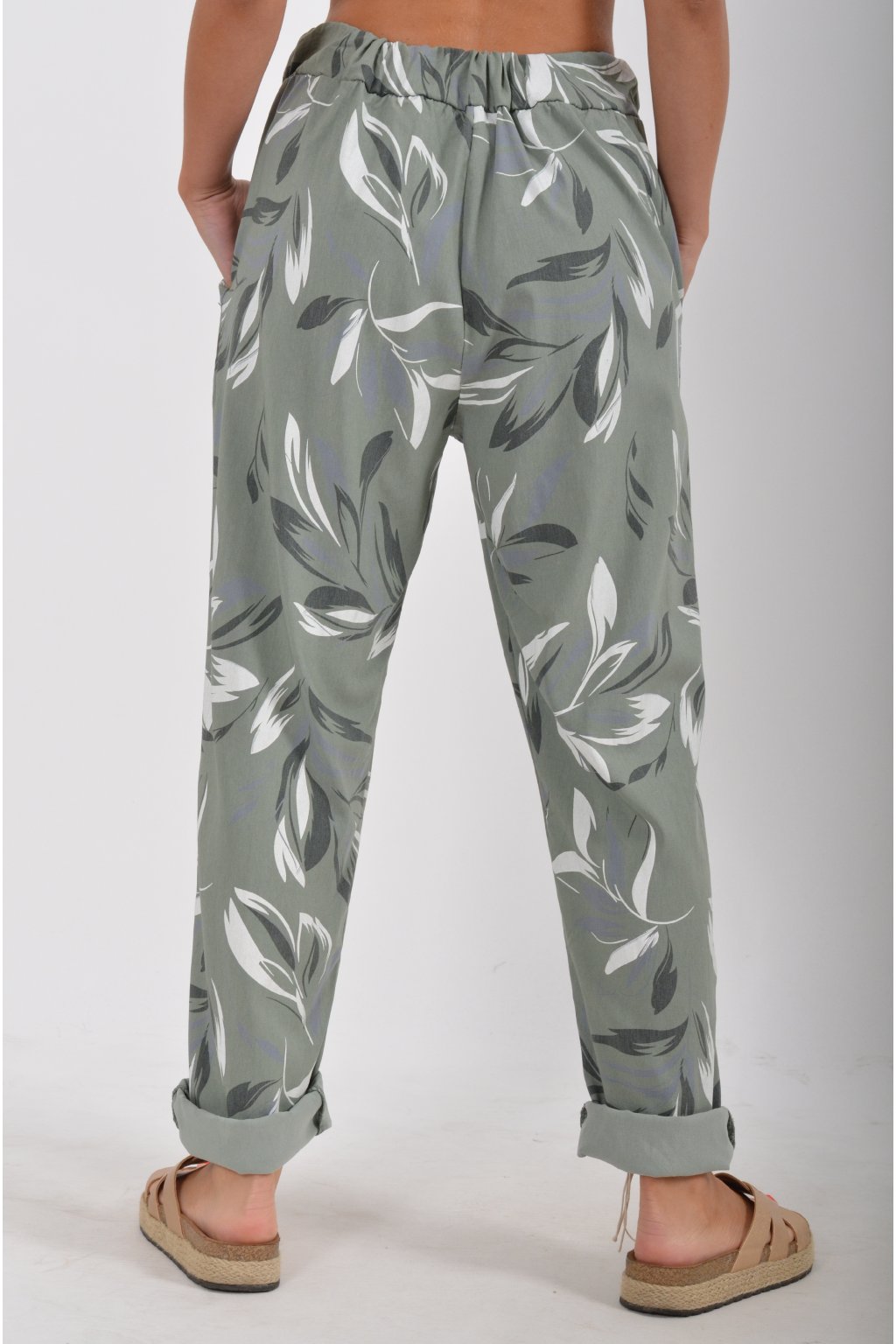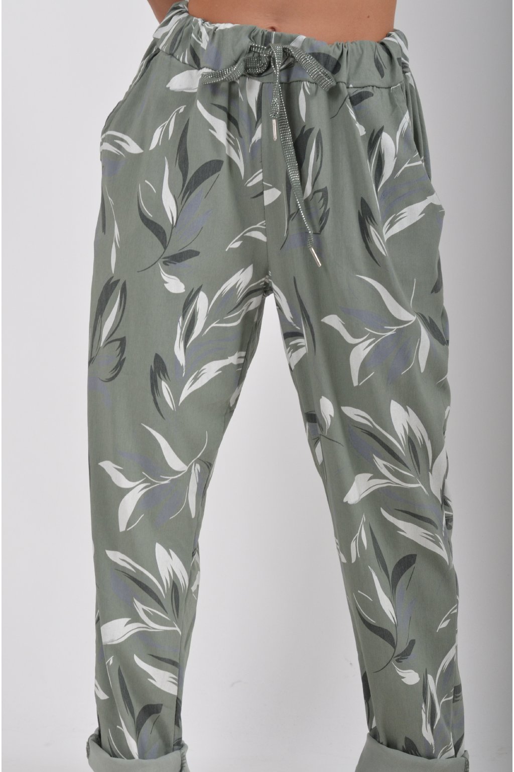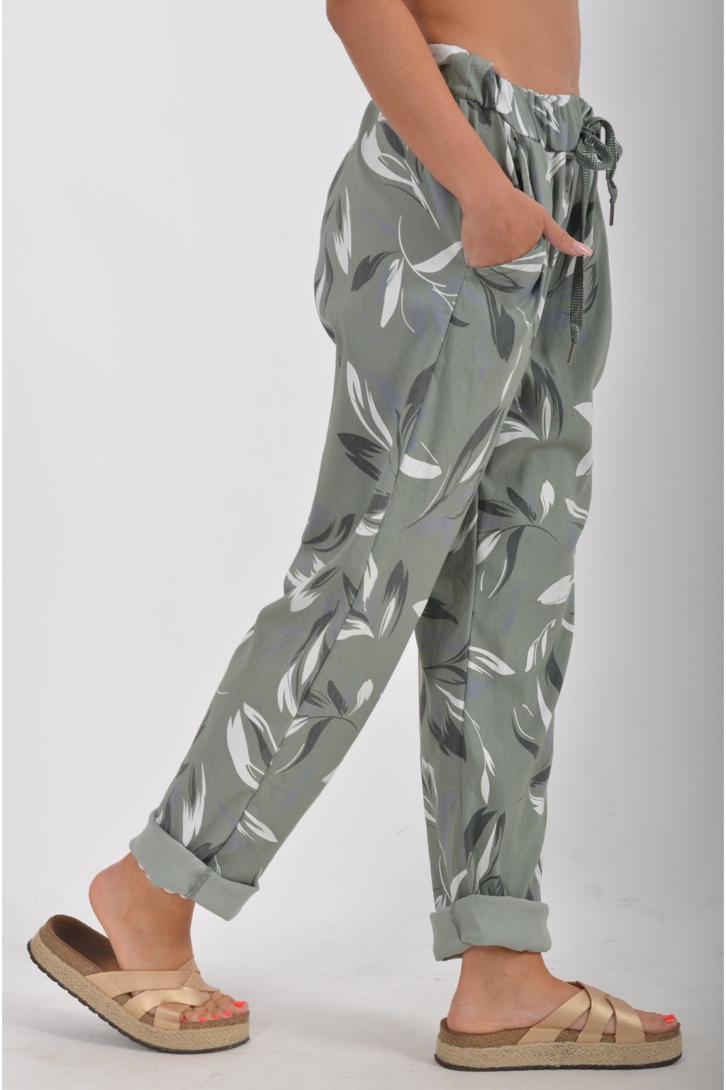 Vzorované kalhoty s kapsami na bocích, které se krásně přizpůsobí postavě, díky podílu elastanu. Jsou vhodné pro každodenní nošení. V pase je zapracovaná guma a tkanička pro libovolné stažení.