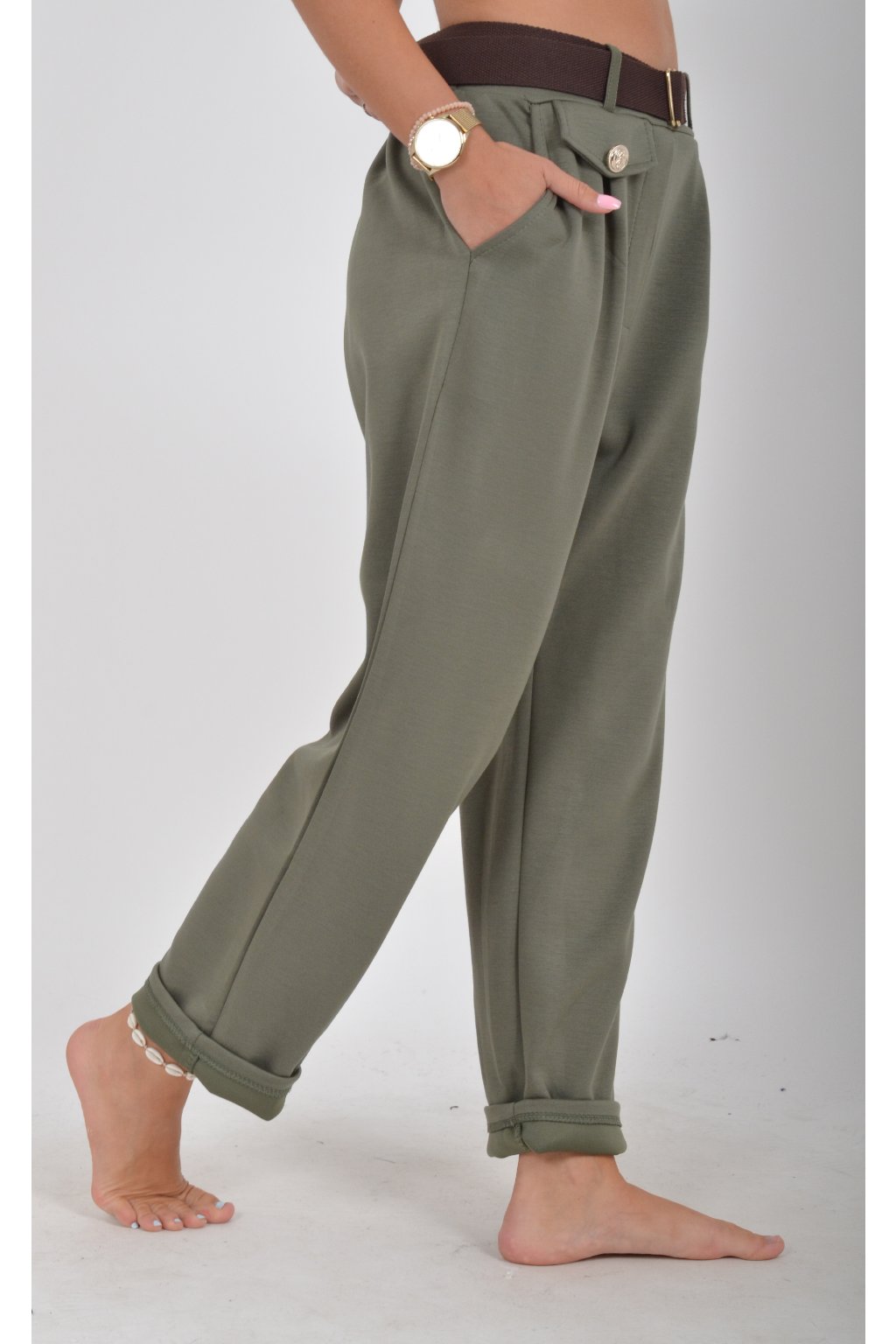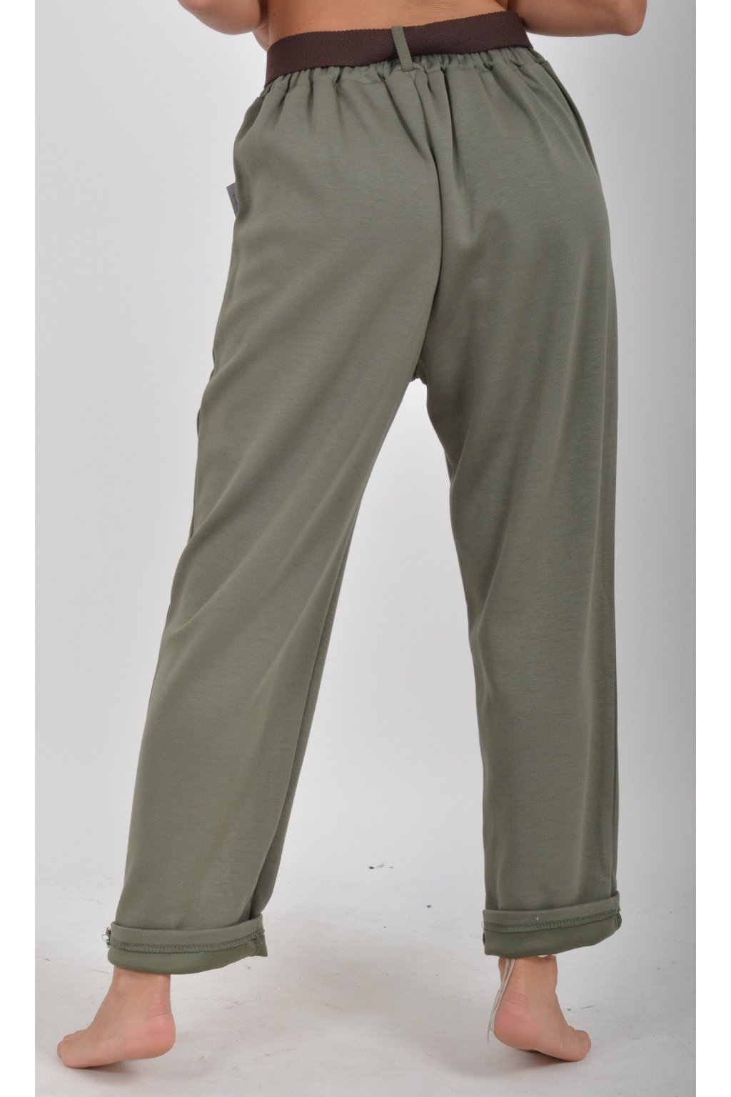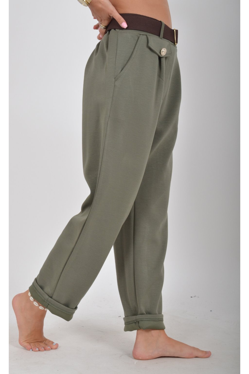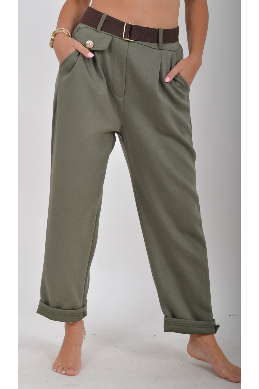 Elegantní kalhoty teplákového stylu s kapsami na bocích. V pase je zapracovaná guma a součástí kalhot je pásek pro libovolné stažení. Kalhoty jsou z velice příjemného materiálu a jsou vhodné pro každodenní nošení.