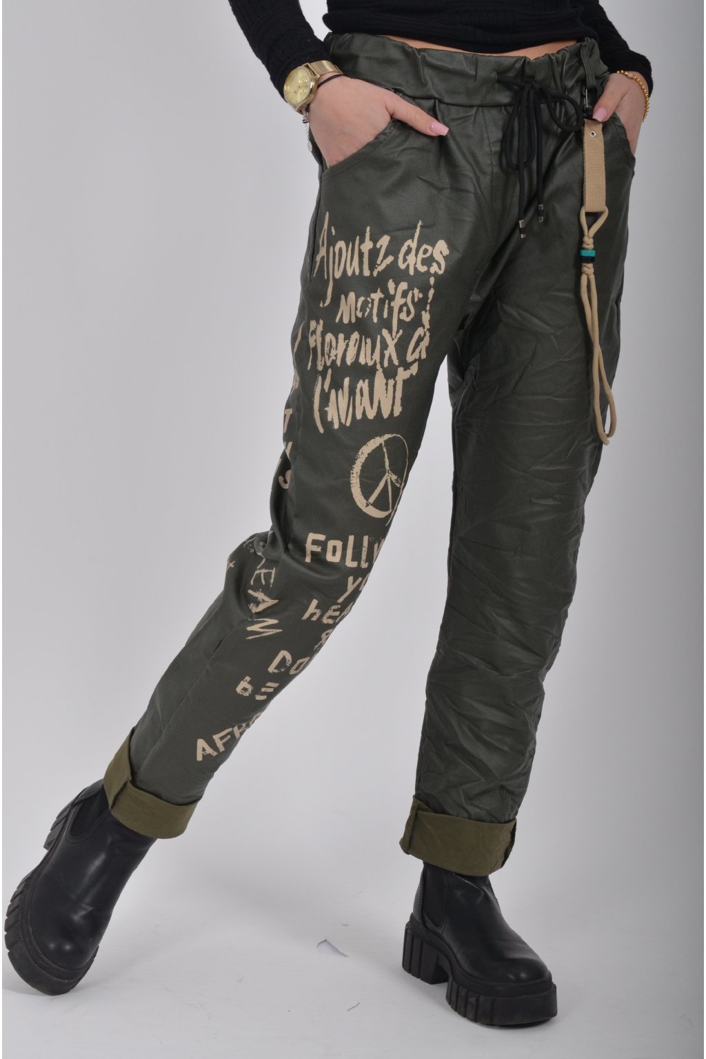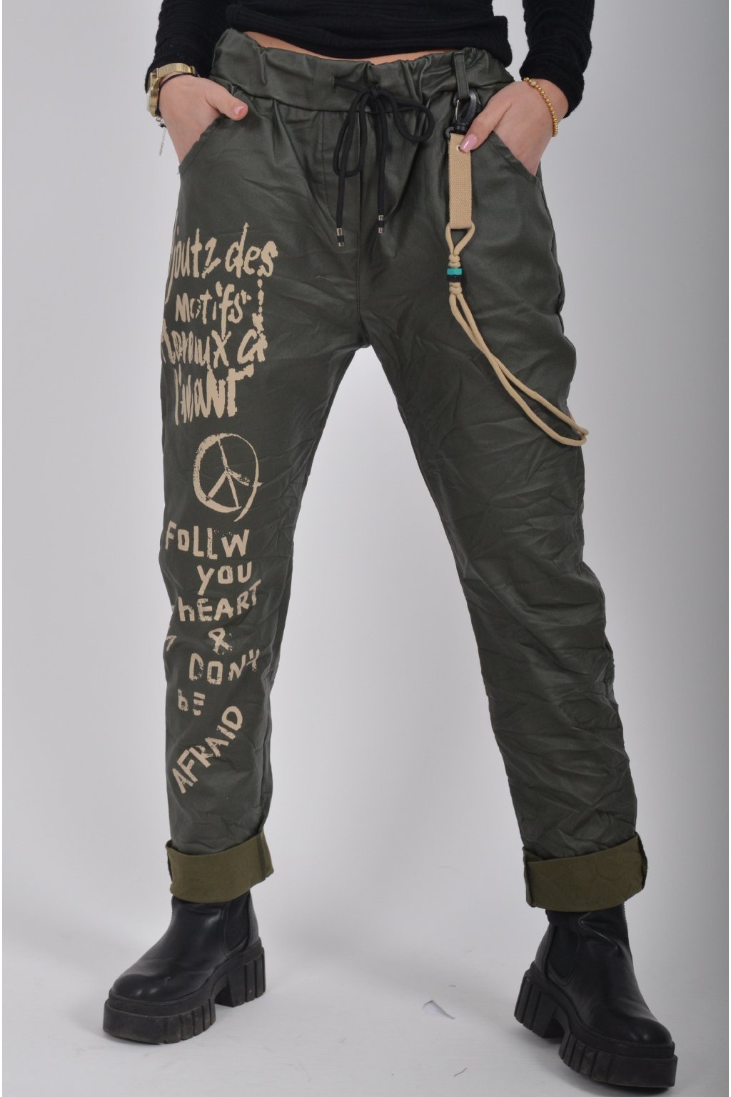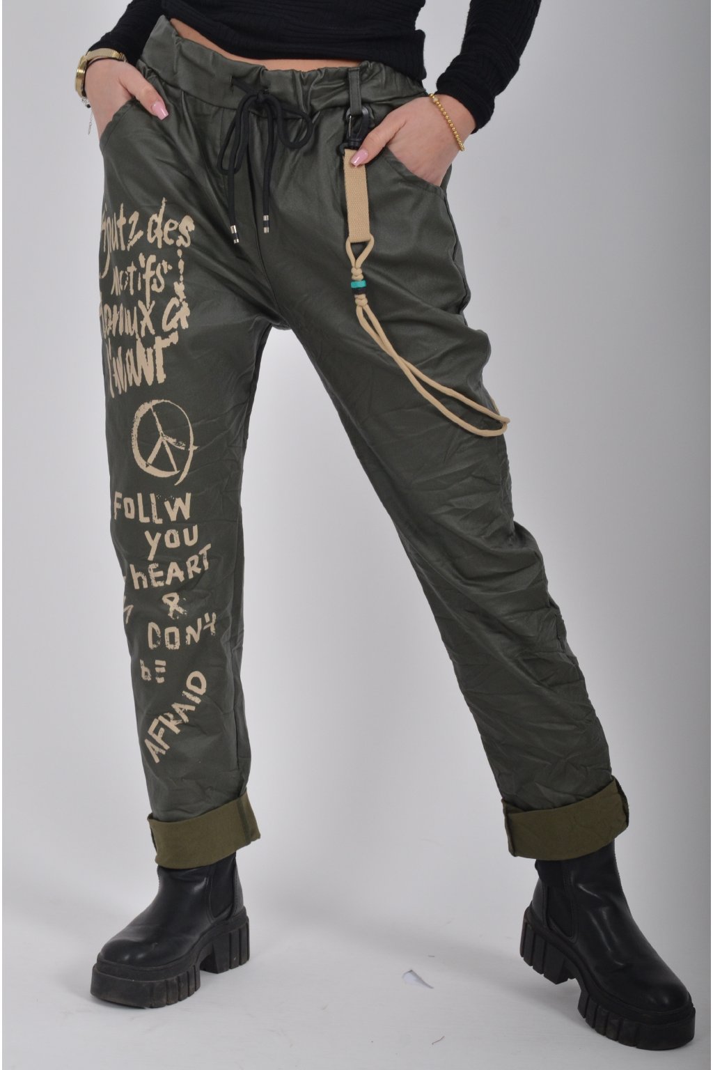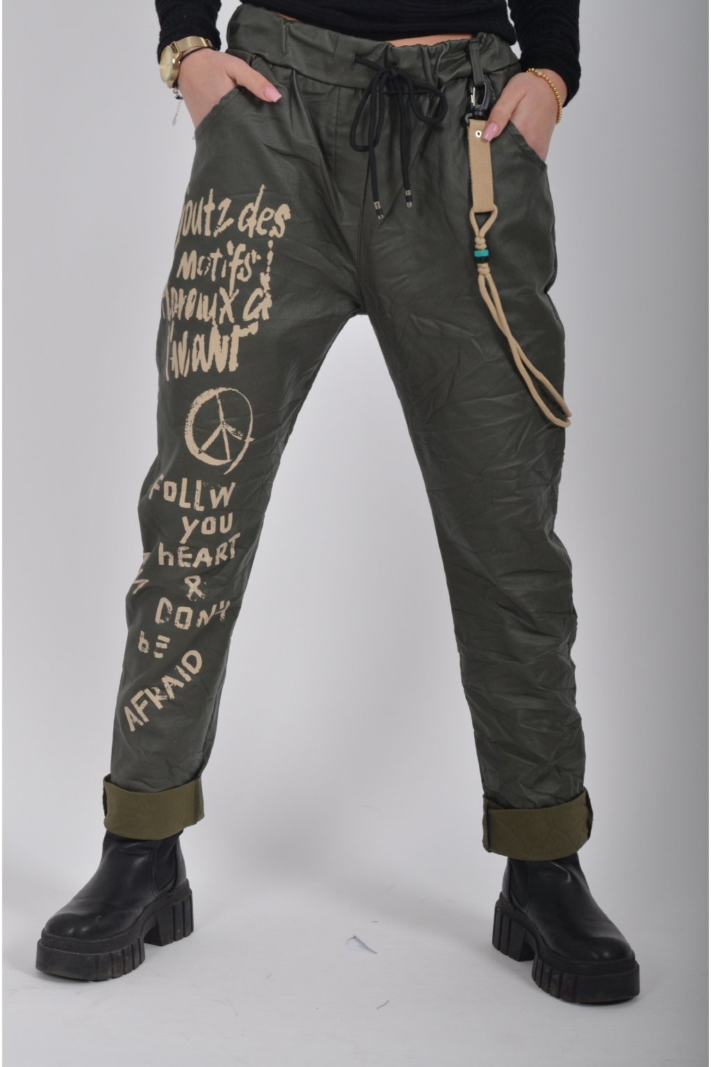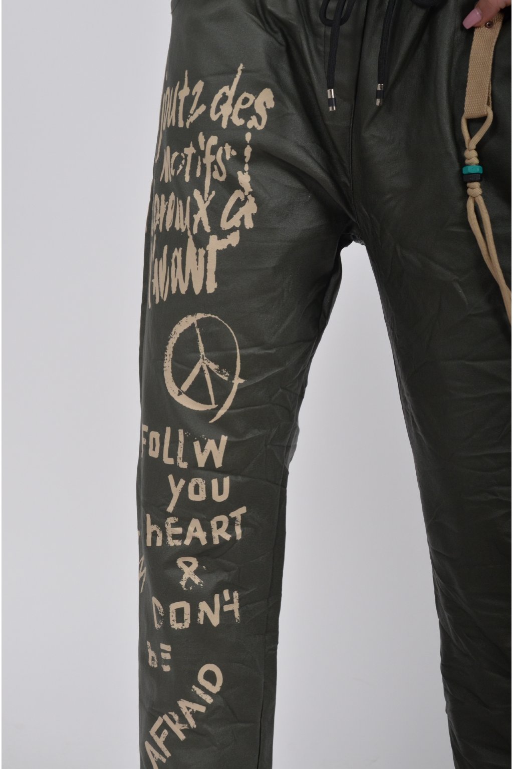 Jednobarevné koženkové kalhoty s kapsami na bocích, které se krásně přizpůsobí postavě, díky podílu elastanu. Jsou vhodné pro každodenní nošení. V pase je zapracovaná guma a tkanička pro libovolné stažení.