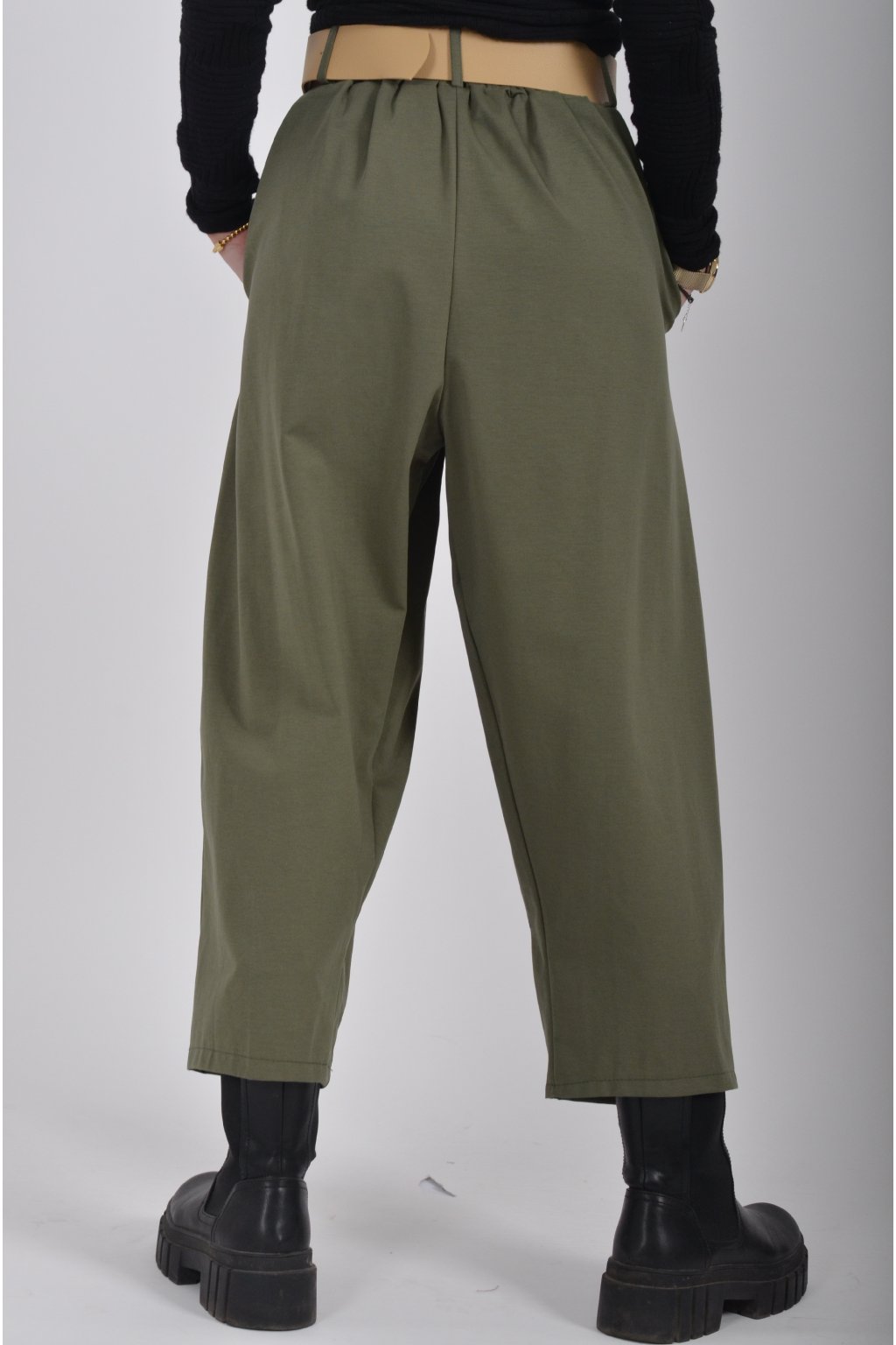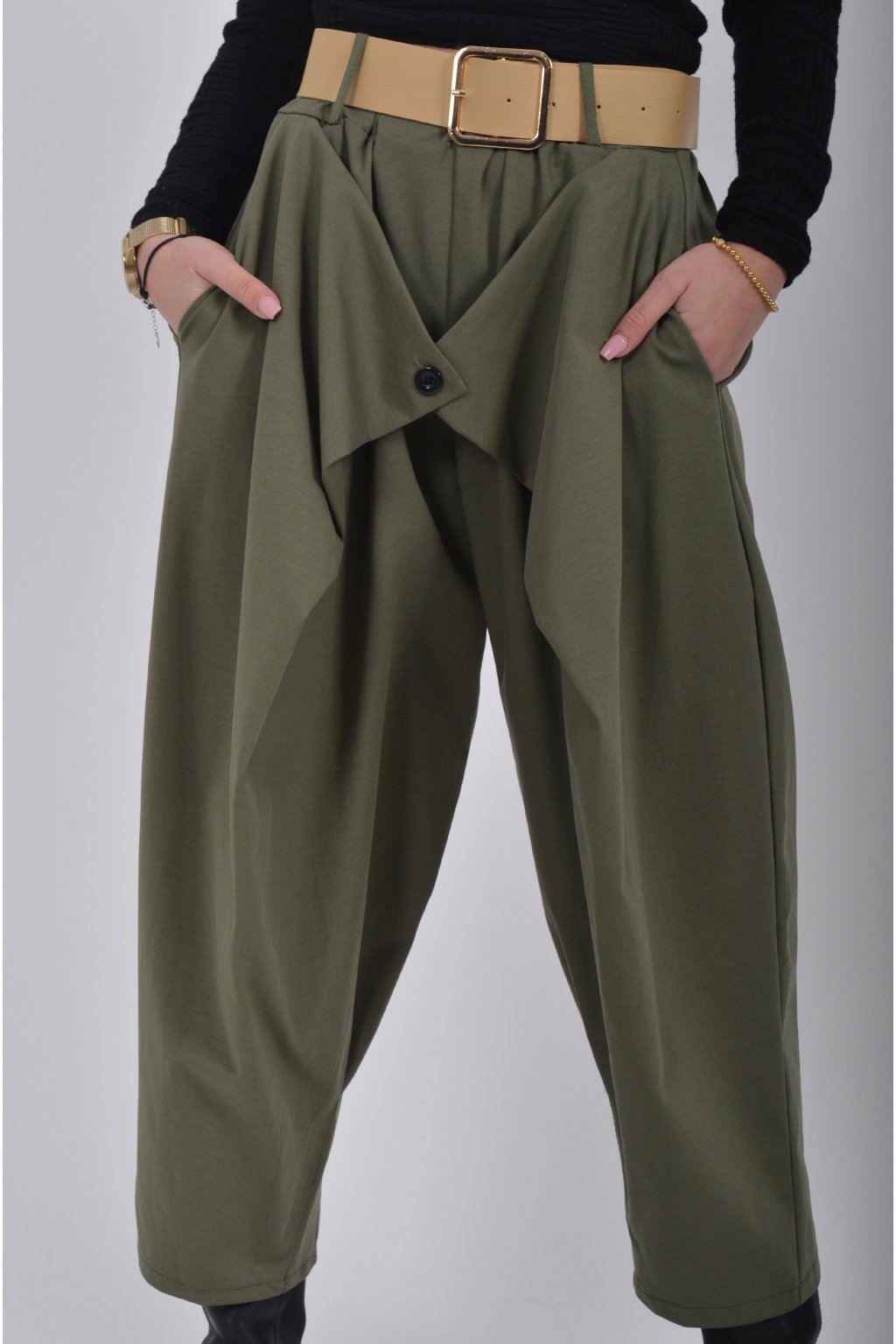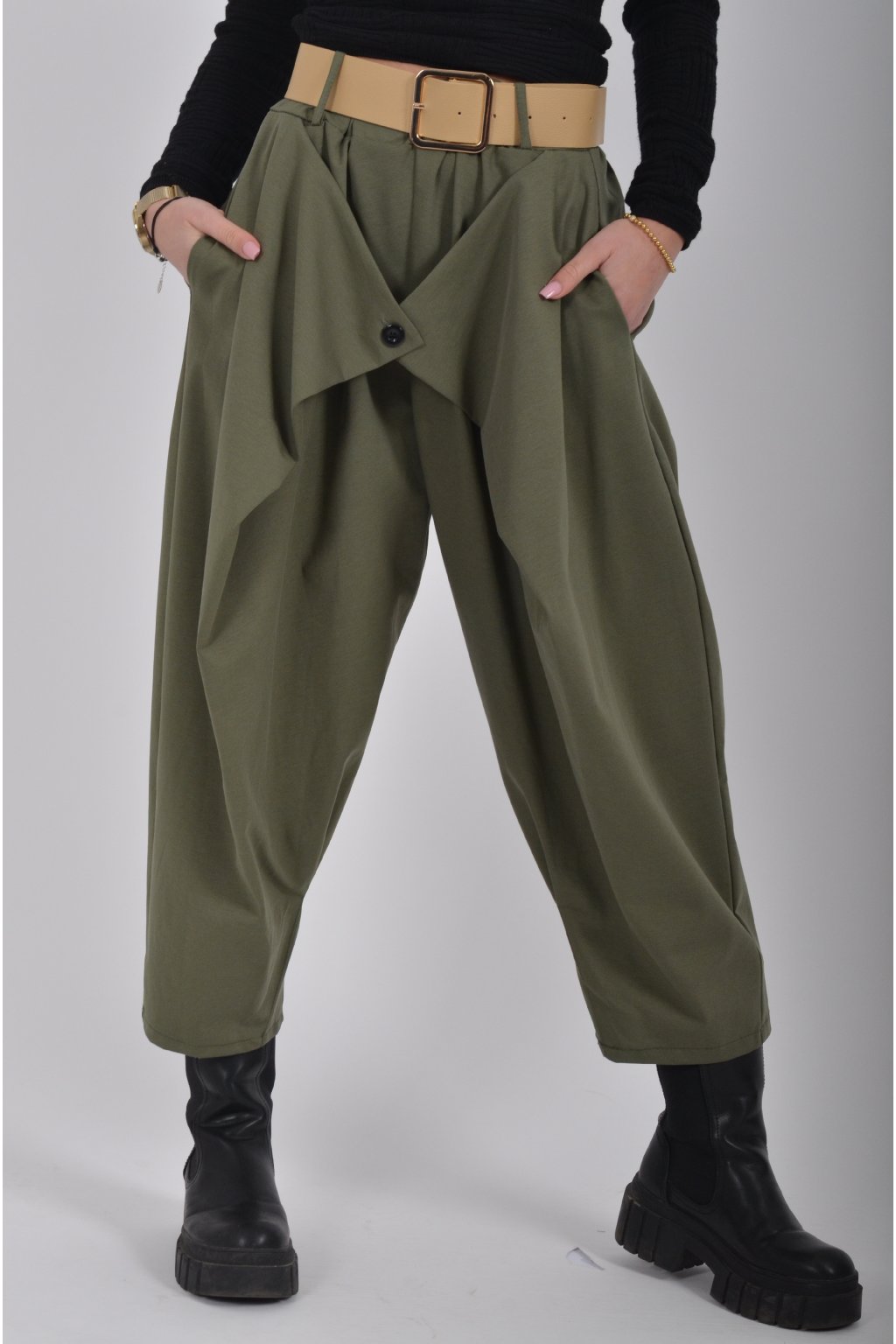 Jednobarevné kalhoty s překříženým pasem a kapsami na bocích. Krásně přizpůsobí postavě, díky podílu elastanu. Jsou vhodné pro každodenní nošení. V pase je zapracovaná guma. Ke kalhotám je jako dárek koženkový pásek, který lze odejmout a nosit na jiných kalhotách.